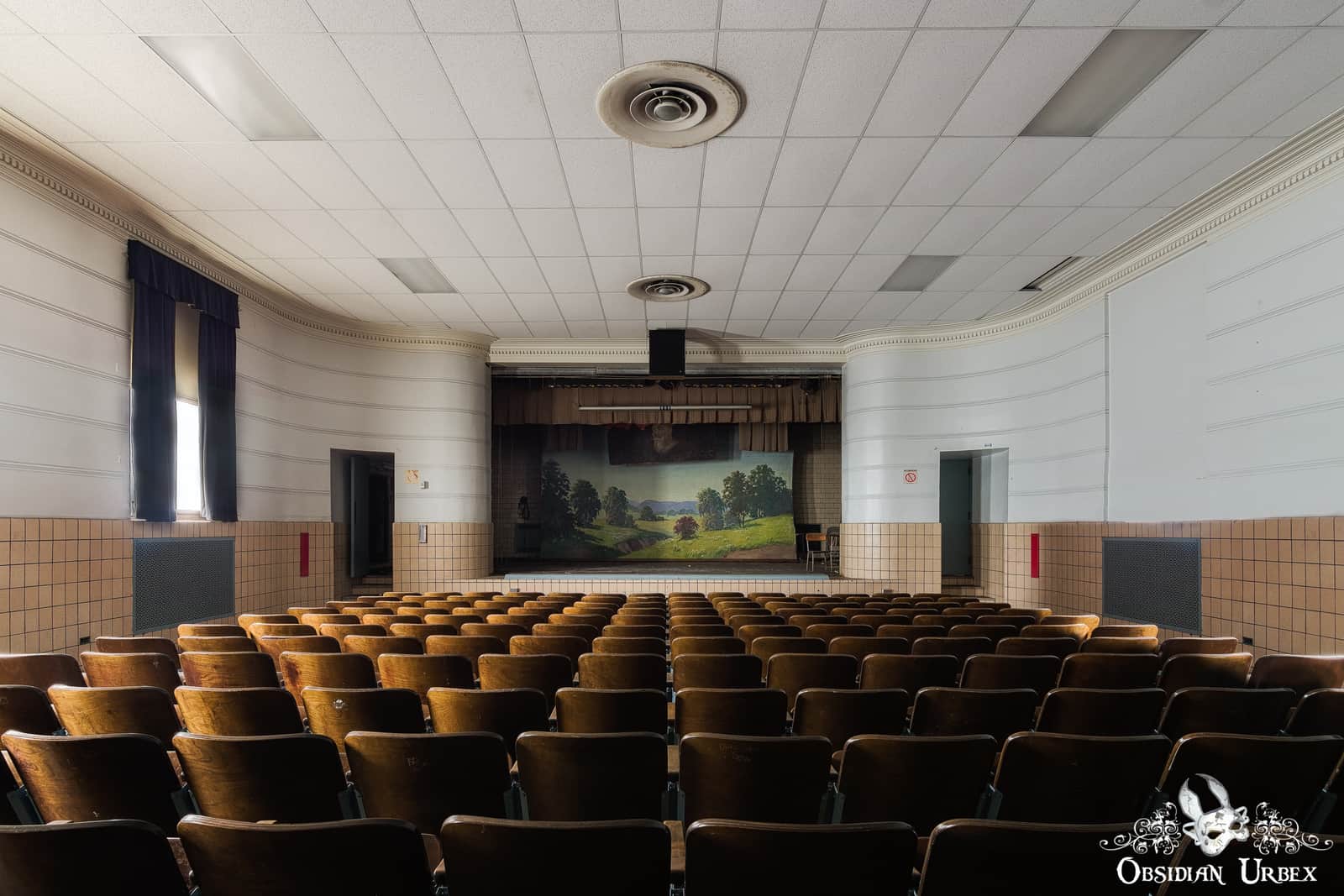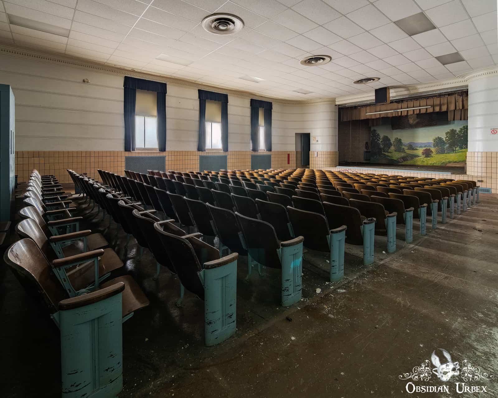 The school is remarkably well-preserved, and almost entirely free of graffiti. There are many long, dark corridors lined with grey or blue lockers. Numerous classrooms lead off from these corridors, most are bare and relatively unphotogenic. On the lower floors, peeling paint hangs from the ceilings and lays scattered on the