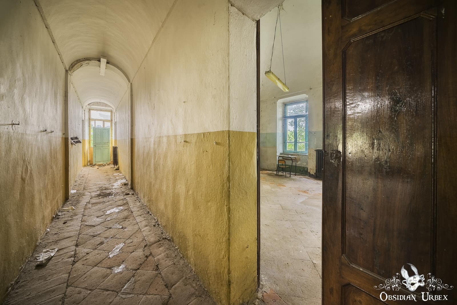 Most of the school is empty rooms, or ransacked rooms littered with loose paper and paraphernalia. In fact, most people only ever photograph the main classroom area on the top floor. This classroom is indeed beautiful, with its detailed ceiling frescoes and cute children’s desks. During my visit in 2022, I was lucky enough to have a relaxed schedule on this day. I decided to search the school for other shots; there must be other interesting things to document here. The overturned, chaotic rooms weren’t of interest to me, so I pressed on. walking every corridor systematically, and opening every door to glance inside.