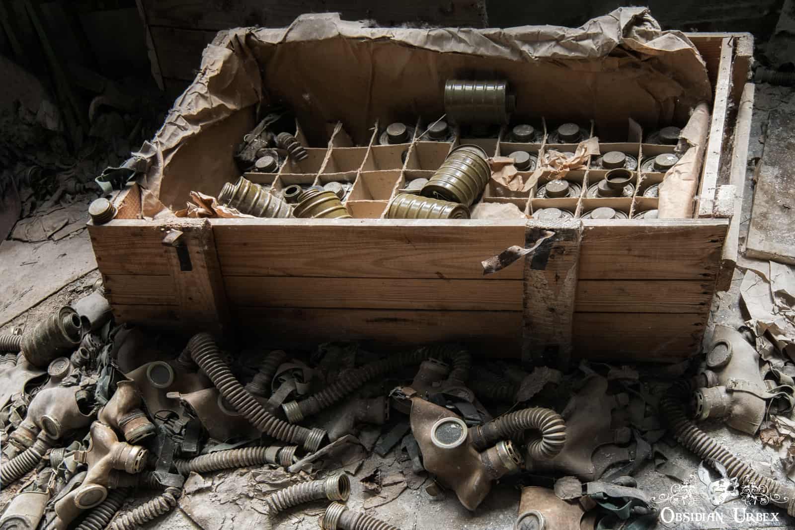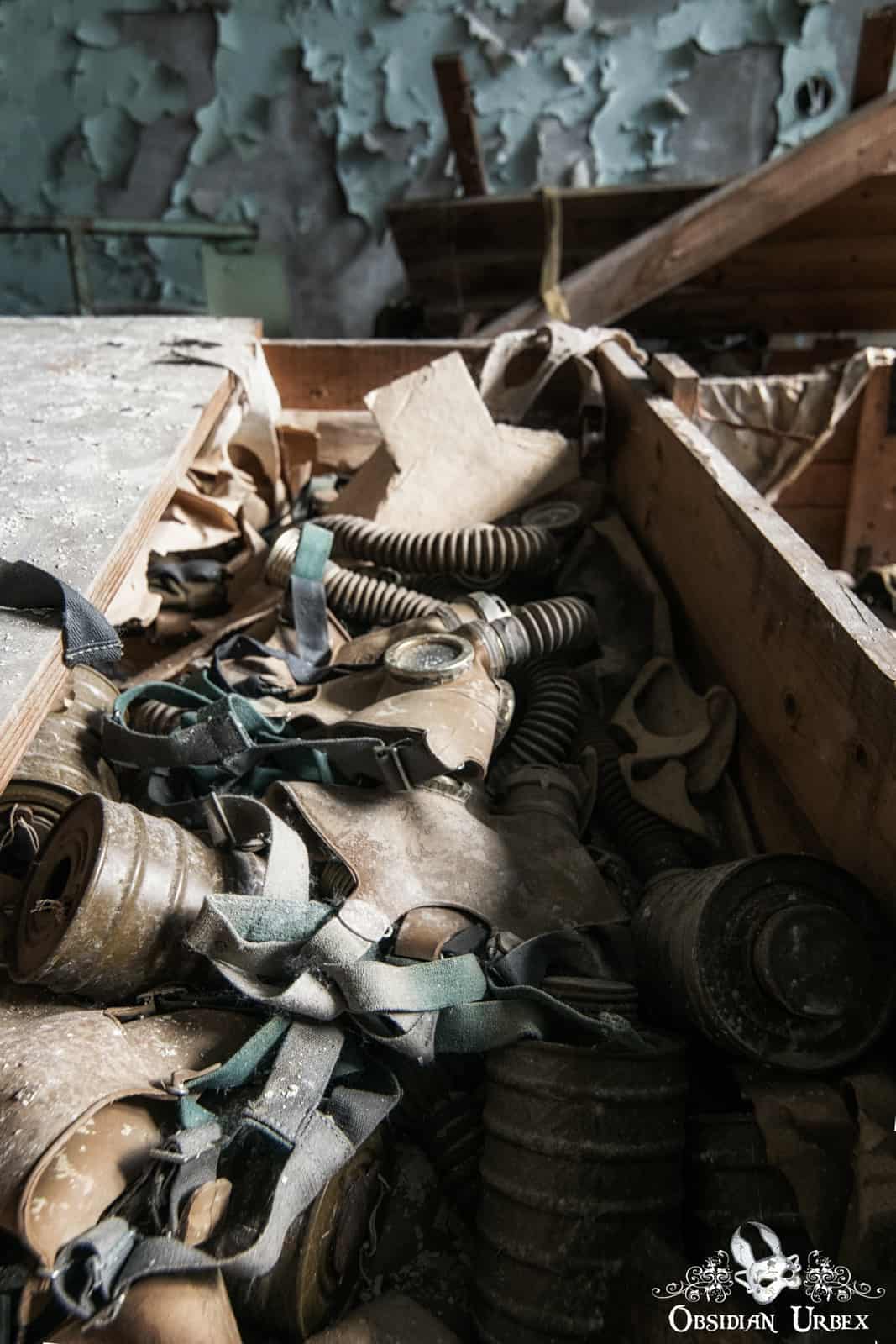 The floors of the side rooms and halls of Pripyat Middle School No. 3 are littered with crates, with their contents strewn on the floor. Hundreds of Russian-made gas masks from the cold war era were stored at the school to protect against biological, nuclear and chemical attack. Most are small, mid-sized versions. Looters has ransacked this gas mask store in store of precious metals inside the filters.