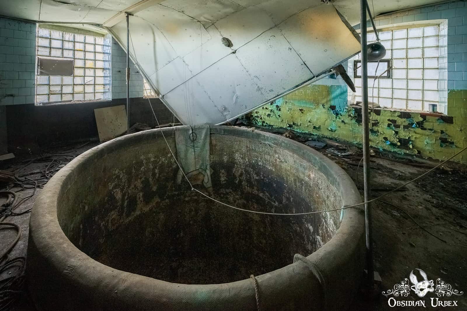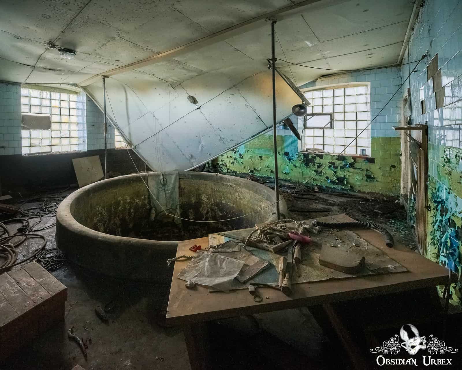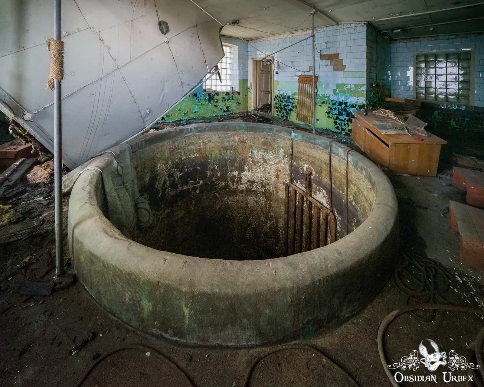 The uppermost room is mostly filled with the open tank, only a short rim between me and a three storey drop. At the bottom of the tank there is still some water, probably not very deep but it is hard to tell from up here. There is a radiator on the wall of the tank, presumably to prevent freezing during the winter. There is a diving suit draped over the rim of the tank, and some paperwork and teaching material on the rickety old table.