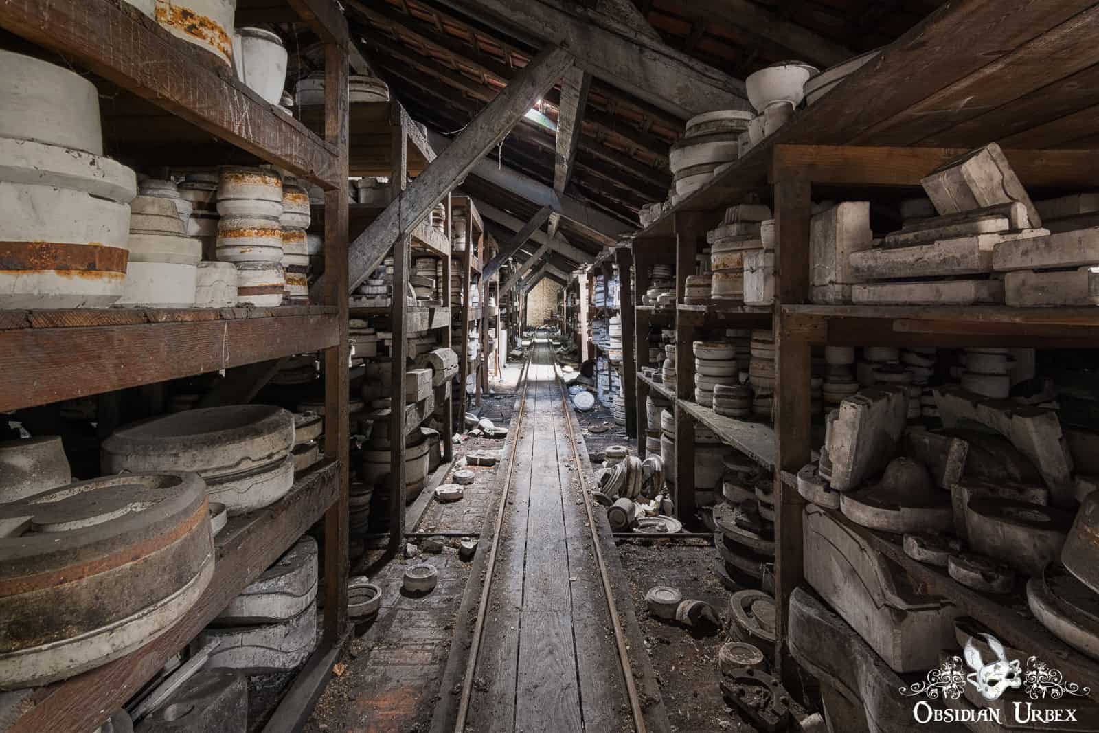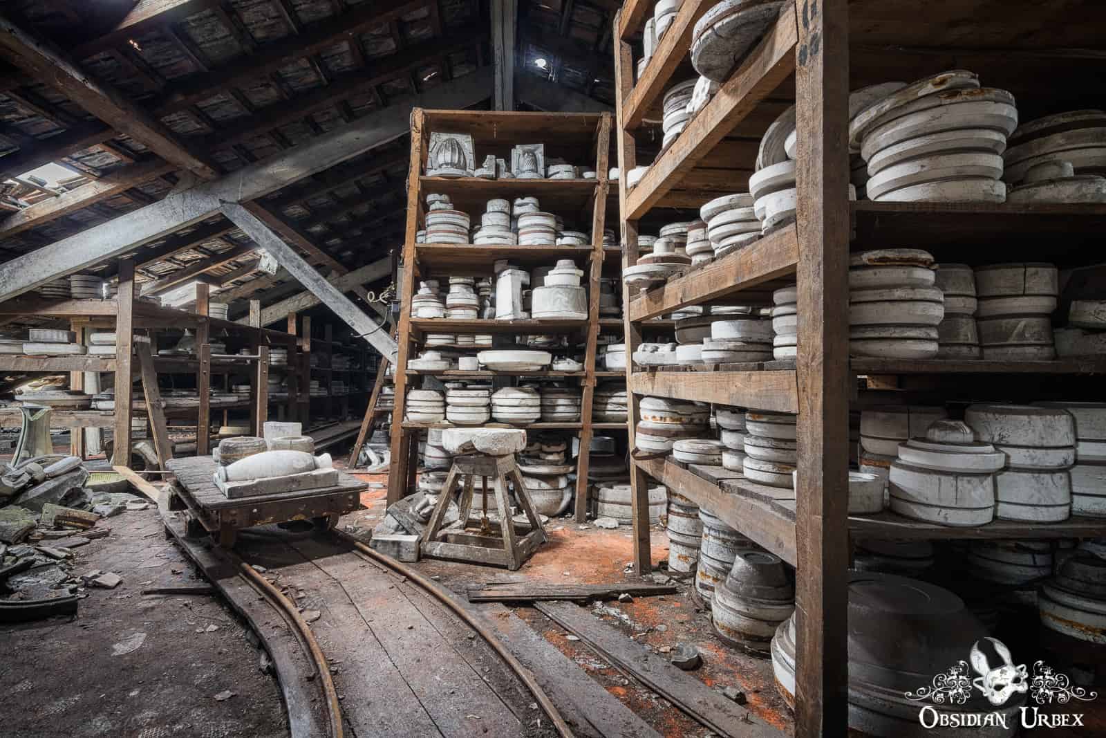 Many of the molds are heavy, so they were transported around on carts. A long rail system runs along the building, and several wooden carts still stand on the tracks. Some of these are still loaded with pottery molds.
