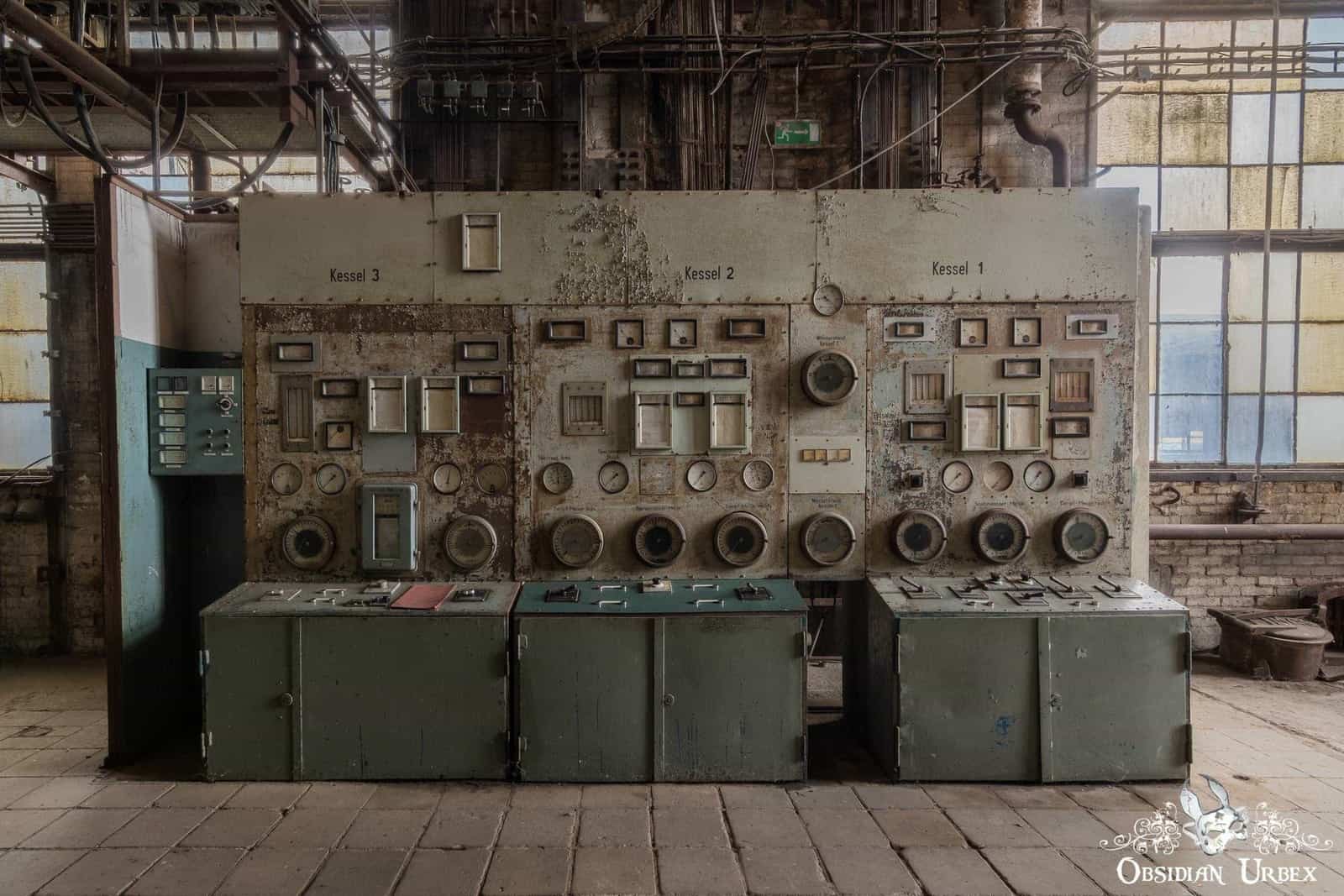Kraftwerk P is a disused coal-fired power station in Germany. It features a fantastic Art Deco control room, turbine halls, boiler house, pump house, two chimneys and four cooling towers. Kraftwerk P was built during the 1920s, and remained one of the most advanced power stations in Germany well into the 1930s. It was intended to provide additional power during peak-hours of electricity demand, both domestically and industrially. Brown coal (Lignite) was supplied to the power station from nearby open cast coal mines, generating over 50 megawatts of electricity after additional 1940s modernisation. There were five gas turbines in the turbine halls (only one remained at the time of our visit), which were connected to five boilers. Large transformers were added in the 1970s to increase the output voltages. Kraftwerk P was decommissioned and taken off the grid in the early 1990s.