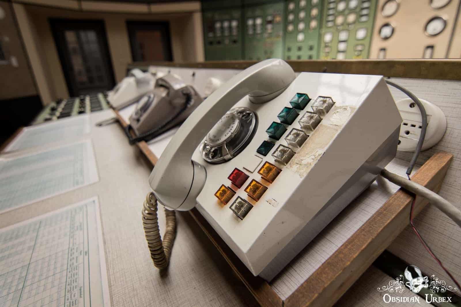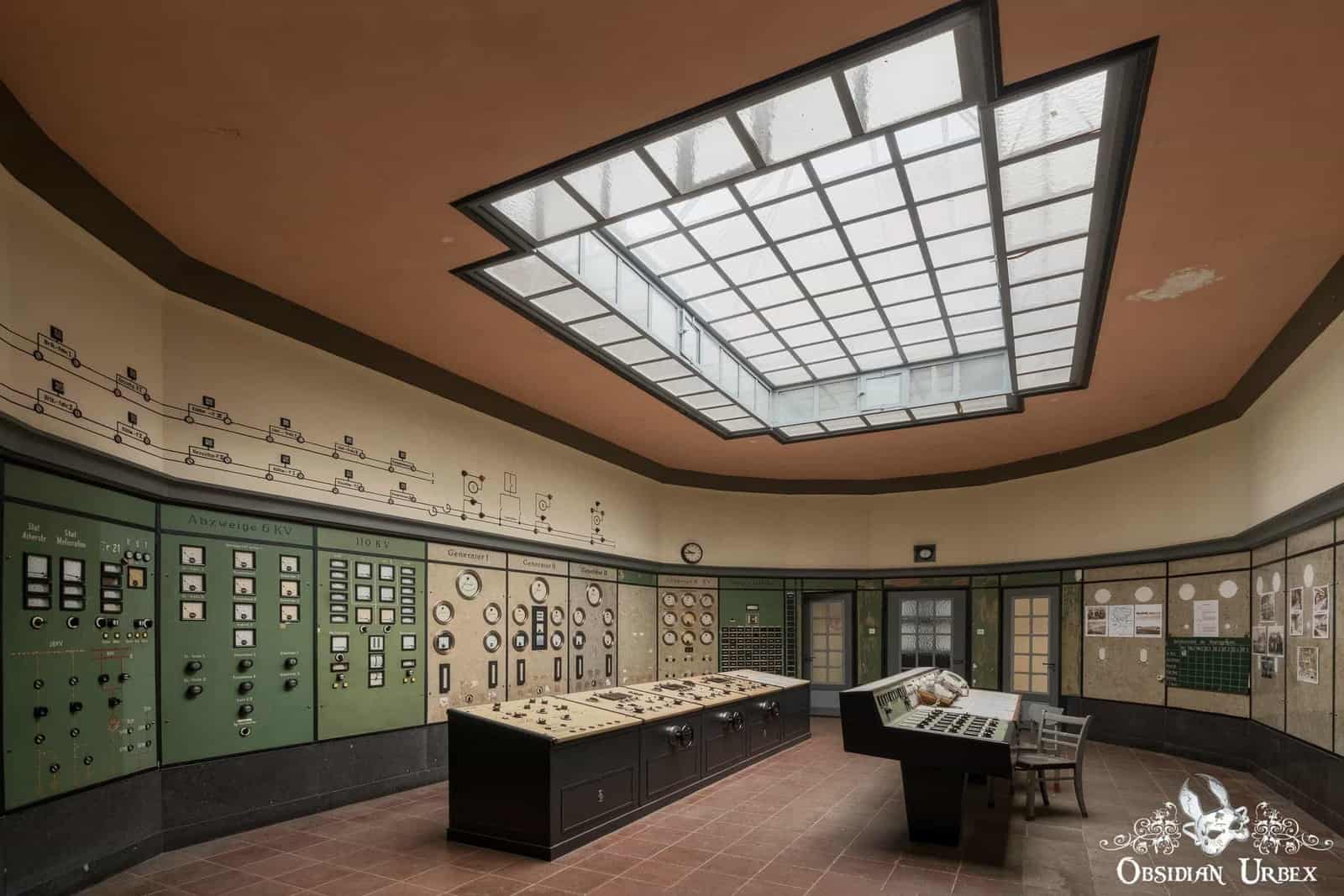On the other side of the turbine room, is the main attraction; an Art Deco control room. Green panels line the beige walls, covered with many dials and buttons. The two central consoles/work stations still have their original chunky retro telephones. The small control room is well-lit by a large skylight set in a striking orange/red-painted ceiling.