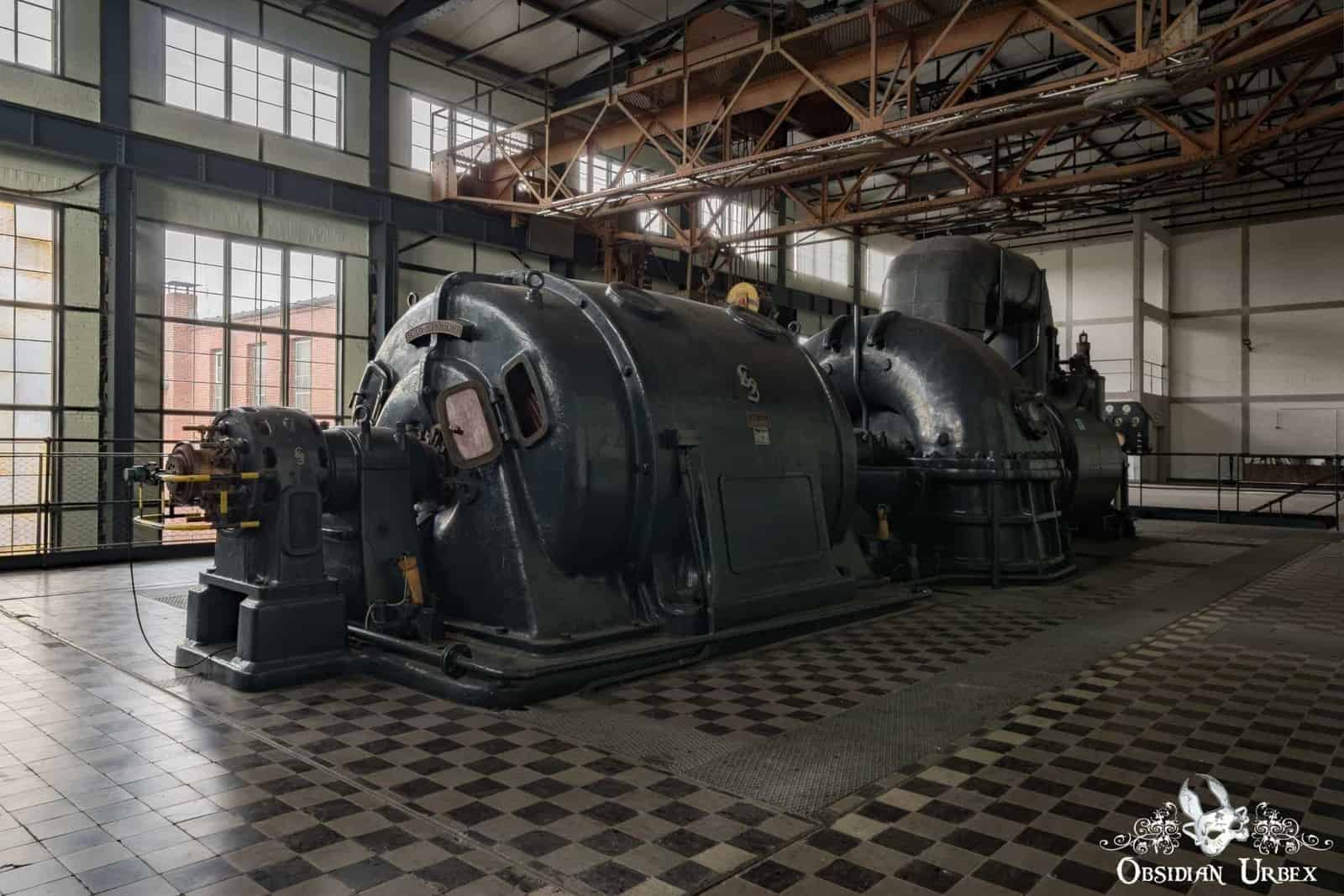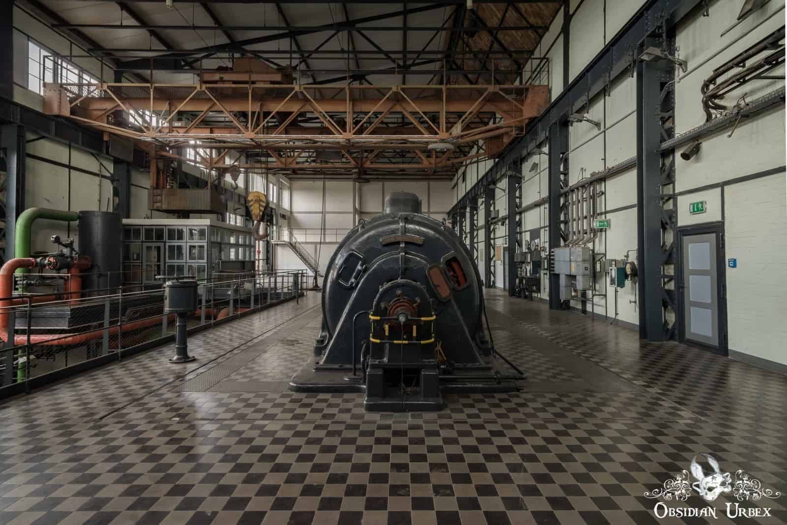 One solitary large black turbine stands in the large turbine hall, the rest have been removed. The floor is a neat black and white tiles. Connected to the turbine hall, is the boiler house. A labyrinth of pipes intertwined with metal walkways and stairs stretch up into the darkness of the high ceiling. Rusty boilers and their associated valves, taps, levers and dials. Several control panels and work stations are dotted around the edges of the boiler house.