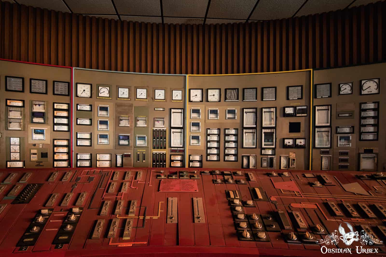 The entire power plant building is empty, apart from the near pristine control room. All turbines and machinery have been completely stripped out. Wondering through the empty halls, we did begin to think we had incorrect coordinates. Eventually, we entered the Lady in Red control room. An ominous humming noise fills this small dark room. A router is connected to one of the terminals, a green light blinks indicating active data transfer. There is a crescent-shaped red control panel on each side of the room, with more dials and switches on green wall-mounted banks. In the middle of a room, three CRT monitors sit on a red/orange/yellow desk.