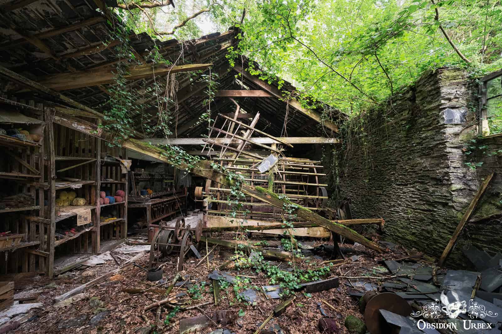 Nestled between a bubbling river and rolling green Welsh hills, lay the abandoned Old Tweed Mills. Their story, spanning over 150 years, follows the Welsh textile industry from the Industrial Revolution boom to the fall of the British textile industry in the mid-20th century. The forest is slowly engulfing these ruins, as they are collapsing. However, inside are the skeletal remains of old machines, still strung with colourful woollen threads.