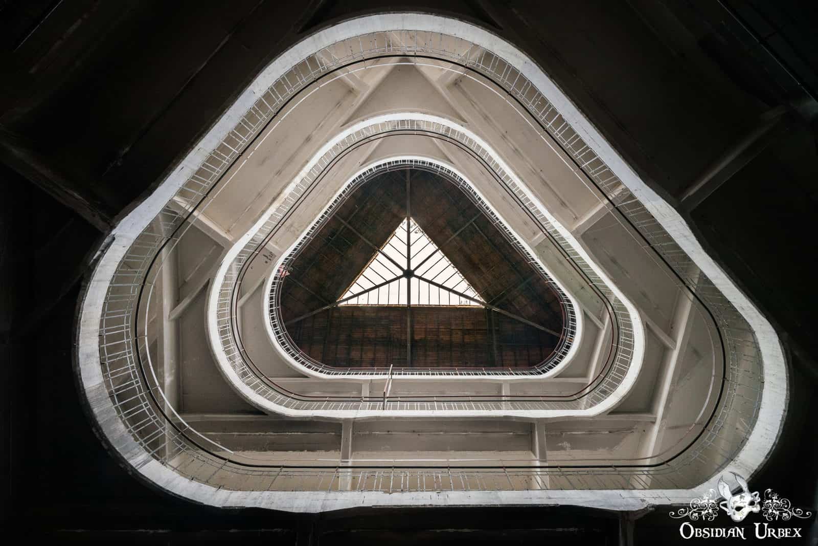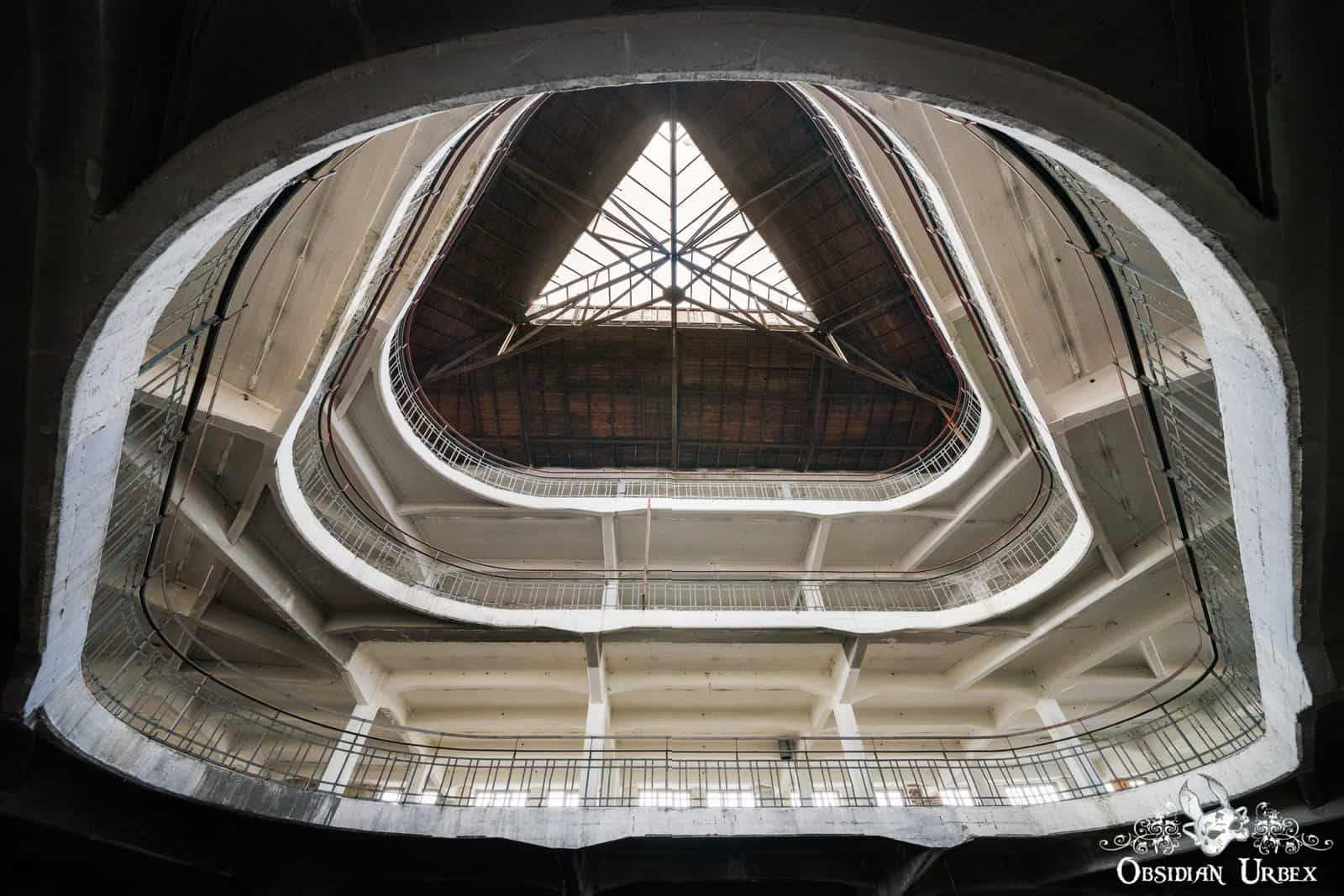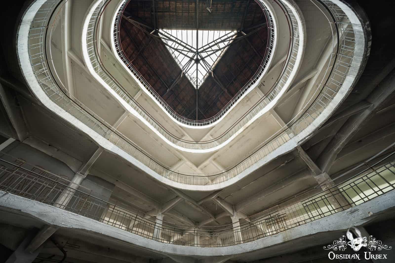 Load-bearing concrete columns support this building; forming a concrete skeleton. On the ground floor, these columns are octagonal in shape. This grants them extra strength. On the upper floors, the columns have a square cross-section. Arched beams radiate from these columns which further support this four-storey structure.