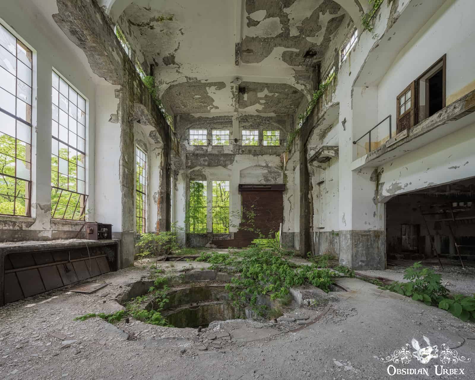 The main turbine hall at Wagakawa Hydro Power Plant features large windows, making this chamber bright and airy. The ceiling must be nearly 20m tall. Column-like ribs on the wall rise to form arches which support the roof. Most of the glass has shattered over the years. These remnants now cling to the frames in jagged fragments. There are two large circular holes in the floor which would have housed the turbines.