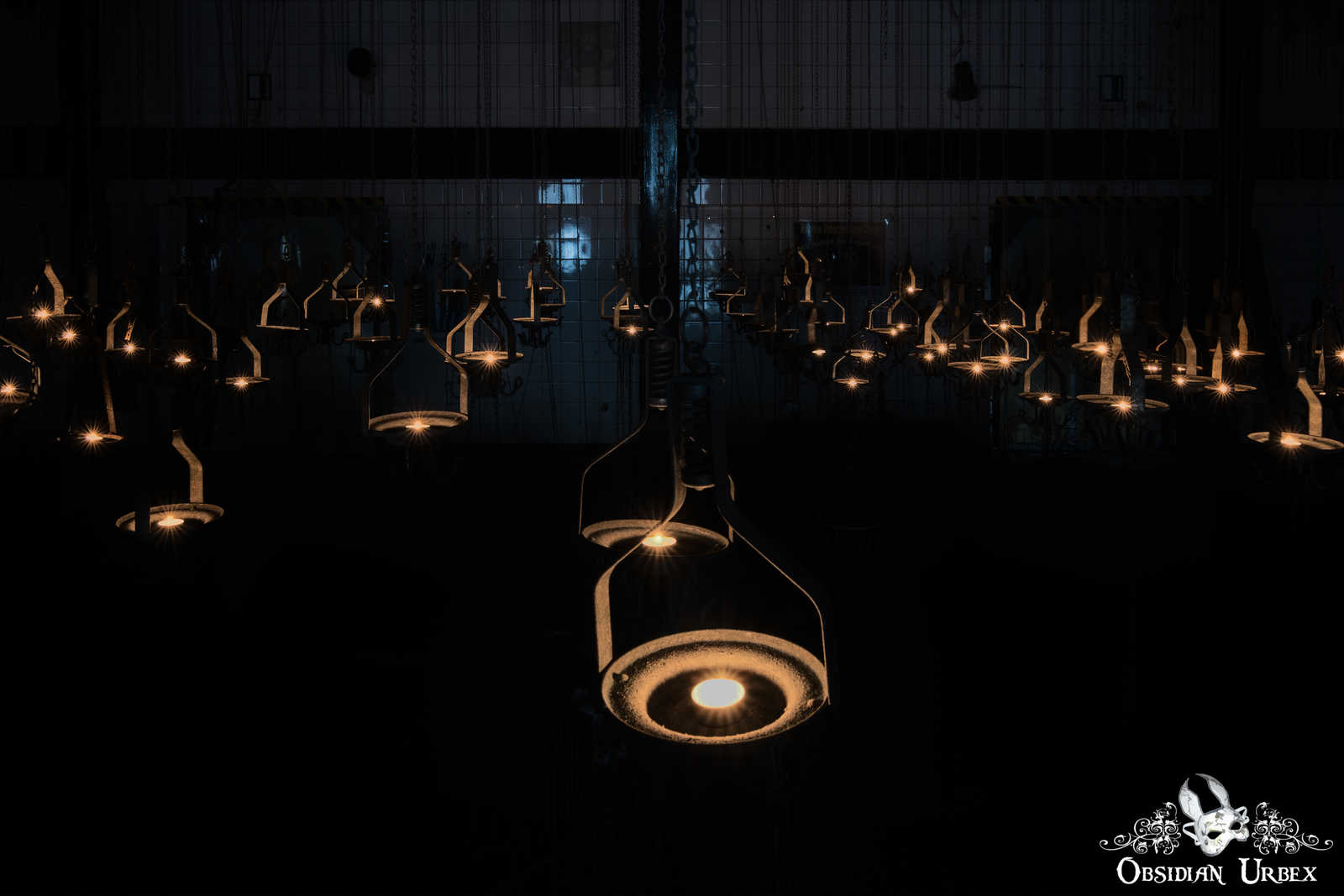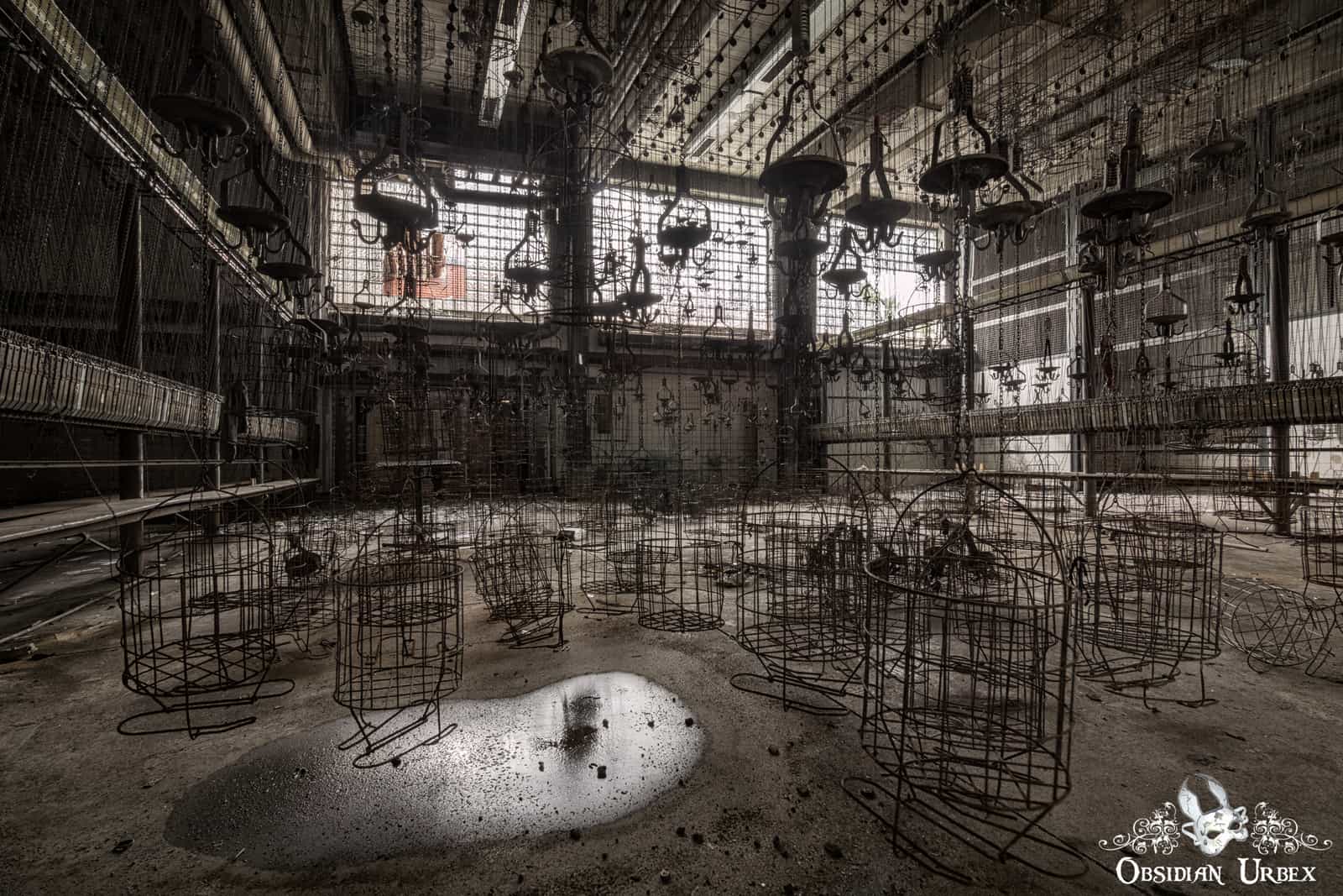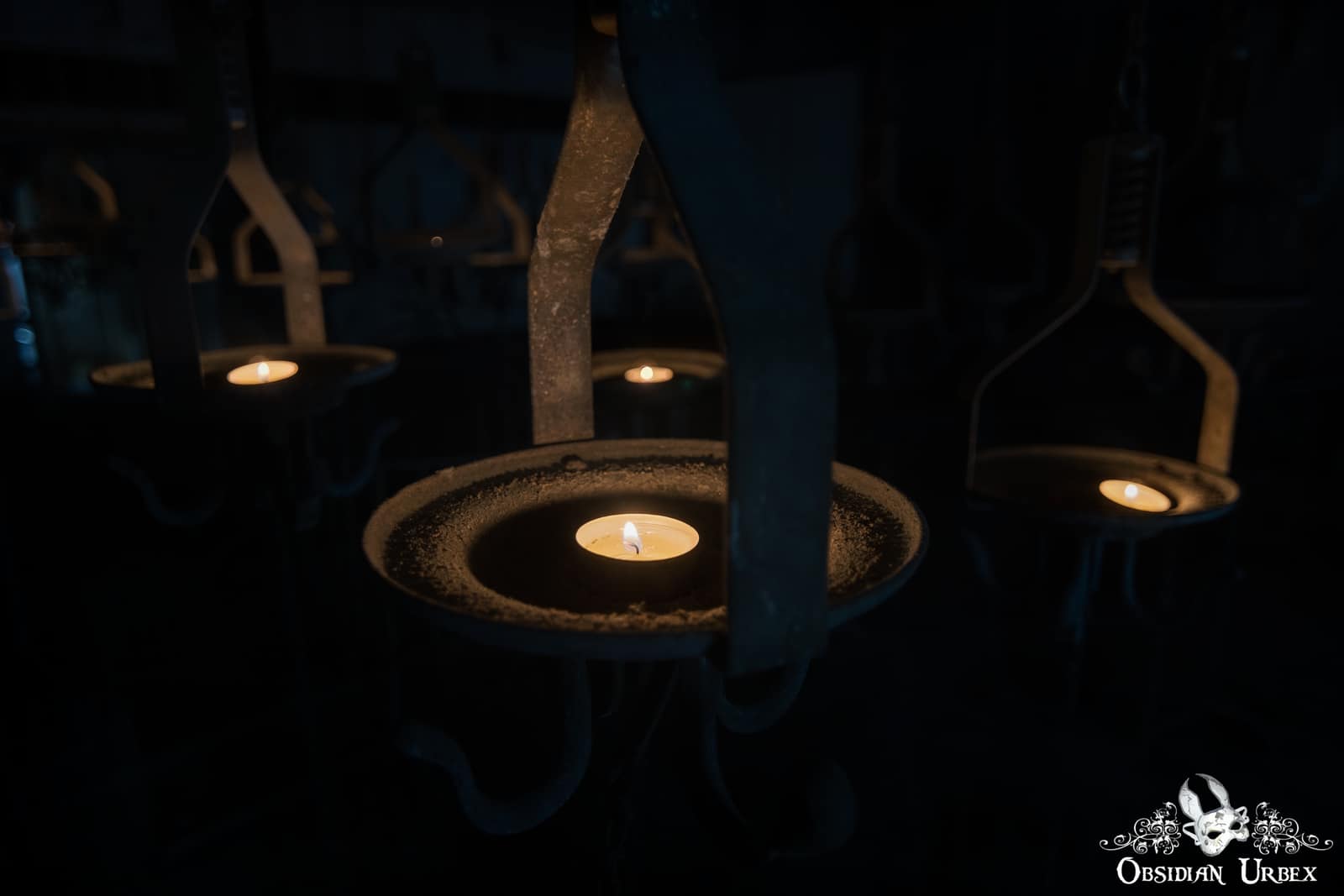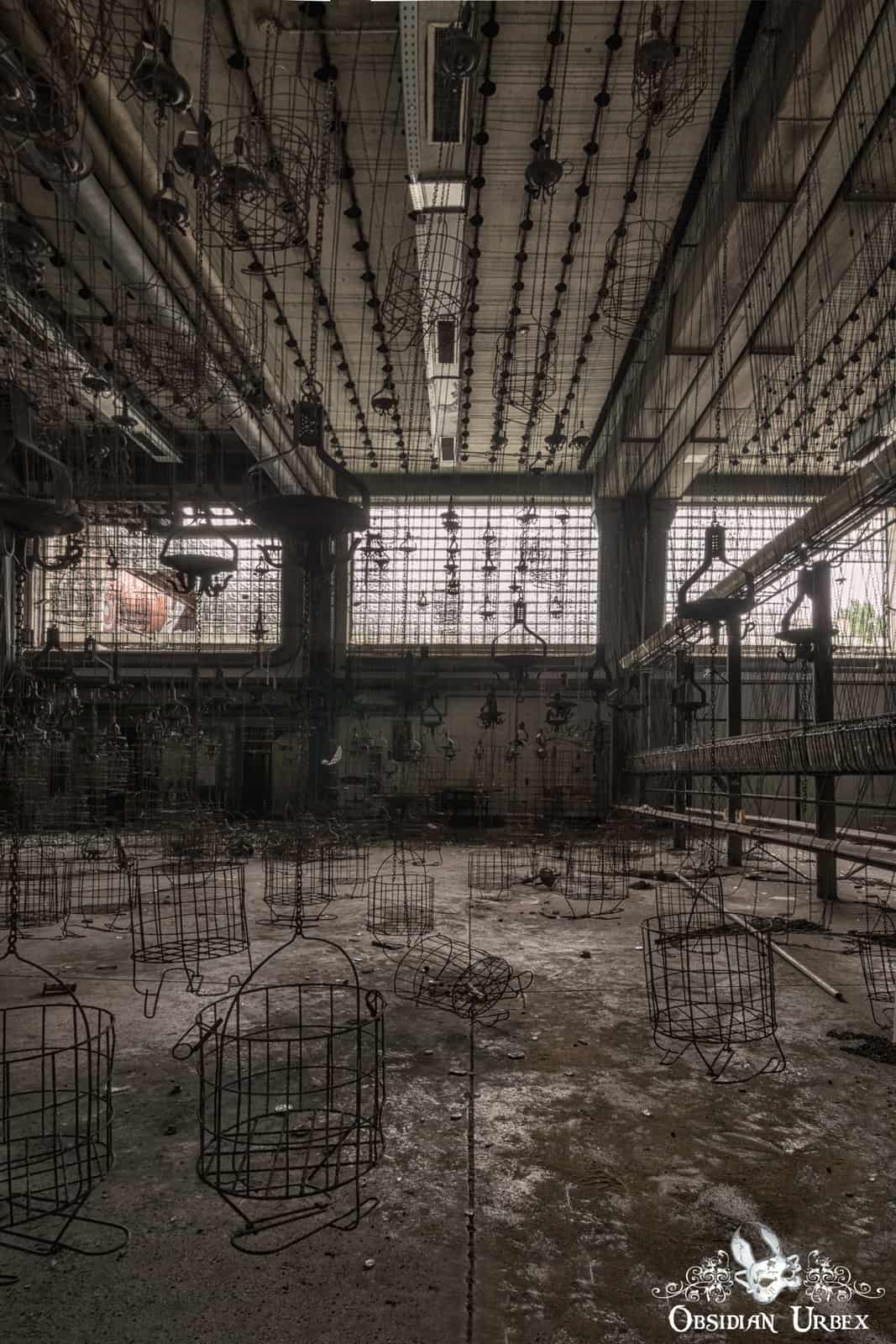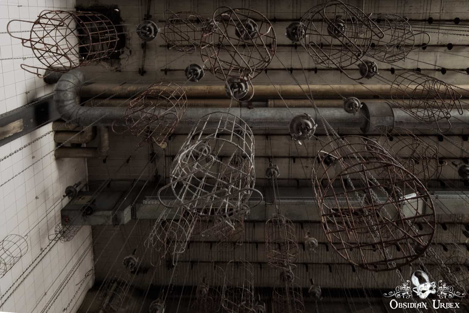 We spent an hour in the “cage room”, but nothing else of interest was seen in the rest of the site. The site of hundreds of cages, suspended at different heights in such a massive hall, was truly a surreal sight to behold. A gentle breeze caused some cages to move slightly, which made photography in this dark room quite frustrating. The bright light from the windows made these photographs quite a challenge from certain angles. One room was almost pitch black. With the aid of some carefully placed candles we were able to take some atmospheric photographs, to try something a little different.