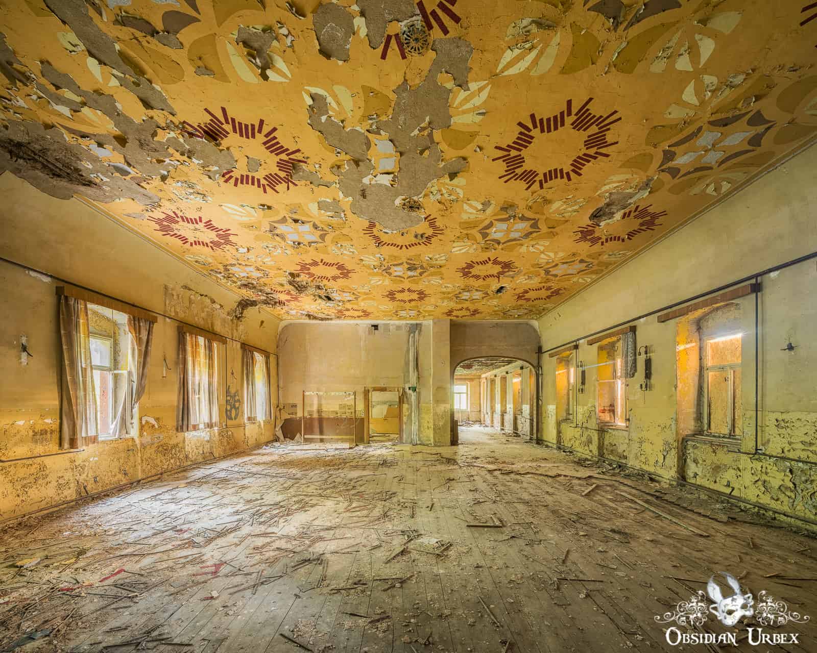 Ballsaal Blume is an abandoned ballroom, tucked away in a small town in East Germany. The name translates to “Ballroom Flower”. This location is sometimes called Kulturhaus Blumendecke; or “Culture House Flower Ceiling”. Certainly, these codenames have a flowery trend to them! The entire ceiling of the ballroom is painted with motifs that are usually described as flowers. Personally, I think they look more like simple abstract radial patterns (perhaps that is just me not squinting, or tilting my head enough!).