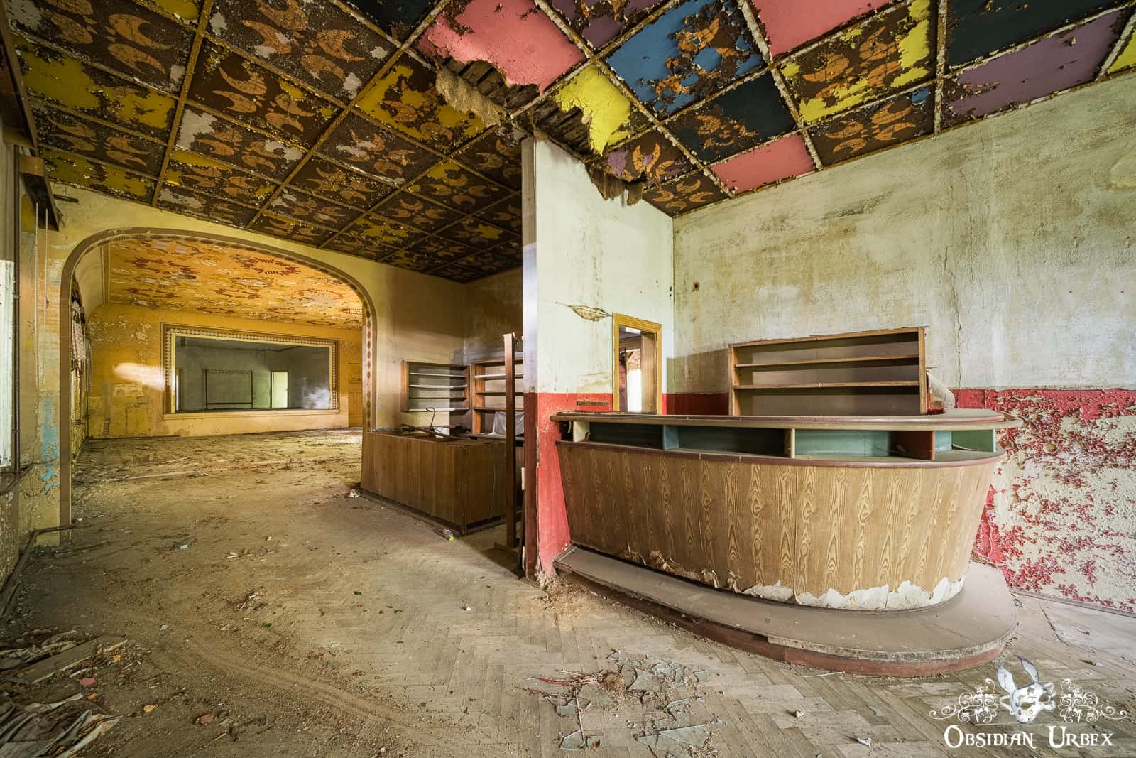 Ballsaal Blume has a second area that I found interesting; a bar area leading off from the main room. The curved wooden bar looks so welcoming, I could imagine people retreating to this room for a drink and to socialise. The ceiling tells an interesting tale of changing decoration style. Beneath the peeling paint panels, brown and orange radial patterns can be seen which look to be contemporary to the main room. However, it appears that at some point these were painted over with solid colours (pink, lilac, bright yellow and cornflower blue). The lower portion of the walls is also painted pink, which likely was also done during the redecoration.