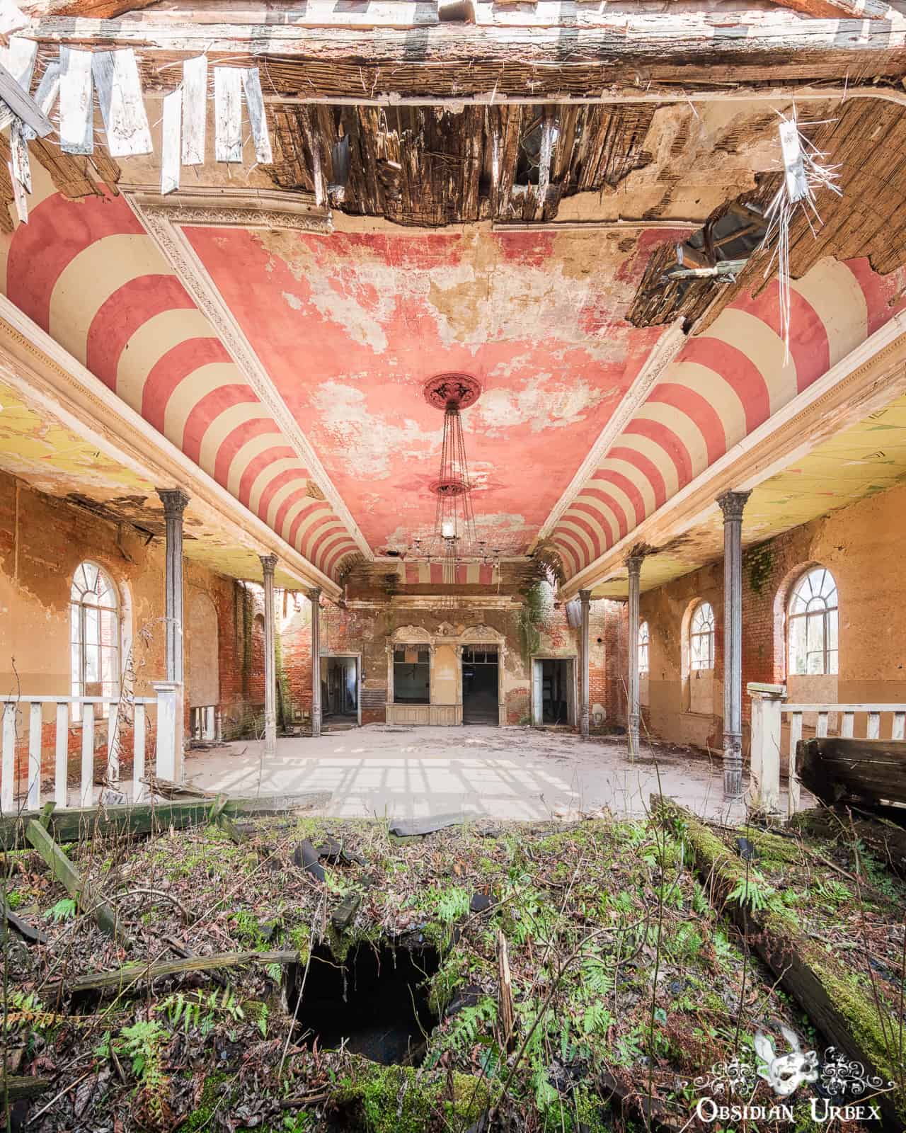 Clearly the most striking feature of Ballsaal Rot Weiss is the red ceiling. Two concave strips run along the ceiling, parallel to the long axis of the room. These strips are stripped red and white, like a candy cane. There are two black chandeliers which hang from the ceiling. The floor is rotten and is collapsing in places. The roof above the stage has collapsed, and the stage boards are rotten. Ferns and moss grown in a thick carpet on the stage. I think my favourite shot from here was standing on the stage, shooting with the fern-covered stage in the foreground. Well worth the slightly precarious trek across the splintering stage boards.