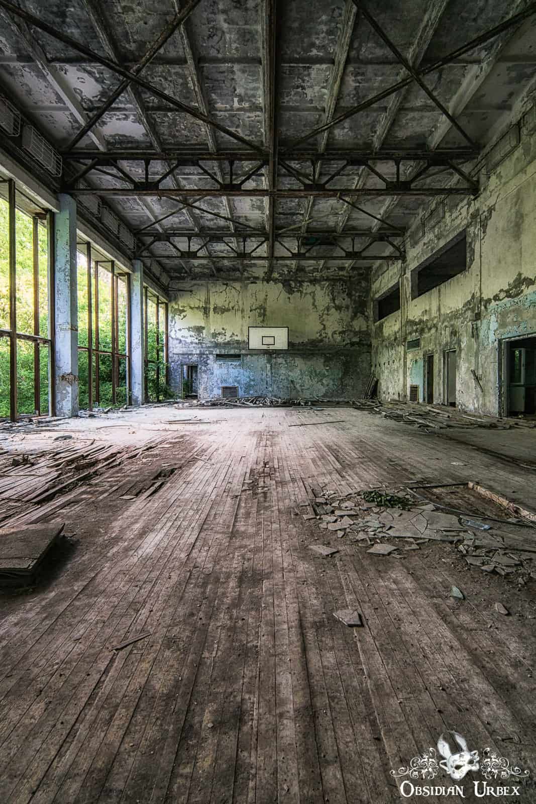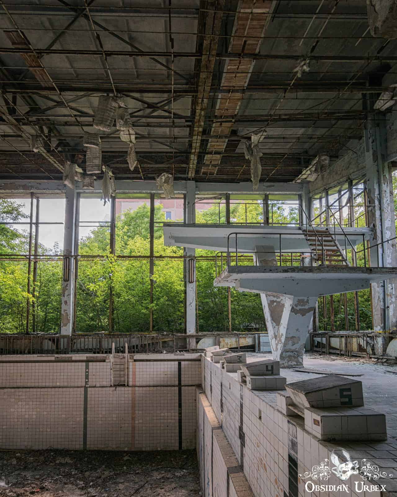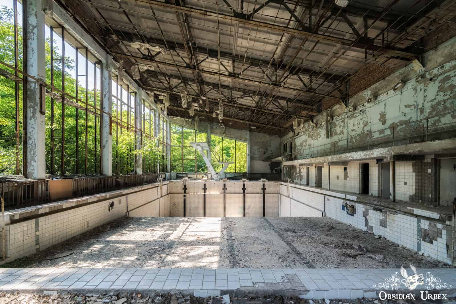 The Pripyat Azure Swimming Pool (Lazúrnyj) is a famous abandoned swimming pool. This is one of three swimming pools which existed in Pripyat. The building lies deep in the 20km Chernobyl Exclusion Zone.