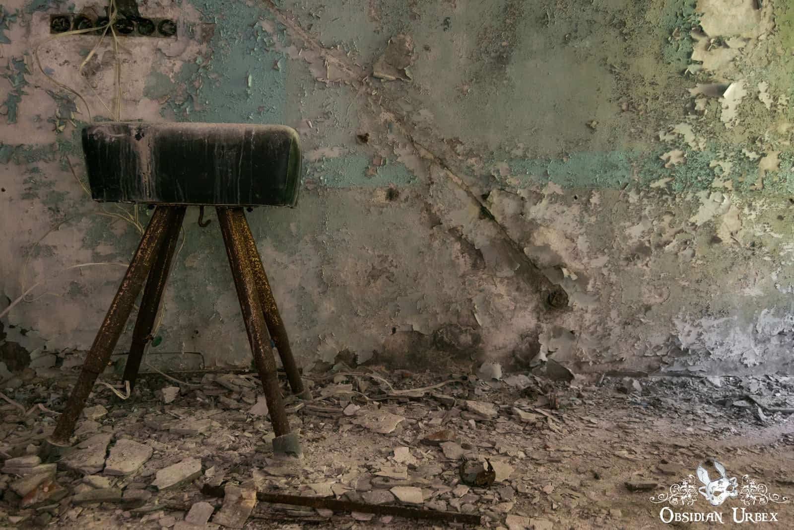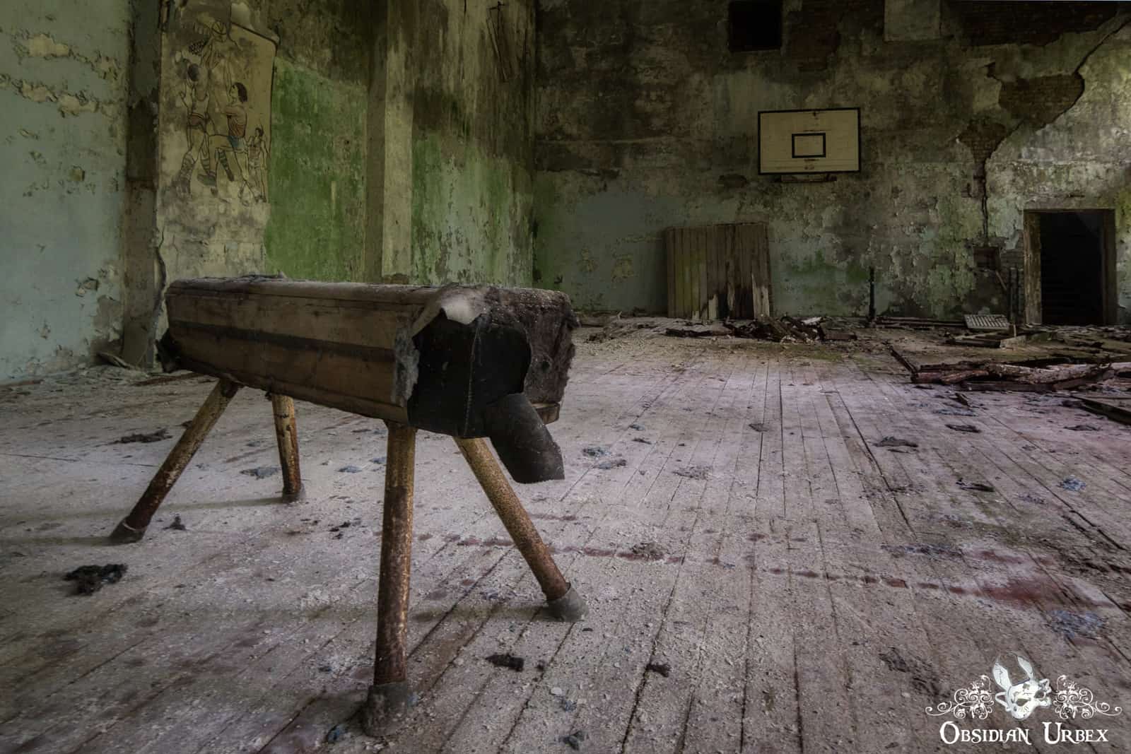 Chernobyl-2 was a small military town, built for the workers of the Duga-1 radar site. The social club was a meeting place for the community of this small town. There is a gymnasium with vaulting box and wonderfully decaying wooden floor. On the walls are original posters with cartoons depicting sporting events. There is green mould on the walls and ceiling, and clumps of moss colonising the floor. Cyrillic alphabet lettering adores the wall, flaking away over time.
