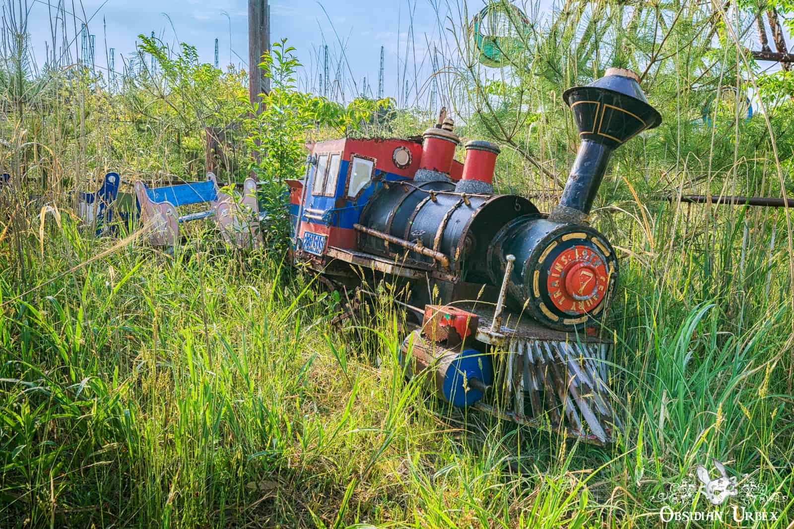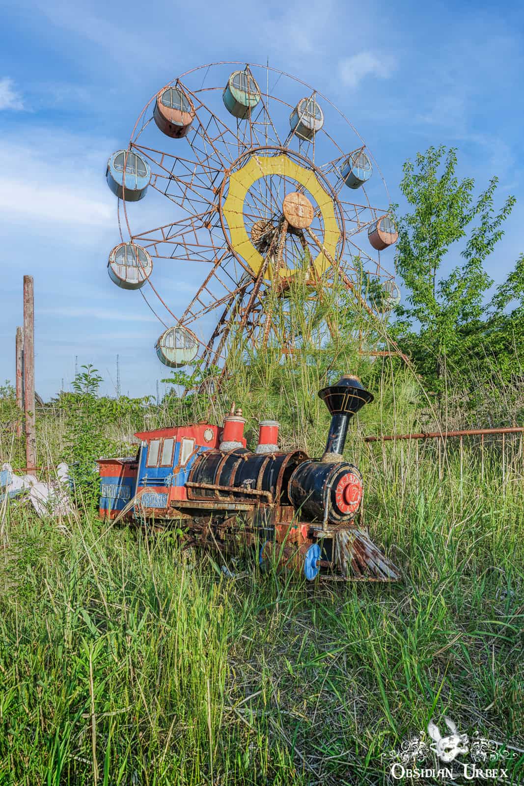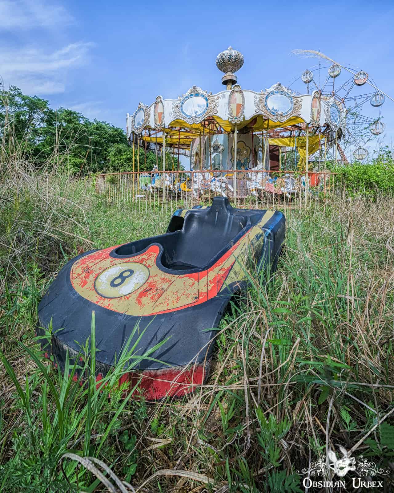 The theme park is relatively small and features classic attractions. During my visit many rides remained on the site; namely a Ferris Wheel, teacup ride, carousel and miniature train ride. Near the Ferris Wheel stands a wooden playground and obstacle course. A single Go-Kart car was seen nearby the carousel. All are heavily overgrown with long grass, bright green during my springtime visit.