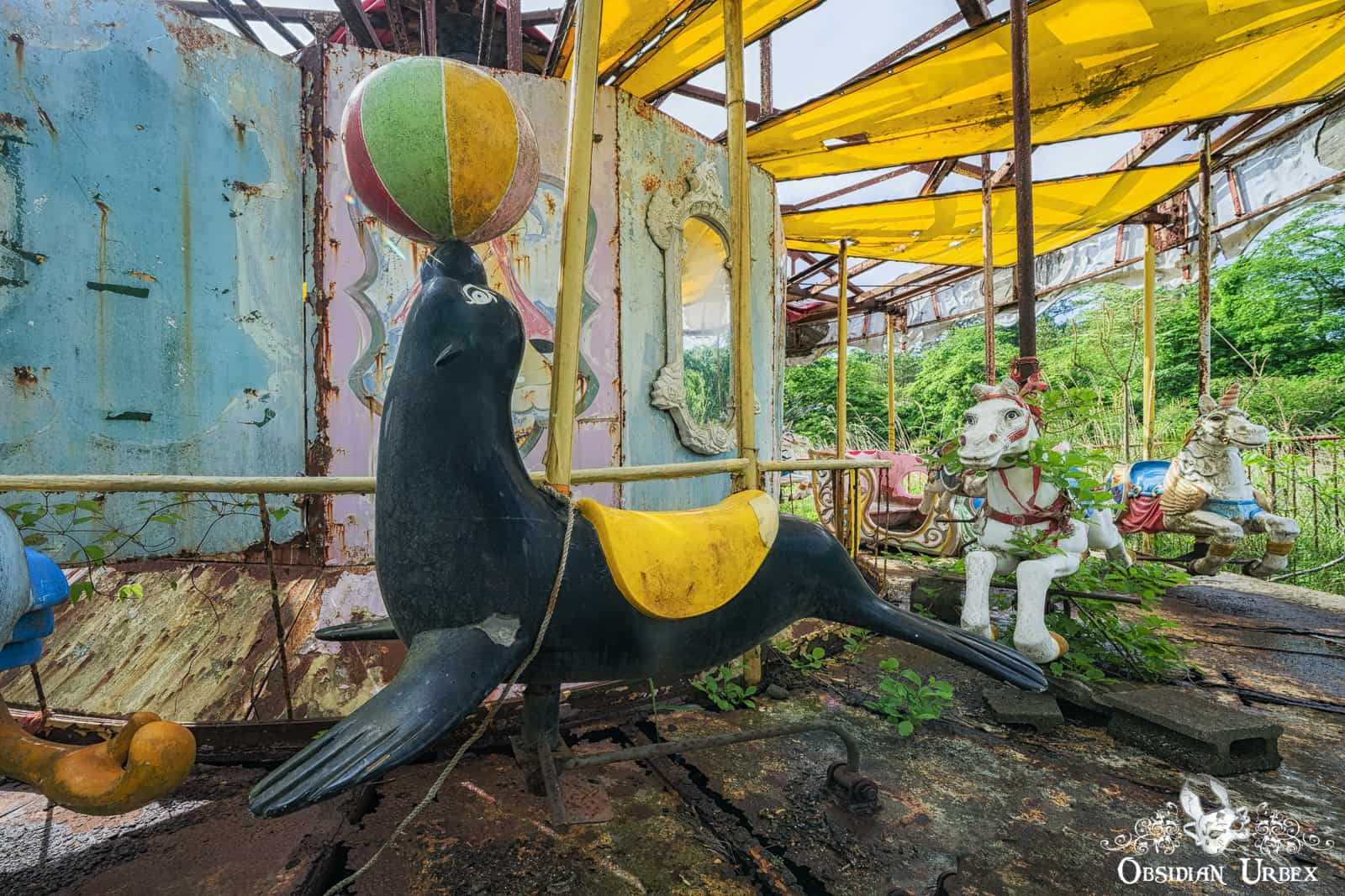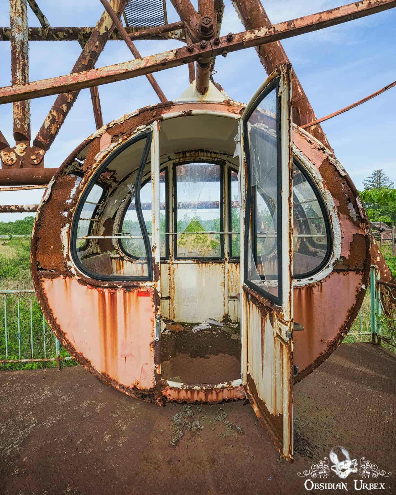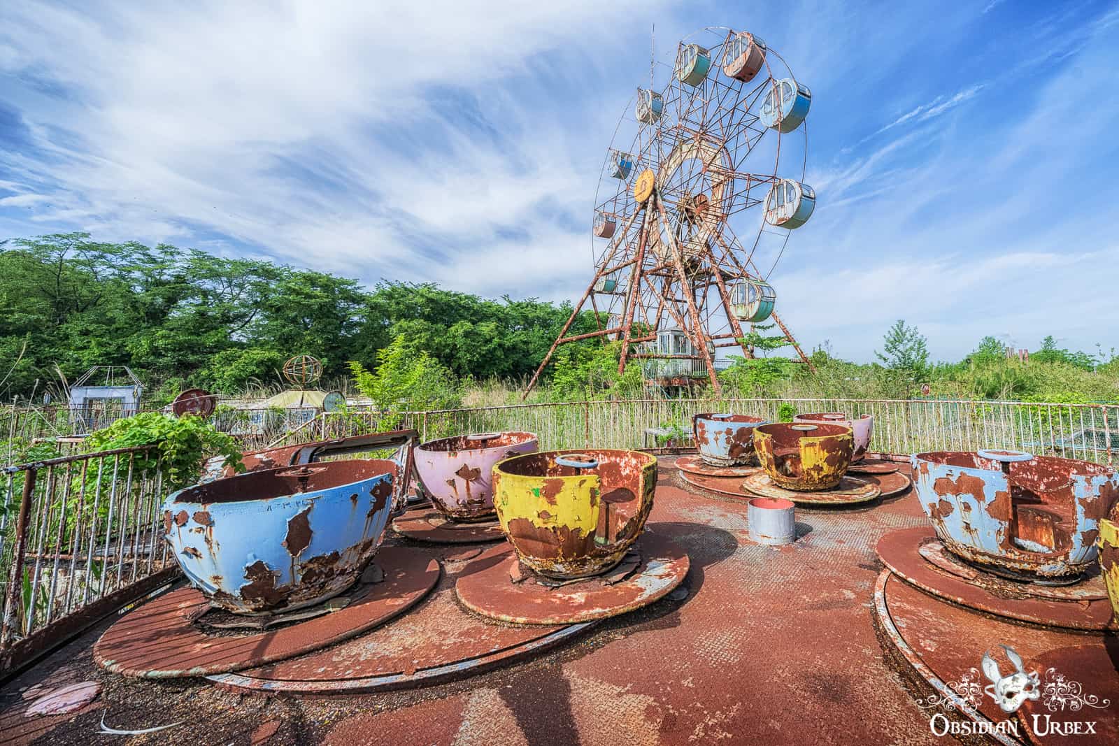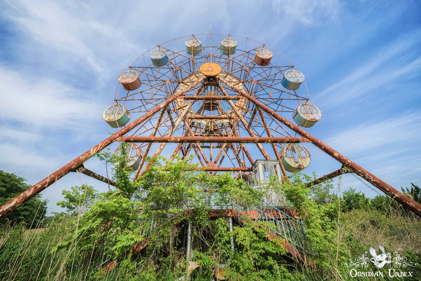 The theme park is relatively small and features classic attractions. During my visit many rides remained on the site; namely a Ferris Wheel, teacup ride, carousel and miniature train ride. Near the Ferris Wheel stands a wooden playground and obstacle course. A single Go-Kart car was seen nearby the carousel. All are heavily overgrown with long grass, bright green during my springtime visit.