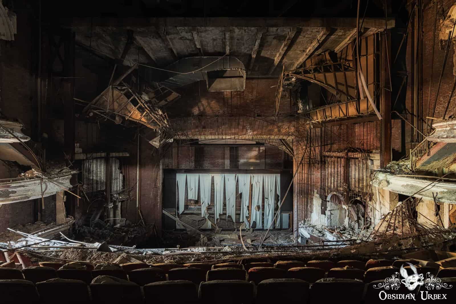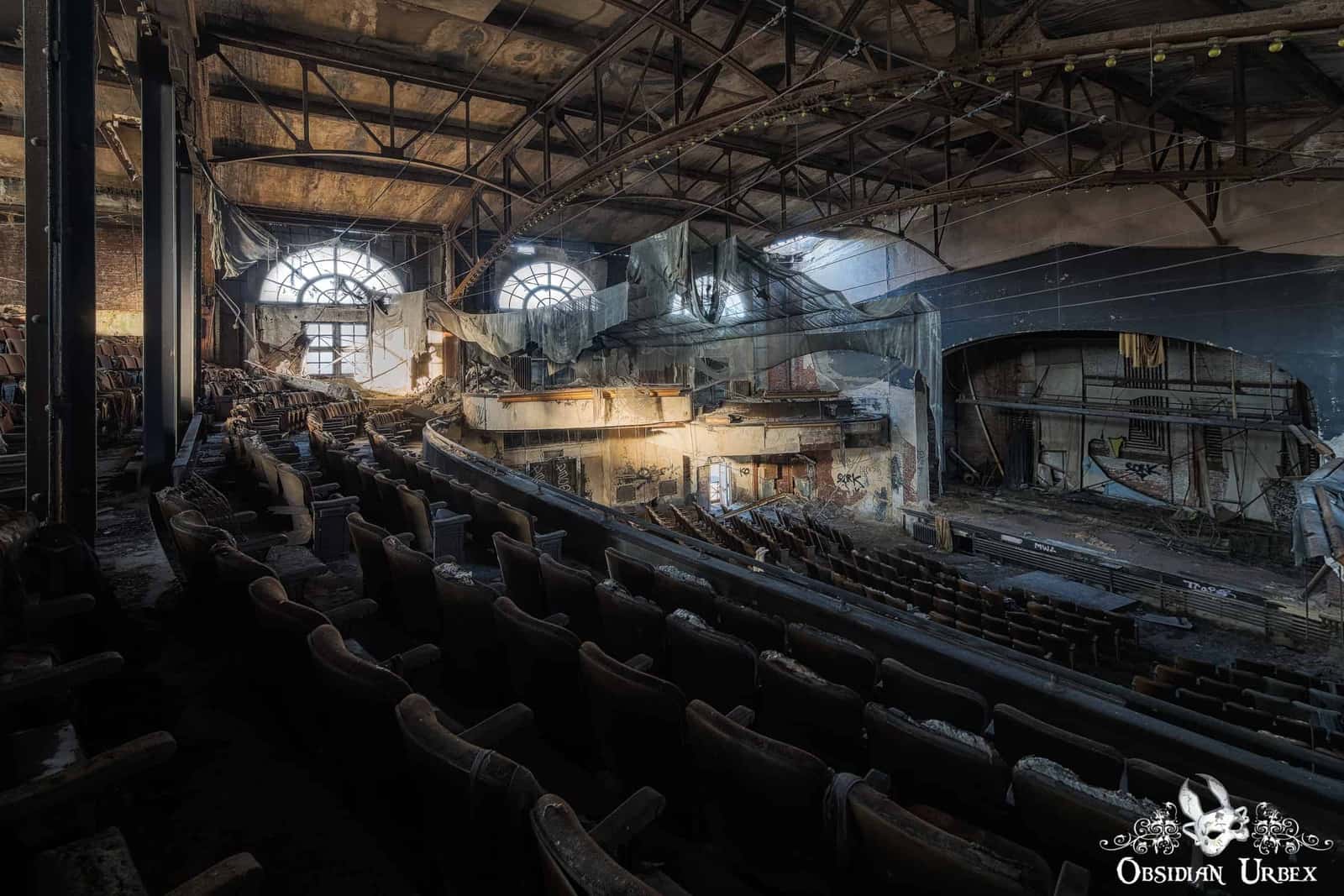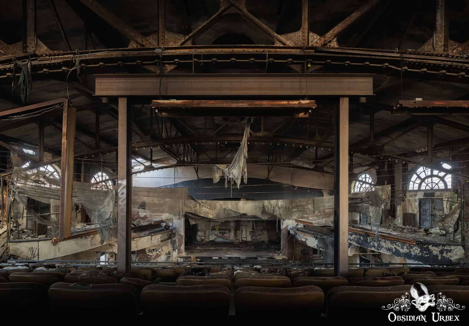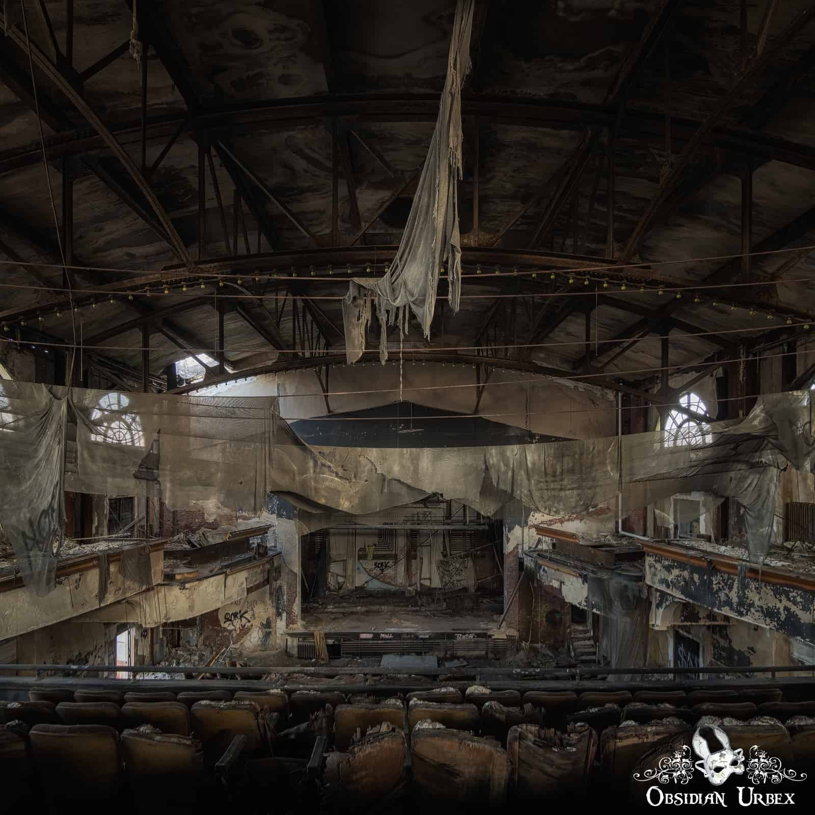 The once billowing cloth ceiling drapes, now hang torn in disarray and blow in the breeze. These would have lined the ceiling, hiding the industrial-looking arched iron girders that support the roof of the building. Numerous bulbs can be seen mounted along the curved iron beams, which would have brightly lit the auditorium in between movie showings.