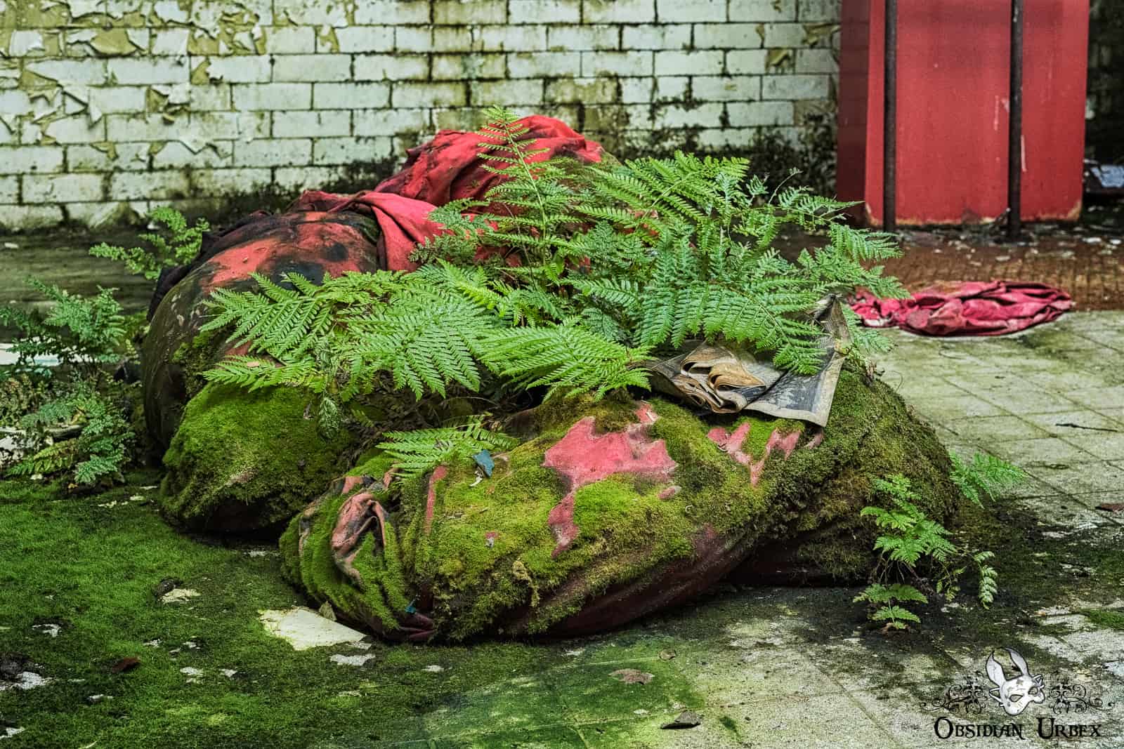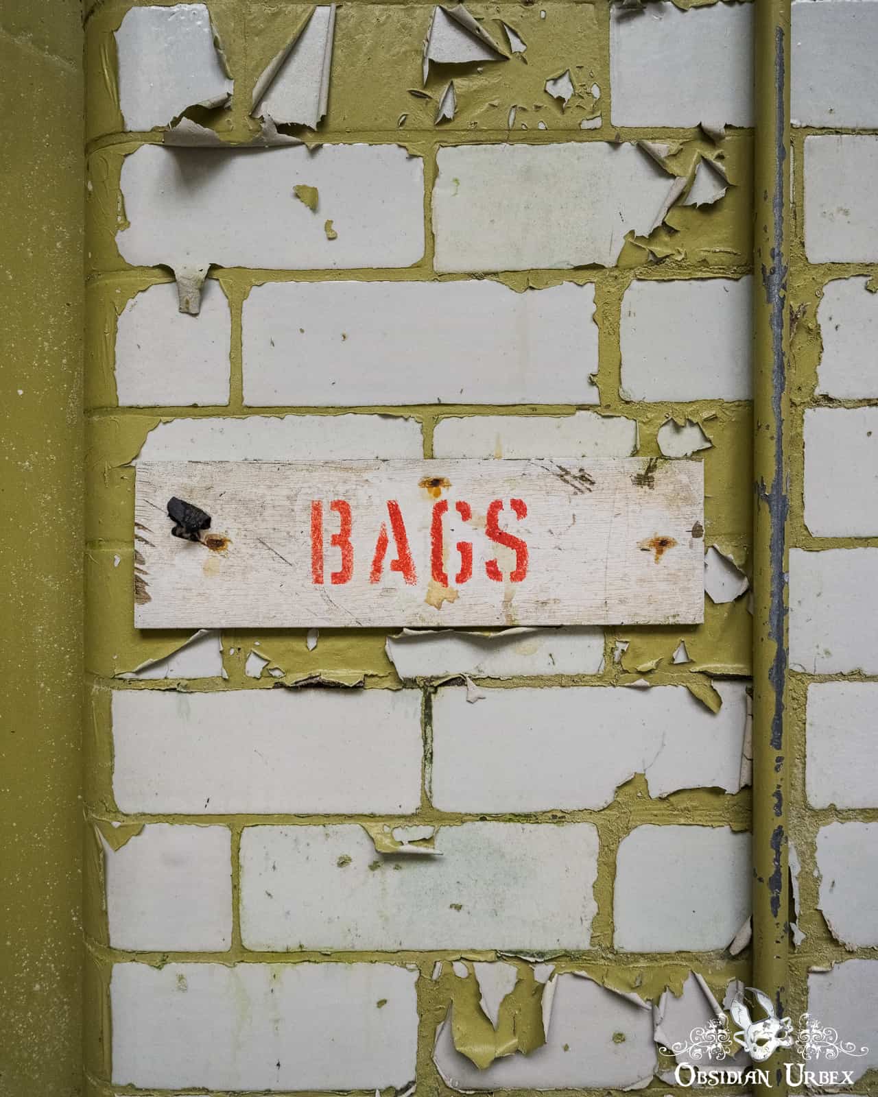 The laundry building is split into two large rooms with a smaller room connecting them. The first room is the laundry sorting. There are wooden signs with stencilled lettering on the walls: dresses, blankets, bags, and sheets. There is also a red weighing scale in this room. In front of this is a pile of red laundry bags; the green of the ferns growing out of them contrasts beautifully.