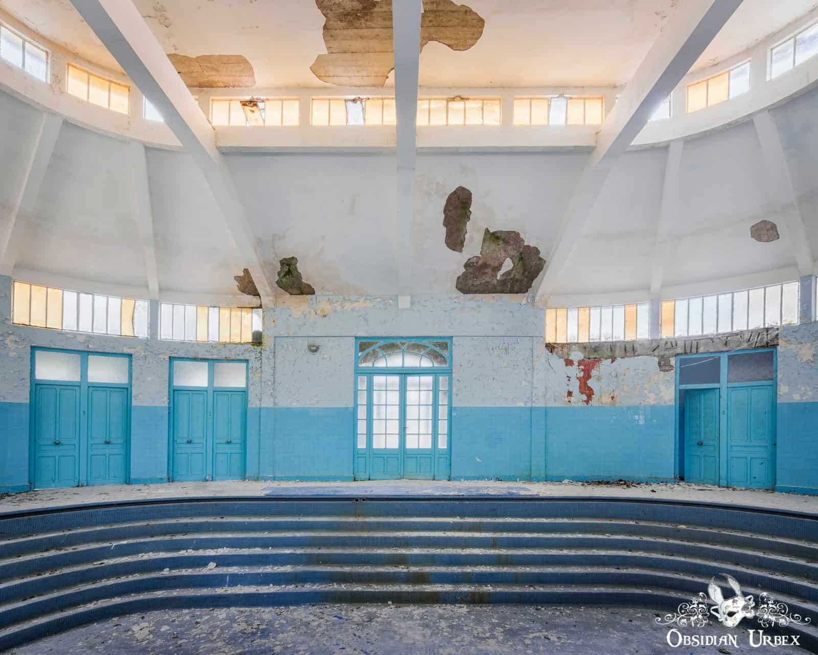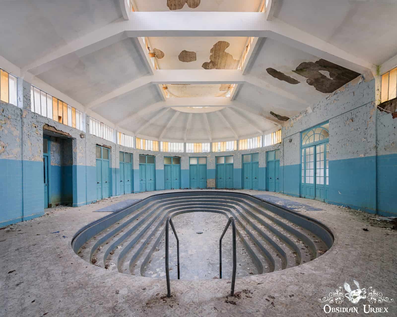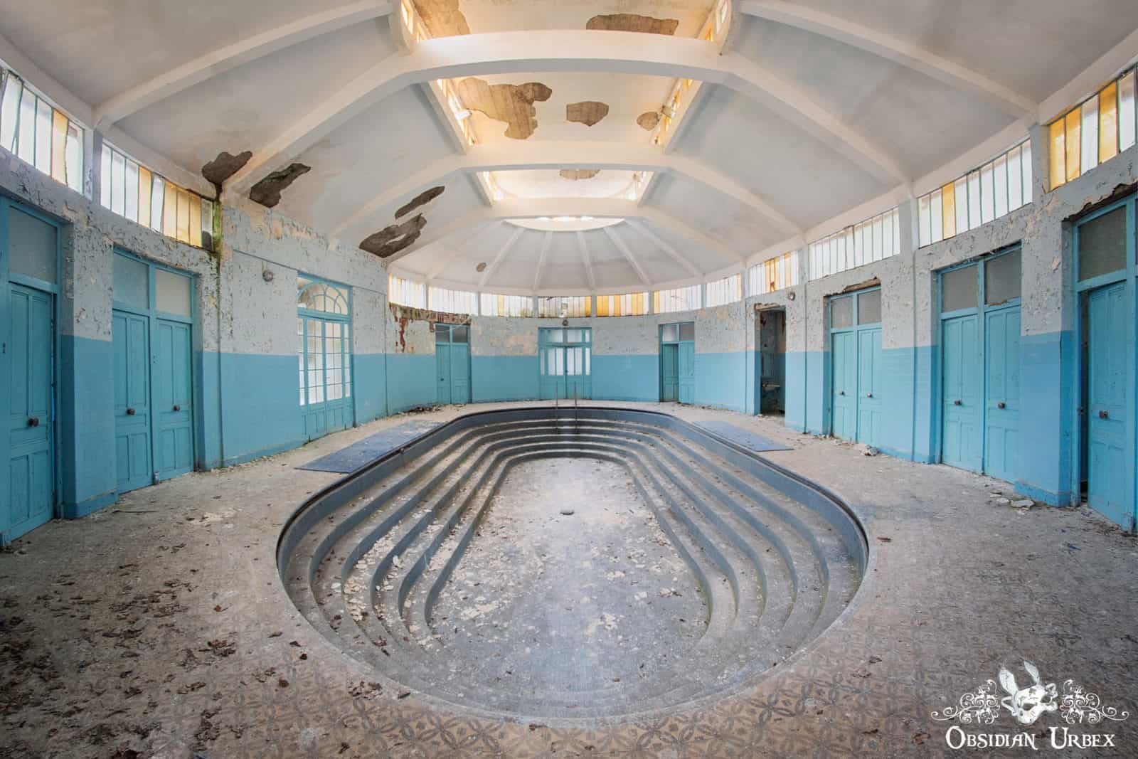 The main attraction here is the beautiful blue bathing pool. This oval-shaped bath is well-lit by a large skylight. There is abundant, beautiful natural decay to be seen here. The corridors on the ground floor feature similar blue tiles and are similarly decaying peacefully.