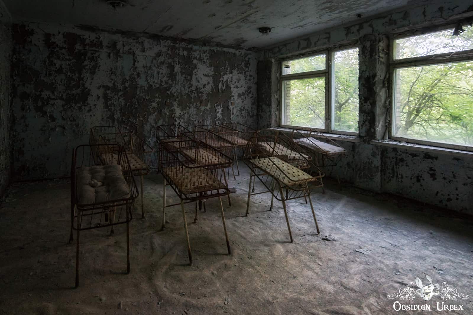 A maternity ward with baby cots can be found on one of the upper floors of Pripyat Hospital No. 126. A small child’s sheep toy lies on the mattress. Other rooms feature various medical paraphernalia; beds, examination chairs, bottles, jars and rare pieces of surgical equipment.
