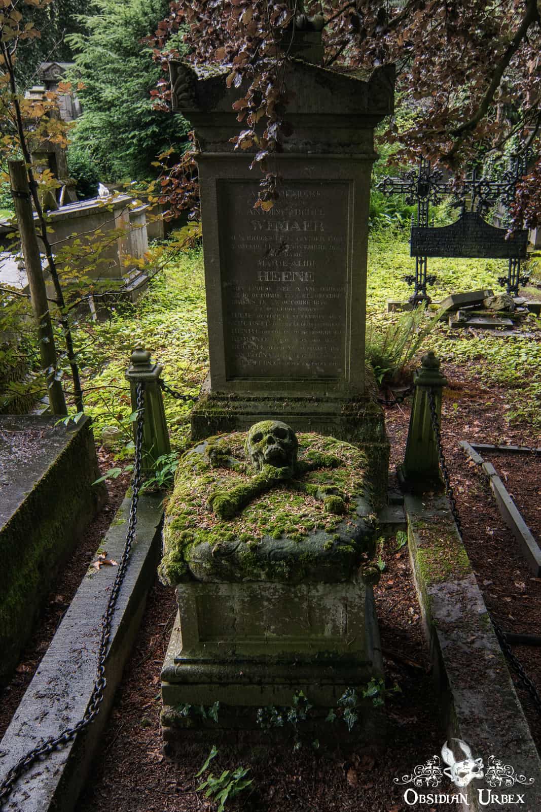 Of course, there are many beautiful gravestones in this cemetery. However, there is one that is of particular interest. The stone skull that sits in the shade of 200-year-old beech trees is over 150 years old. The gravestone marks the resting place of a merchant and his wife, and is a registered monument. The skull’s mouth is grotesquely agape in a centuries-long silent scream, resting on a pillow of crossed femur bones. Bright green moss covers the gravestone, accentuating the hollow eye sockets and the tortured grimace of the macabre Cemetery of the Skull.