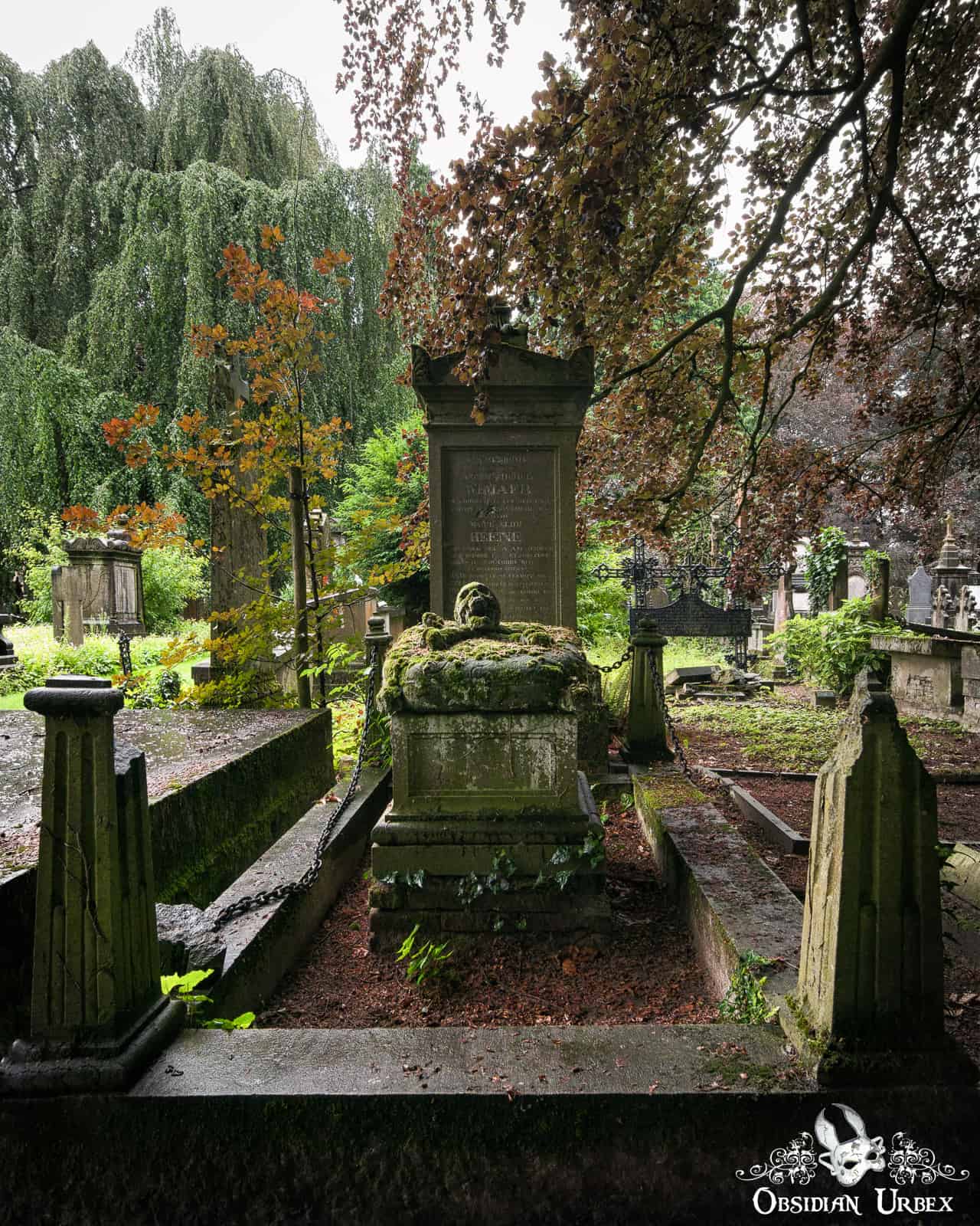 The Cemetery of the Skull is a graveyard within a large Belgian city. This cemetery is over 200 years old. Beautiful 200-year-old red beech trees. line the main pathways leading from the main entrance archway. These tall leafy trees cast dappled shade over some of the gravestones. Consequently, the diffuse nature of this light creates a paradise for lush verdant mosses and crisp lichens.