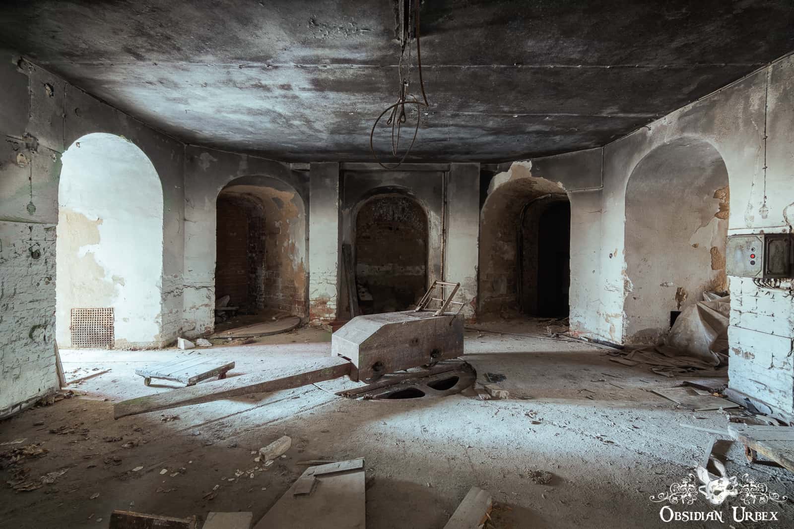 Beneath the (former position of) the black cross is the metal remains of the viewing area. The body would be displayed here, and the bereaved would bid farewell. After this, the corpse was lowered on a platform to the sub-level. This was achieved with a water-pressure operated sinking system. A heavy metal cart awaited below to receive the body. A staff member pushed the cart via a rail system. Directing it onto a turntable. The turntable was used to direct the cart towards one of three furnaces.