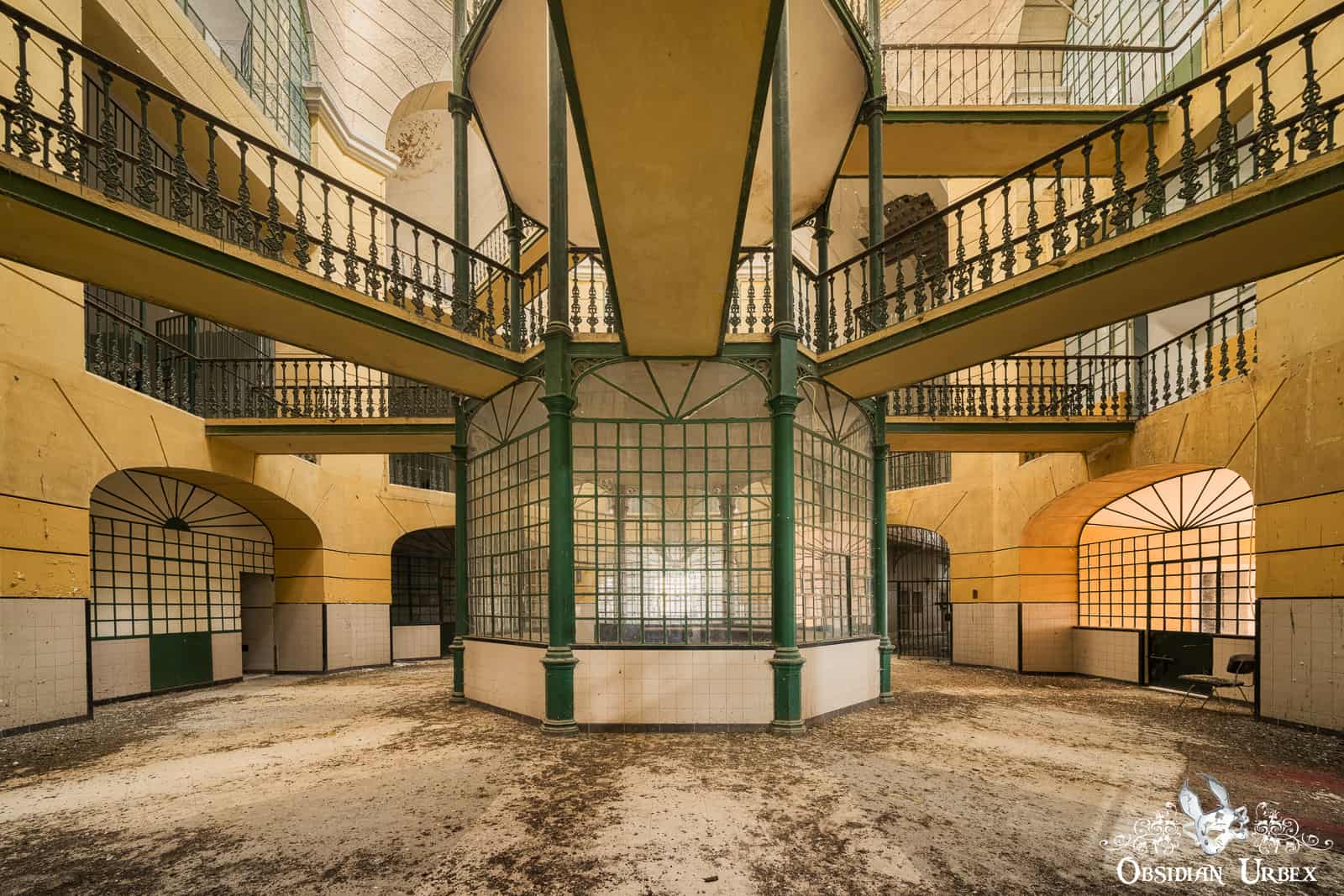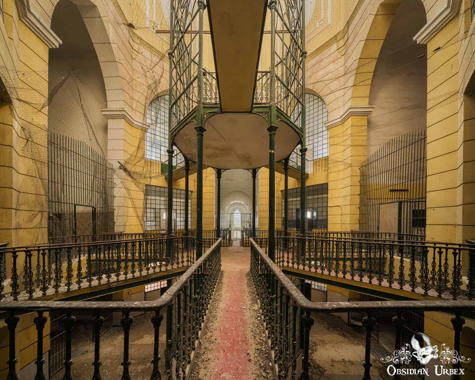 The layout of the Yellow Prison resembles a four-armed cross. There are four wings: one with offices for admin staff and three cell wings. A lofty vaulted ceiling with a sizable rectangular skylight is present in each two storey cell wing. There are over 100 single-occupancy cells in this facility.