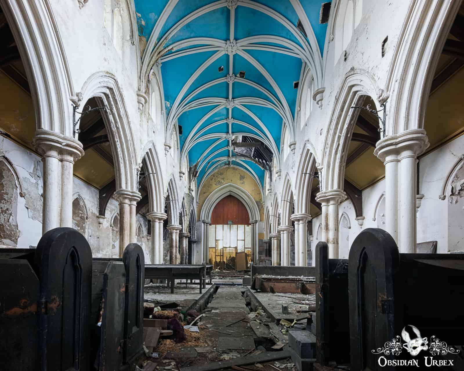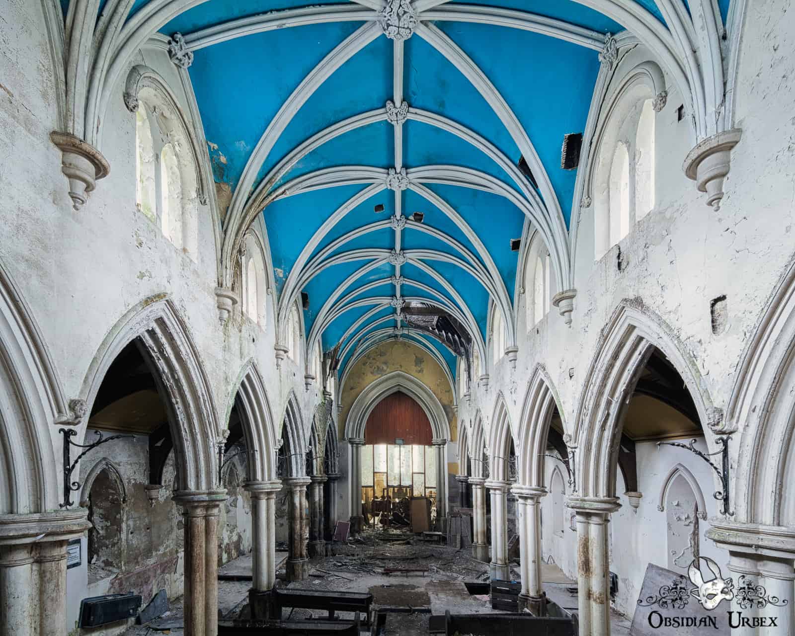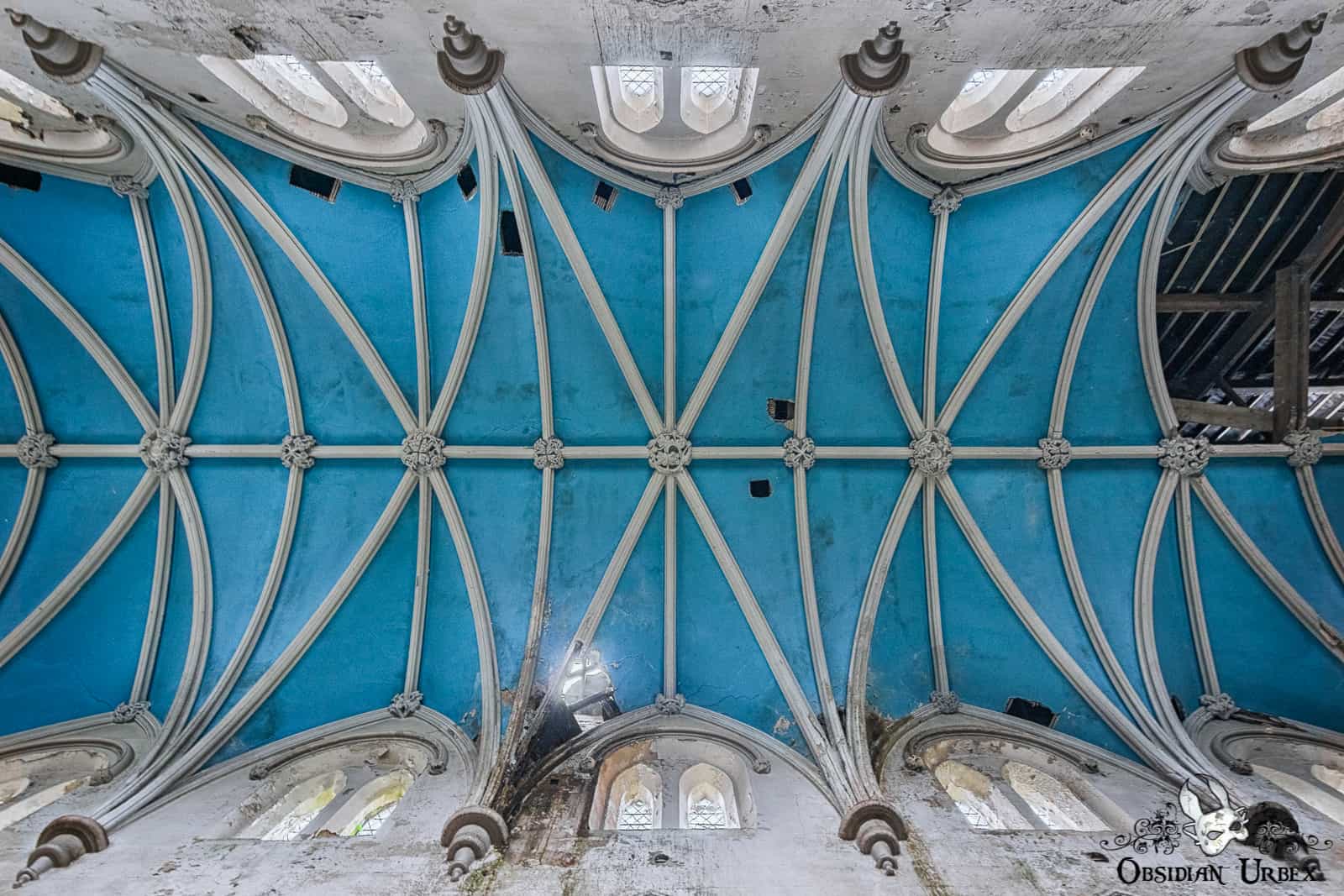 Blue Miranda Church was an abandoned English religious building. Renovation work started in the late 2010s, so it is no longer derelict. I visited the church in 2016, and again in 2017.