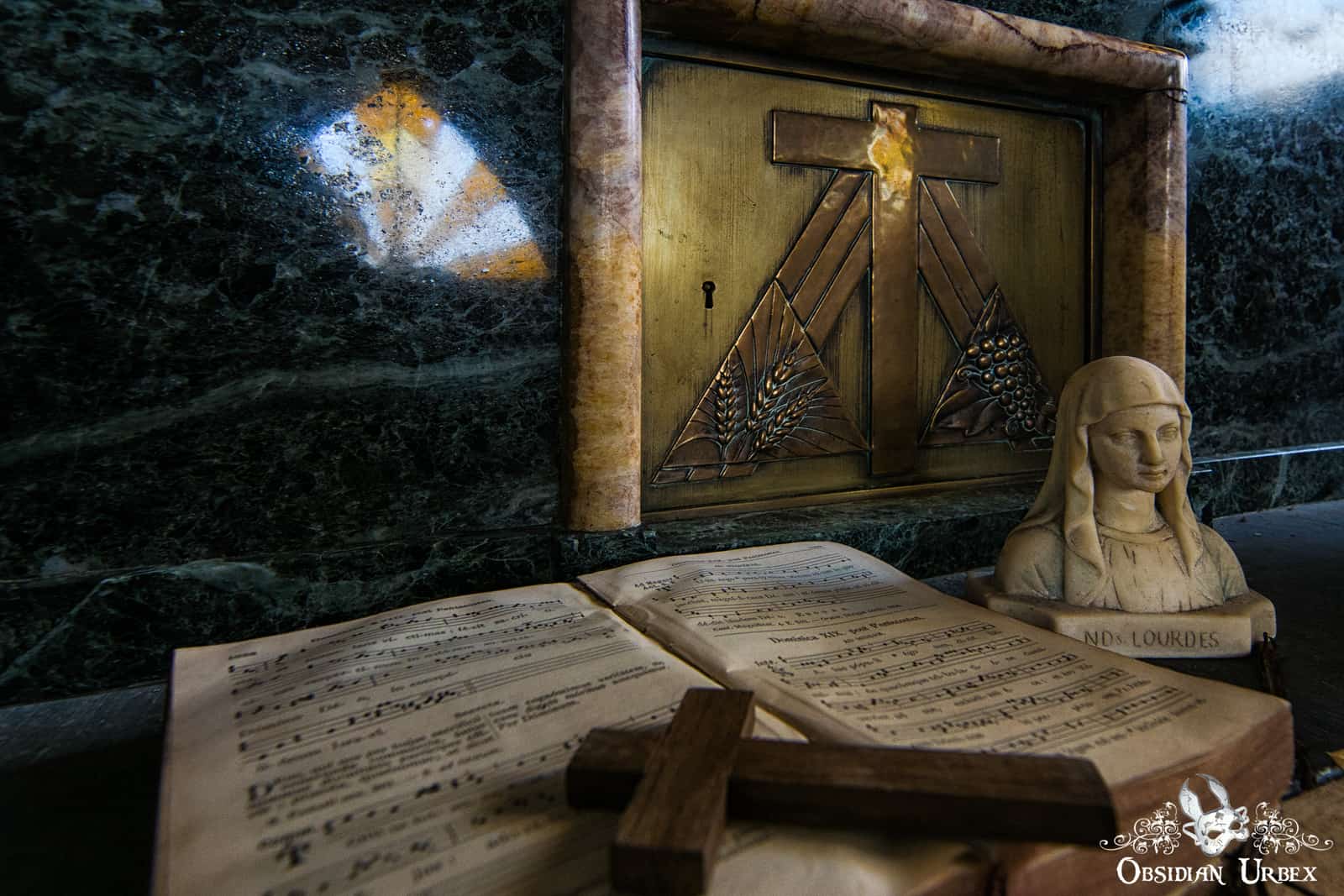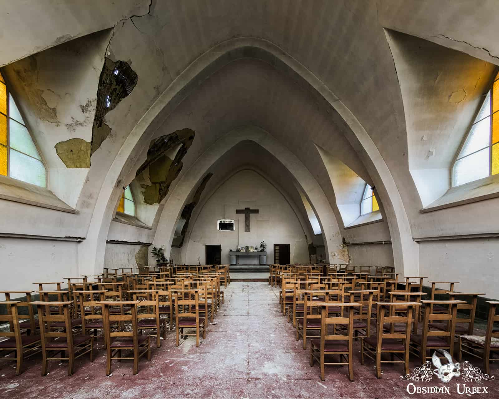 This church was one of the first locations I visited in mainland Europe, during the early Spring of 2016. At that time the church was relatively pristine, with only a few cracks beginning to show on the ceiling and the occasional pile of crumbled plaster on the floor. There were many religious artefacts; a cross, marble Virgin Mary bust, bibles and various hand-made craft items.