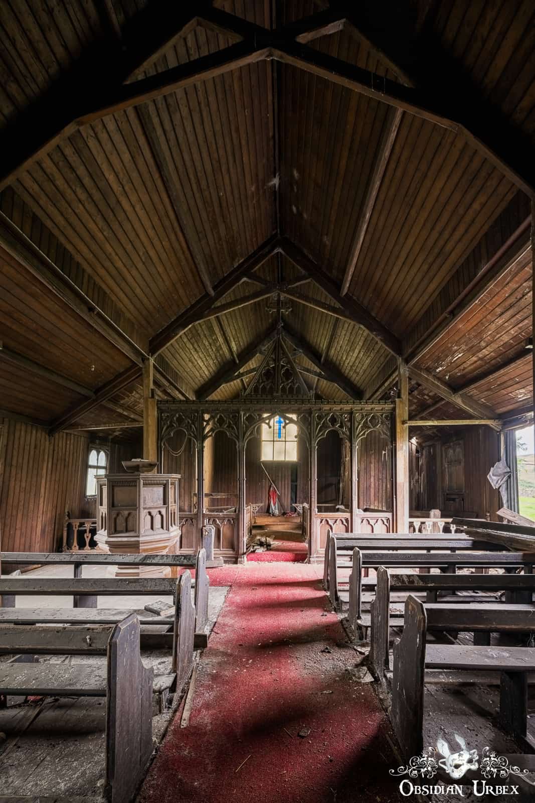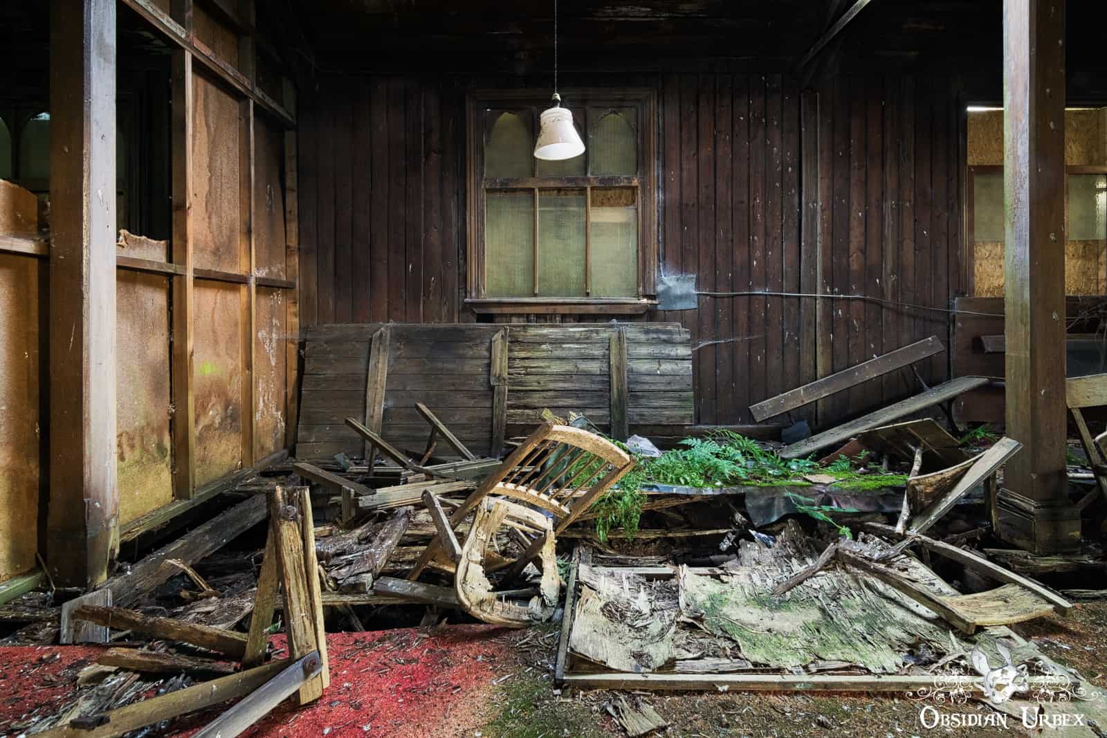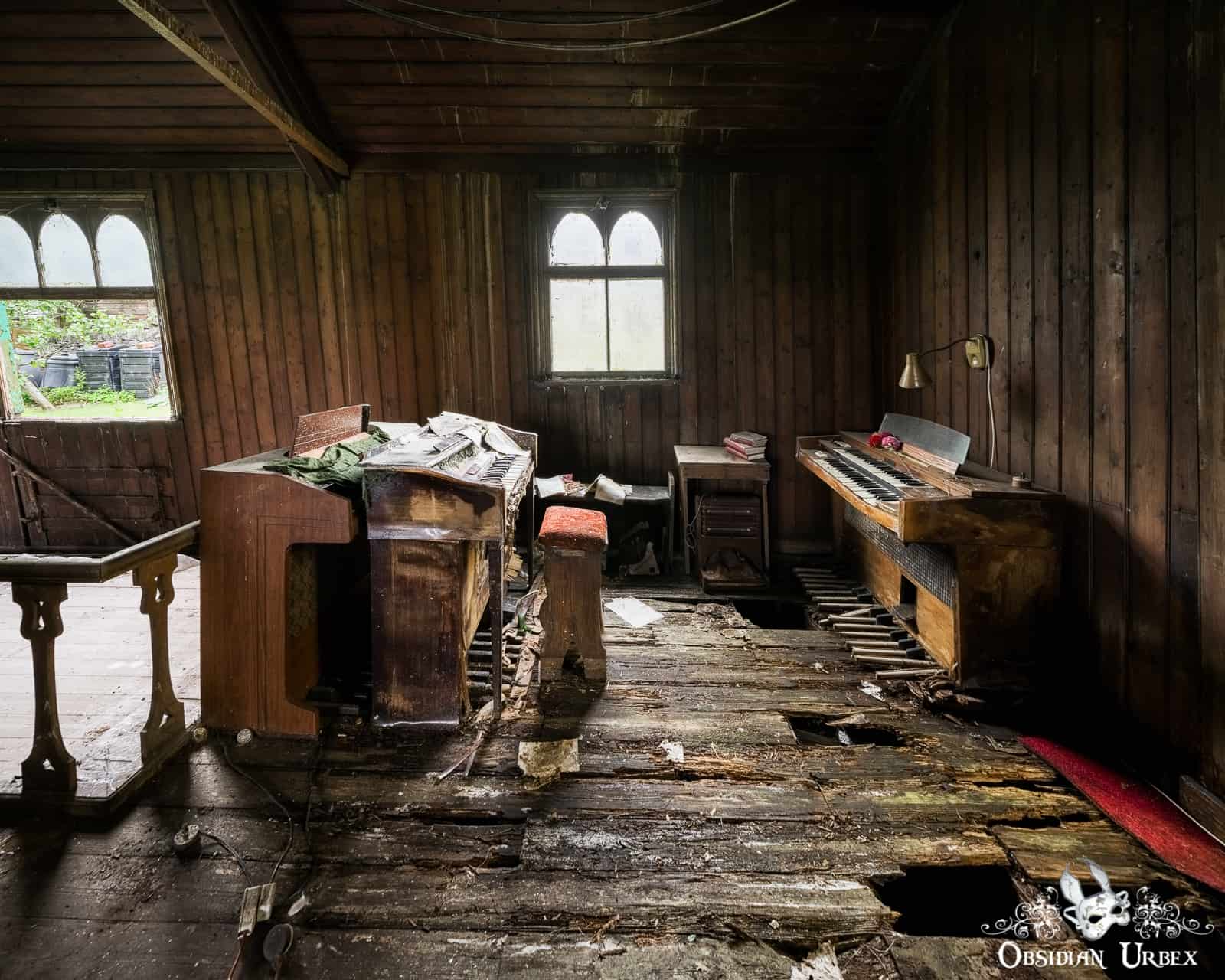 The Iron Church still has wooden furniture, including most of the pews and the pulpit. There are also three mini church organs, all huddle together near the pulpit. The windows are dirty and covered with cobwebs. Some vegetation grows inside, ferns and ivy in different areas of the crumbling church.