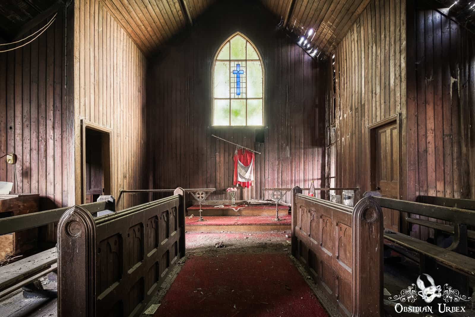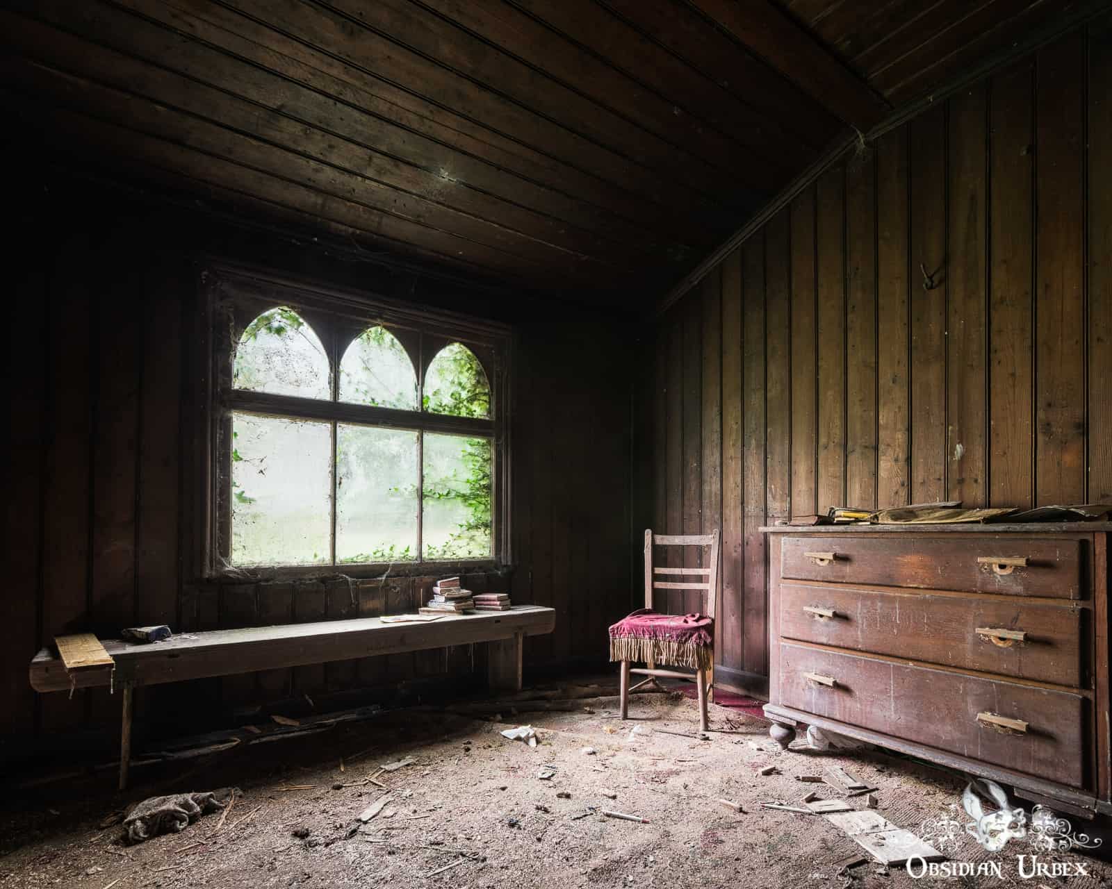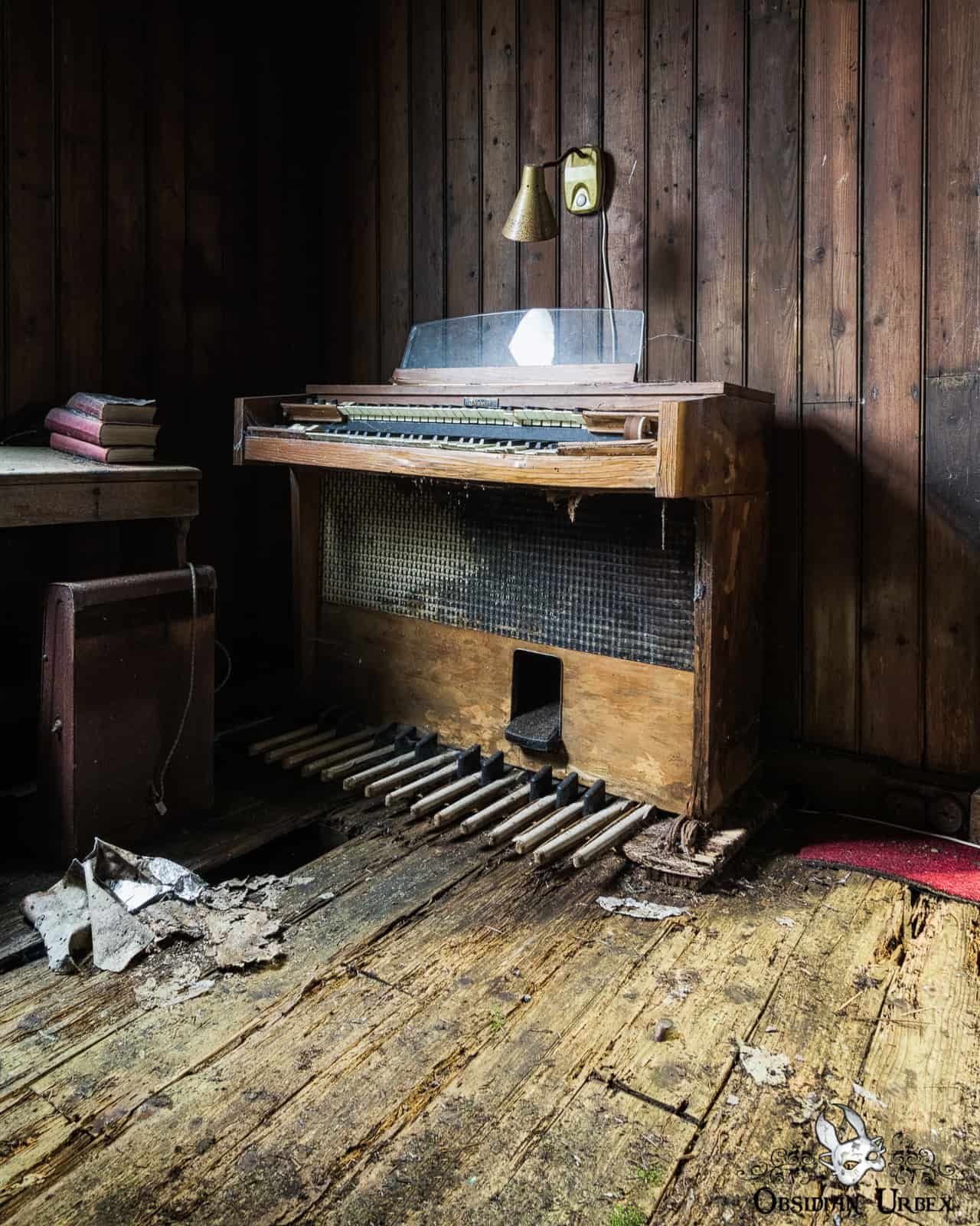 The Iron Church still has wooden furniture, including most of the pews and the pulpit. There are also three mini church organs, all huddle together near the pulpit. The windows are dirty and covered with cobwebs. Some vegetation grows inside, ferns and ivy in different areas of the crumbling church.