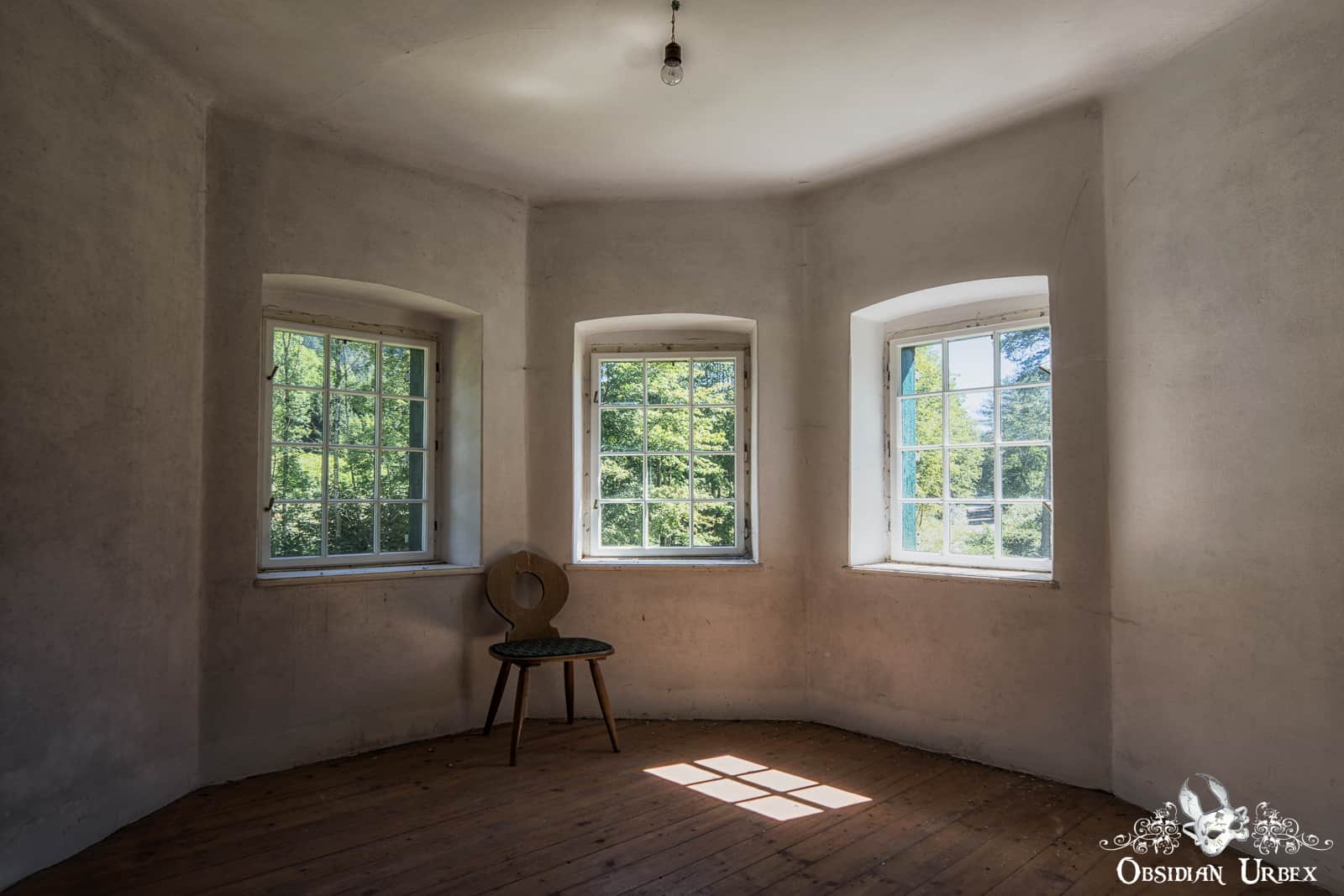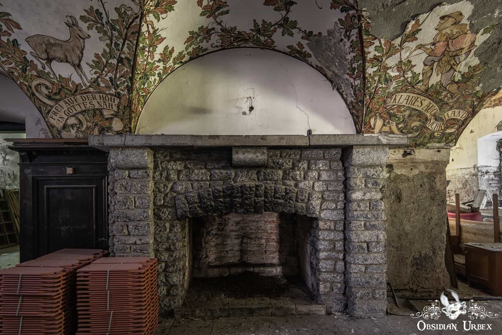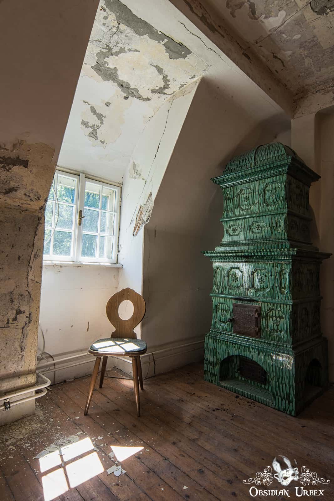 We explored the Baroque Castle In The Forest in the summer of 2016. Indeed, there were signs of renovation. The roof had been patched, and inside the entrance were piles of tiles for further repairs. However, as is often the case, it appears that for some reason the work was stopped.