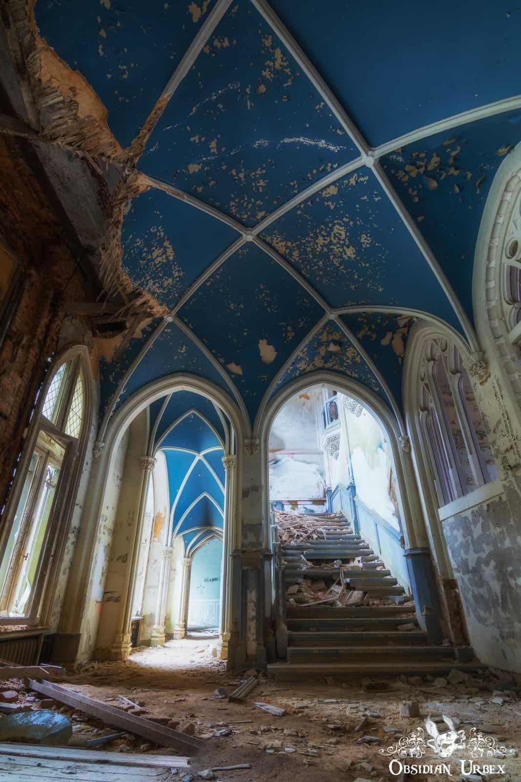 Brightly coloured ceilings with many arches and columns greet you upon entering the main doorway. A large drained pond sat at the back of the Château Miranda, a toad pool. The walls and floors were crumbling. Parts of the structure, specifically the upper floors, were very treacherous in places.
