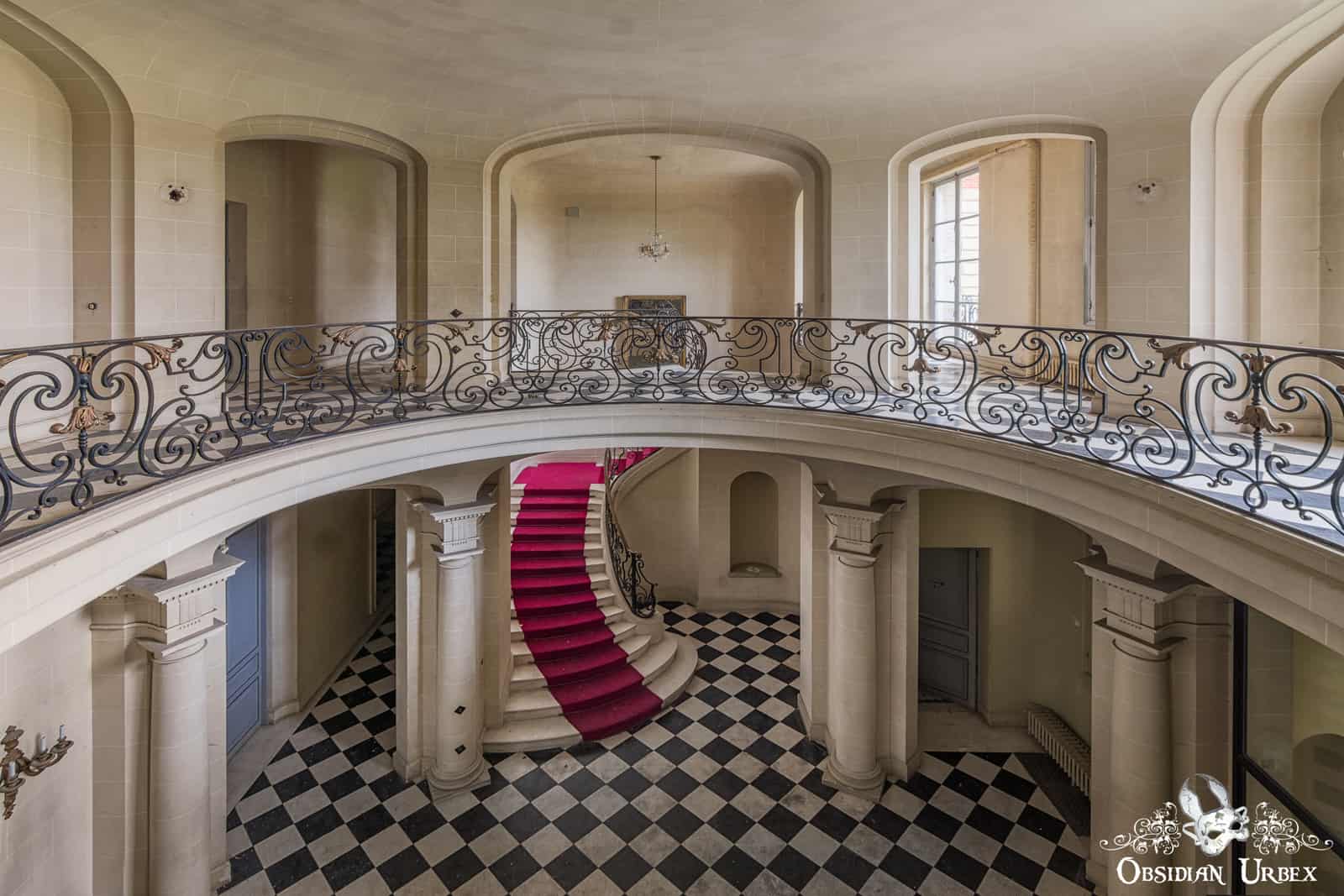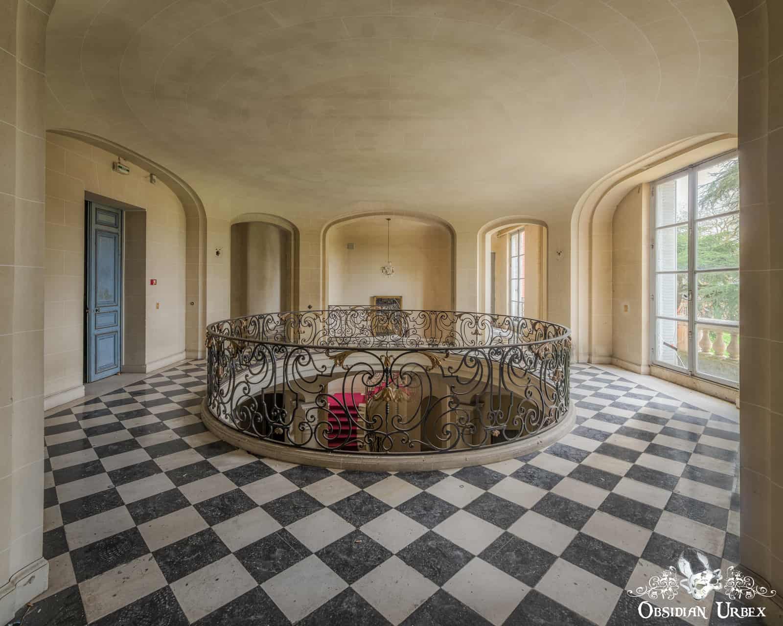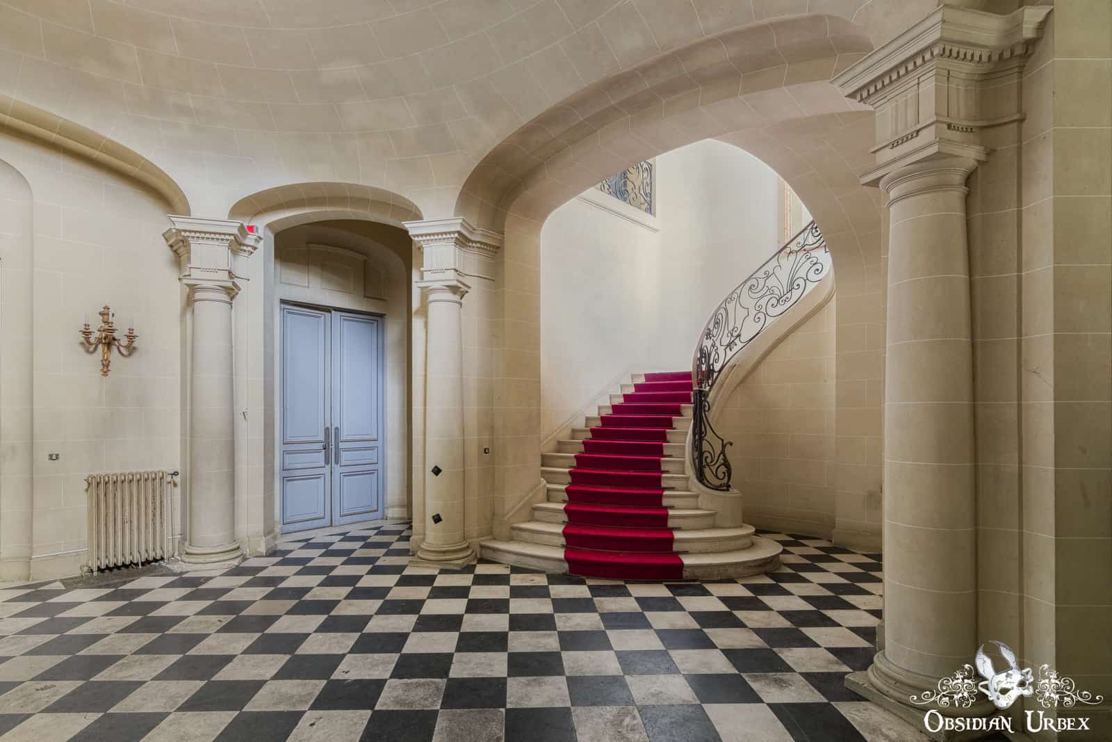 The main draw of Chateau Sarco is the two storey tall, 100m square entry hall. The blood-red carpet covering the wide marble stairs draw your eye like a magnet. The upper landing has a circular cut-out with ornate floral-themed black iron balustrades. Both levels feature chessboard black-and-white chequered tiled floors. Cornflower blue painted doors lead off from the main entrance.