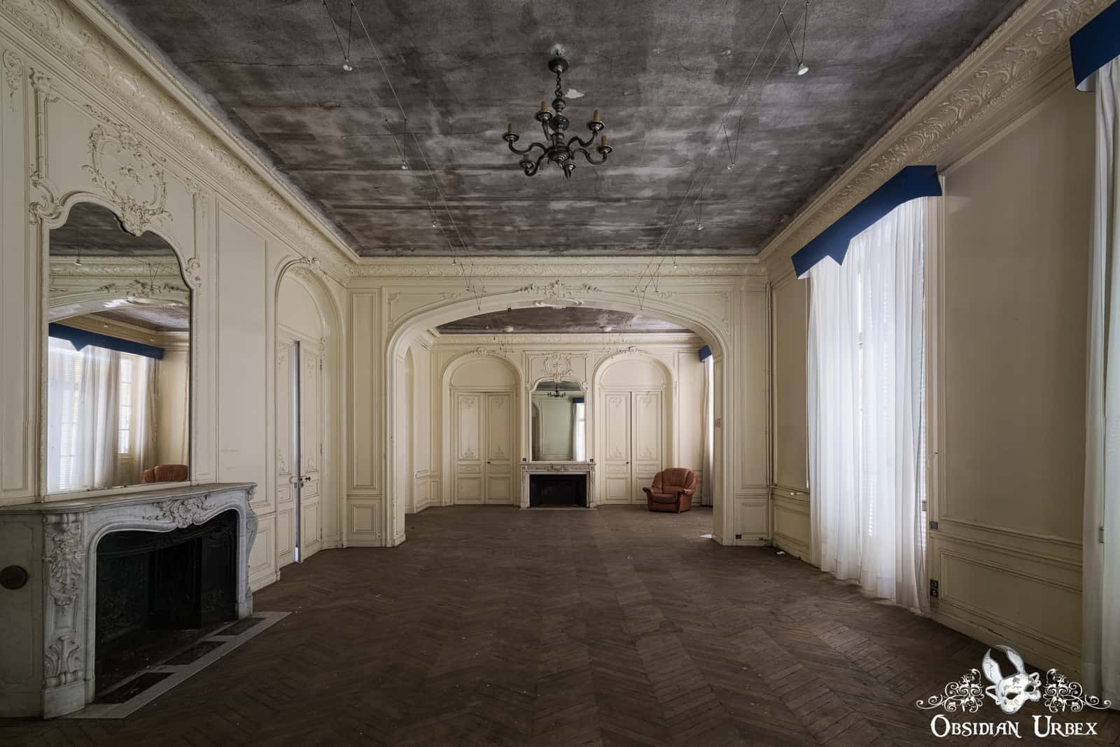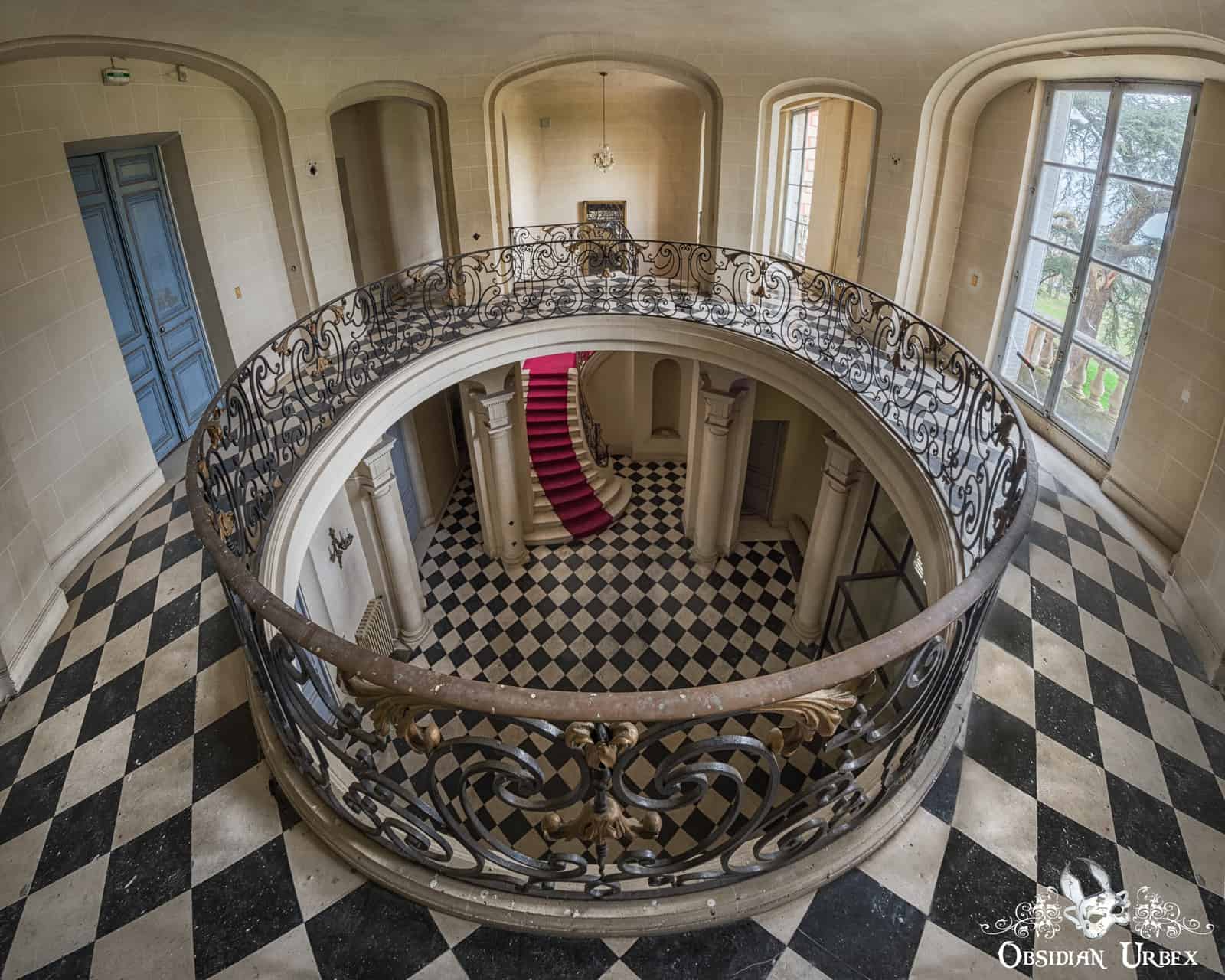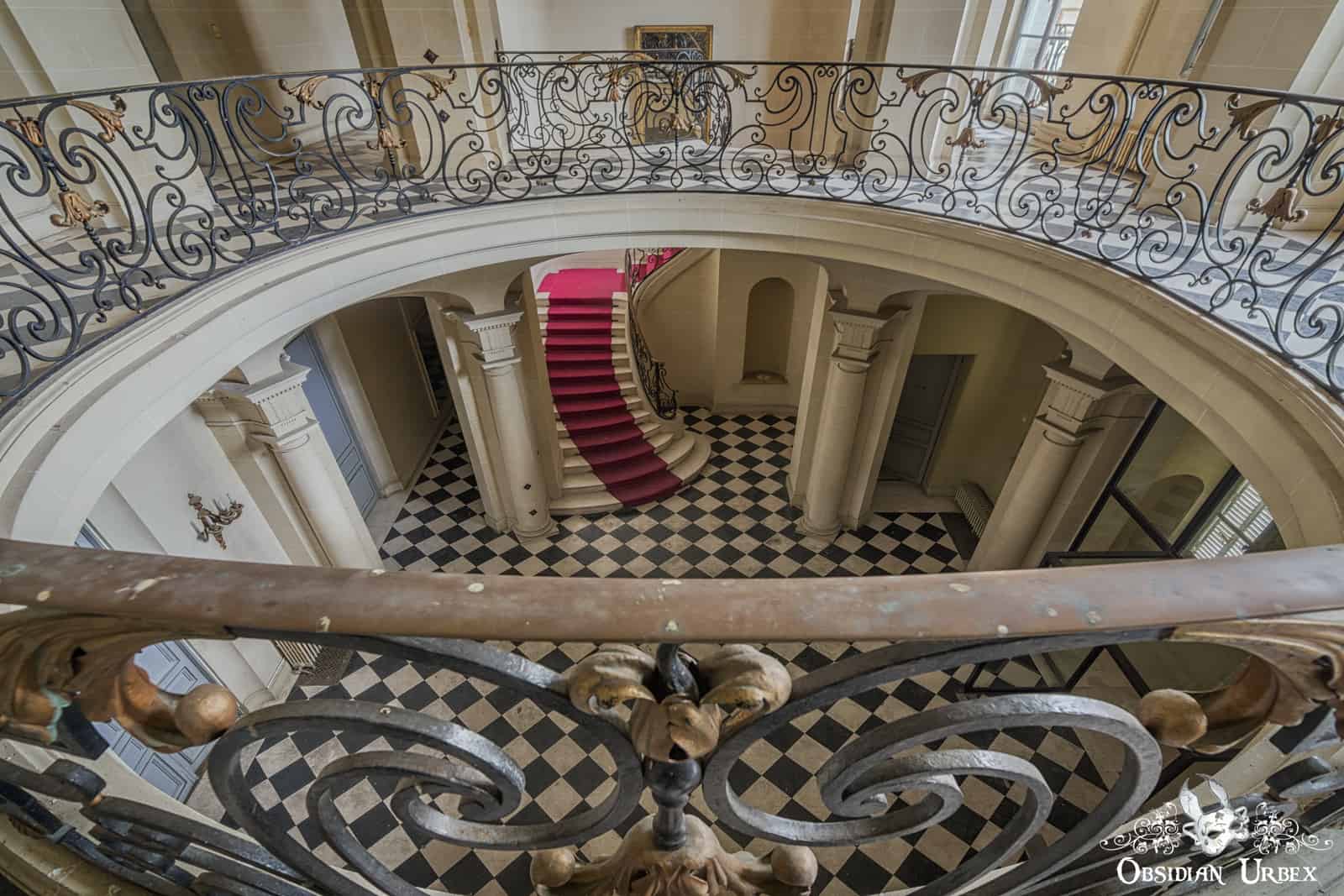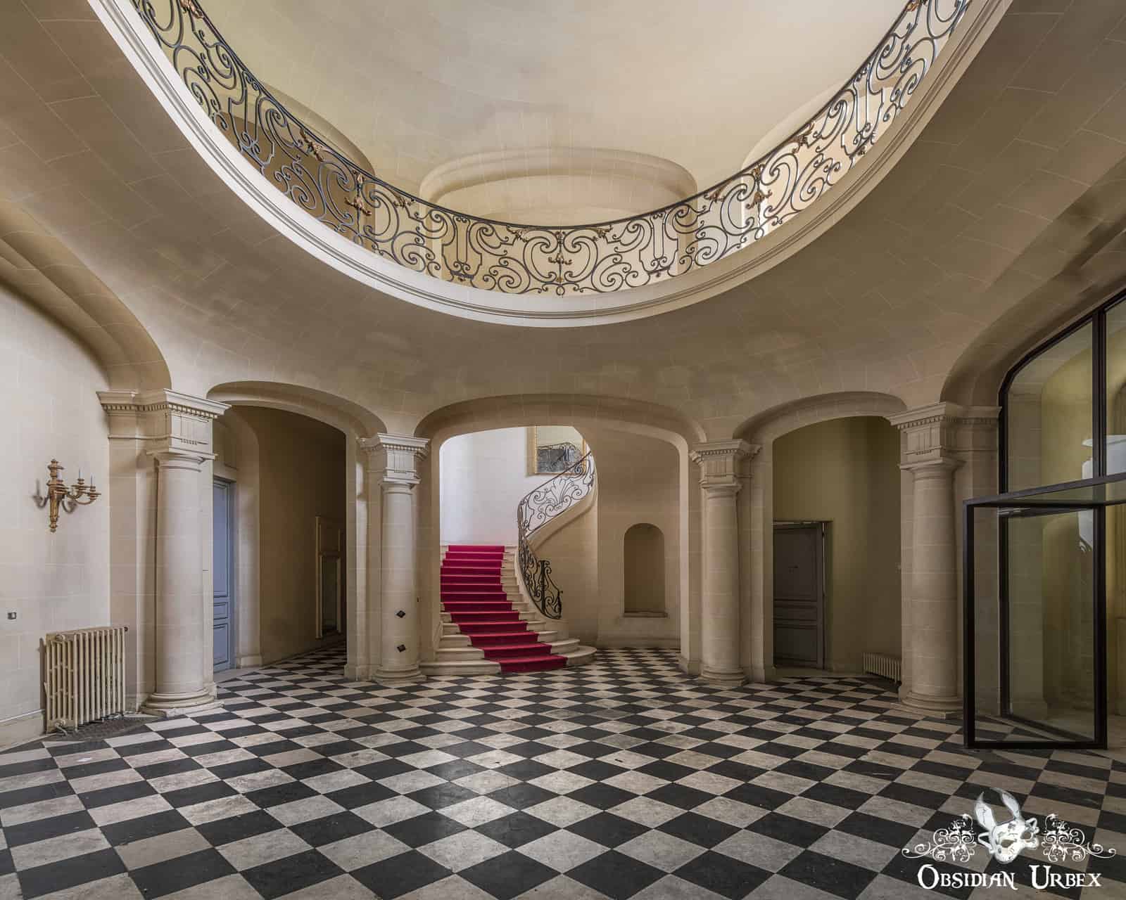 The main draw of Chateau Sarco is the two storey tall, 100m square entry hall. The blood-red carpet covering the wide marble stairs draw your eye like a magnet. The upper landing has a circular cut-out with ornate floral-themed black iron balustrades. Both levels feature chessboard black-and-white chequered tiled floors. Cornflower blue painted doors lead off from the main entrance.