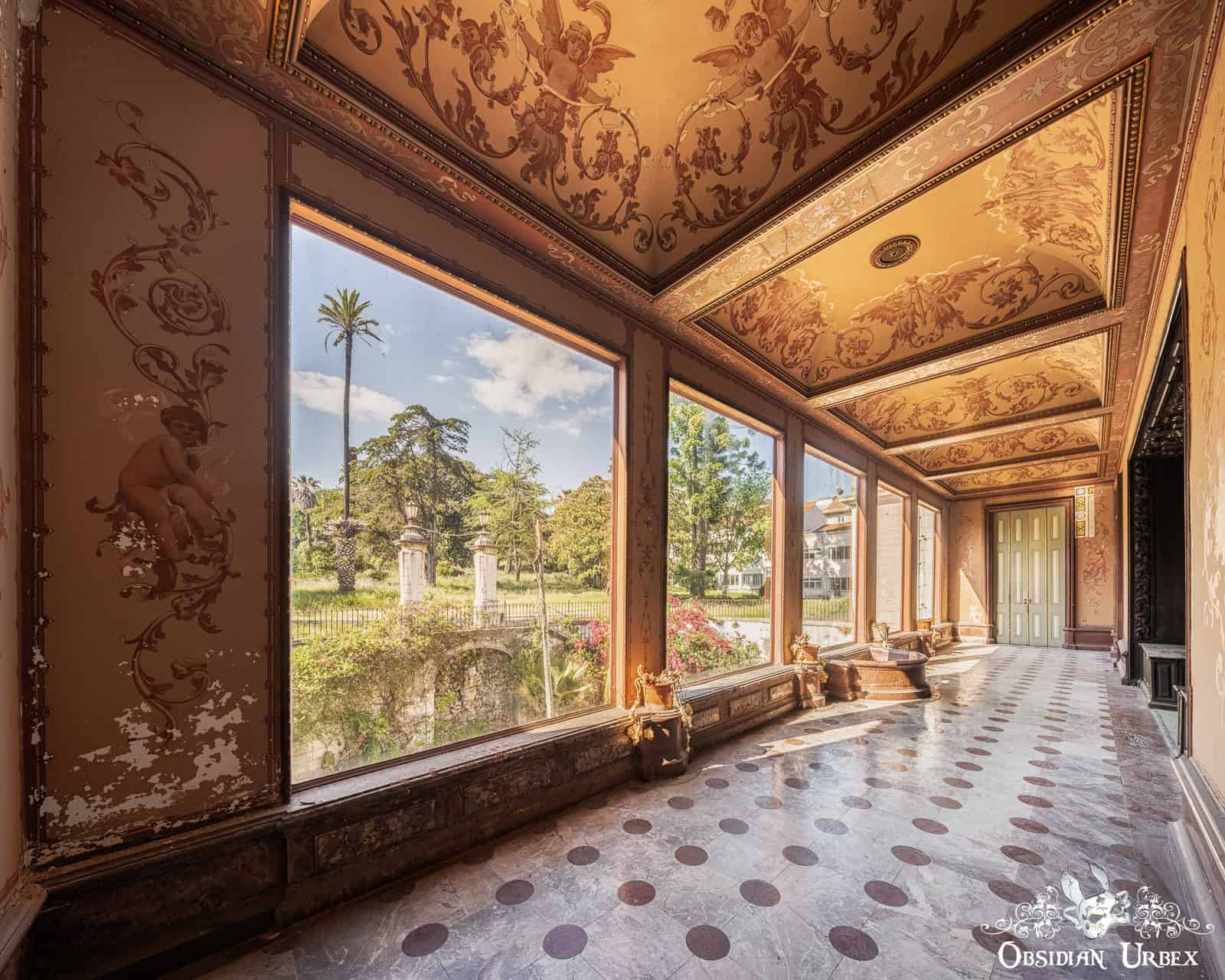 There are many, many more beautiful rooms. A large hallway with the walls covered in green silk and wooden panelling. A gallery with large windows facing the large and once beautiful gardens. Additionally, there is a ballroom, a music room, and a theatre. There are two conservatories or greenhouses, one at either end of the palace.