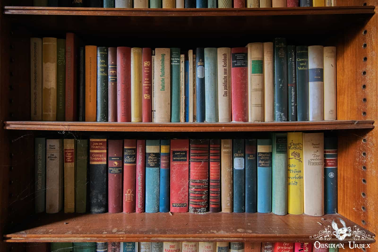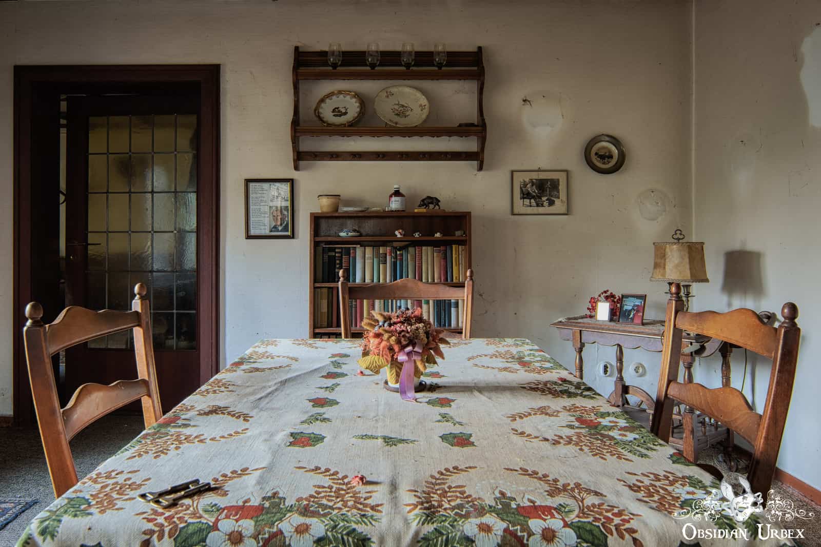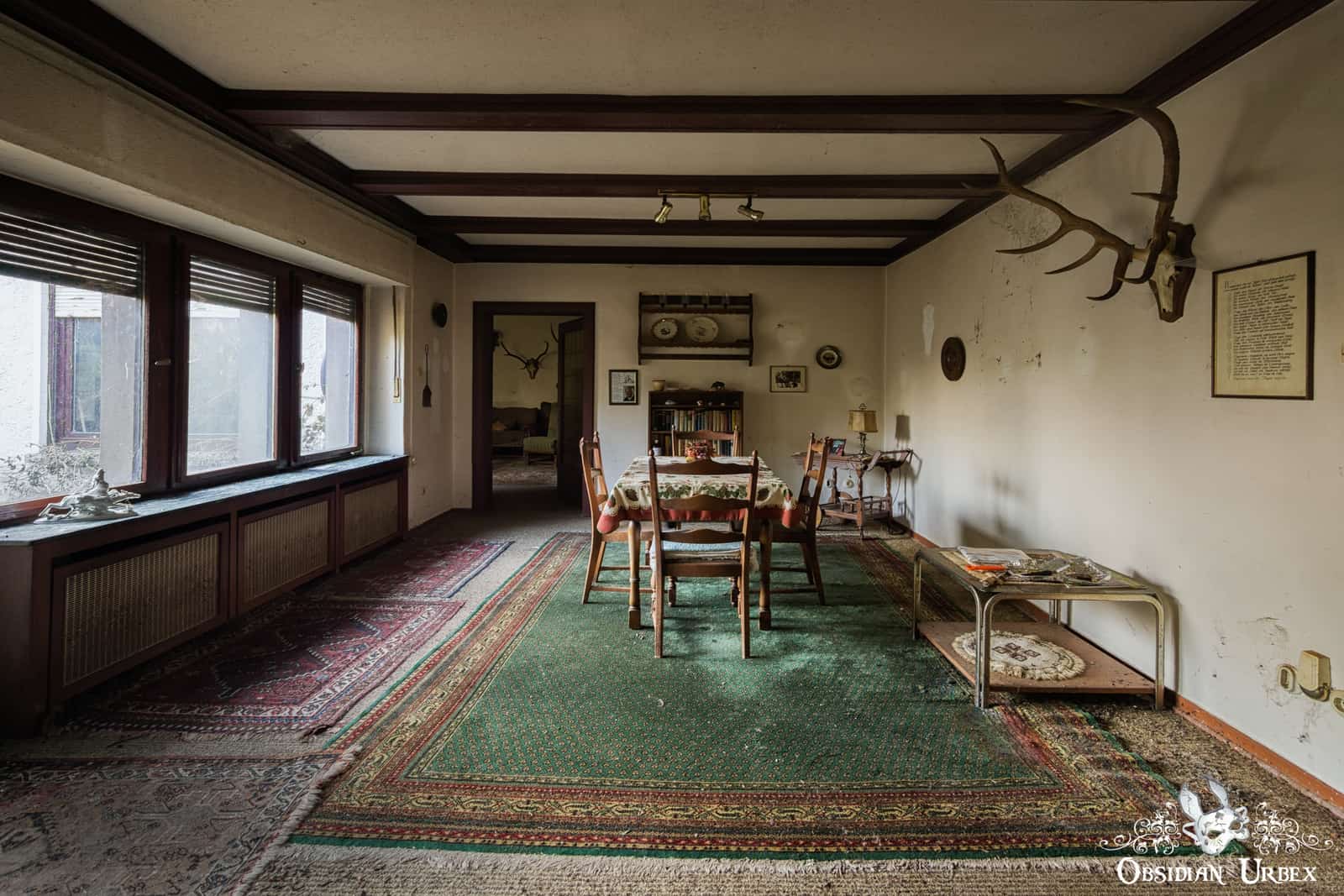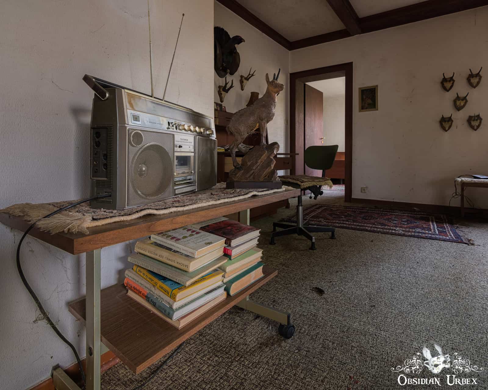 In the dining room there are other signs of removed items from the walls; circular outlines suggesting ornamental plates, and the telltale outline of missing small taxidermy plaques. The furniture here is simple, and decorations minimalistic. A single small bookcase resides here, filled with various German-language books. There is a blocky 1980s/1990s style “boom box”; a portable radio with cassette player, in retro silver.