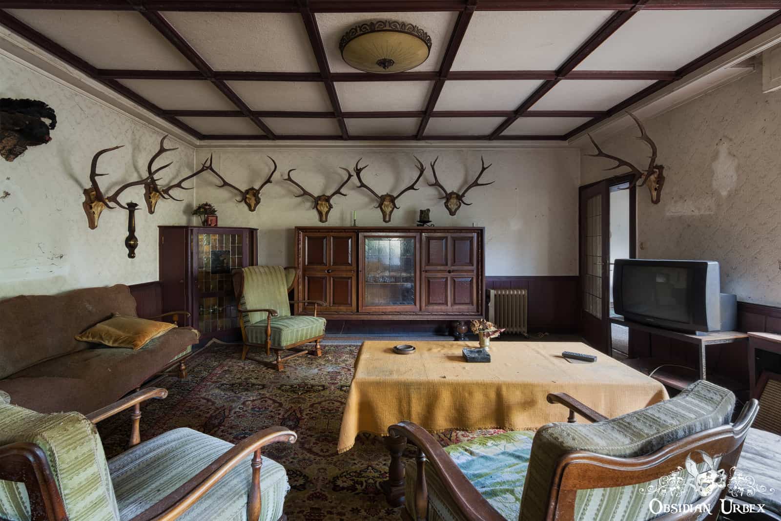 The living room is of a rustic style, and has is simply decorated. The furniture is old and mismatched. There is an old CRT TV, which is starting to show signs of damp and mold. Above the larges sofa, there is a clear space where the ghost outline of a frame is seen. The outline is interesting and raises the question of why was this taken and so many other ornaments and trophies left.