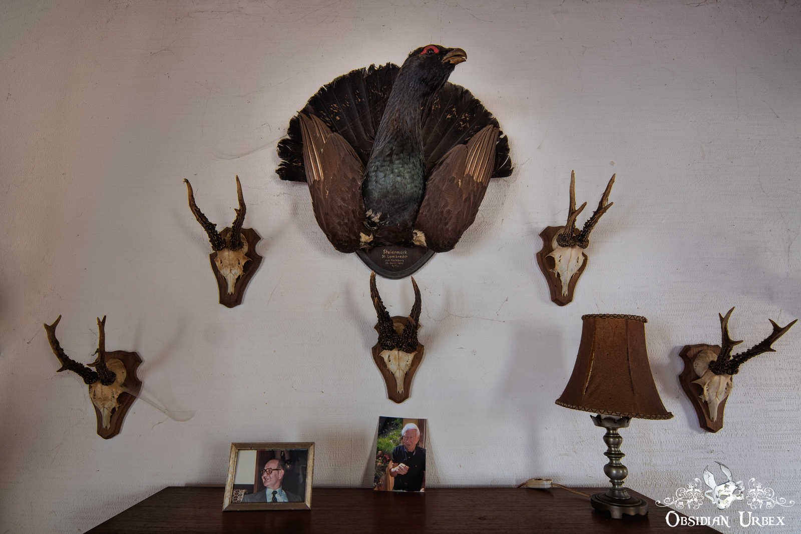 There is an old writing bureau at the far end of the dining room, which is adjacent to the sadly ransacked bedroom. Like the rest of the Hunter’s House, the decoration is simple and consists mainly of taxidermy deer skulls. There is a large stuffed bird, the wings bent up and the tail feathers fanned out in a posthumous display.