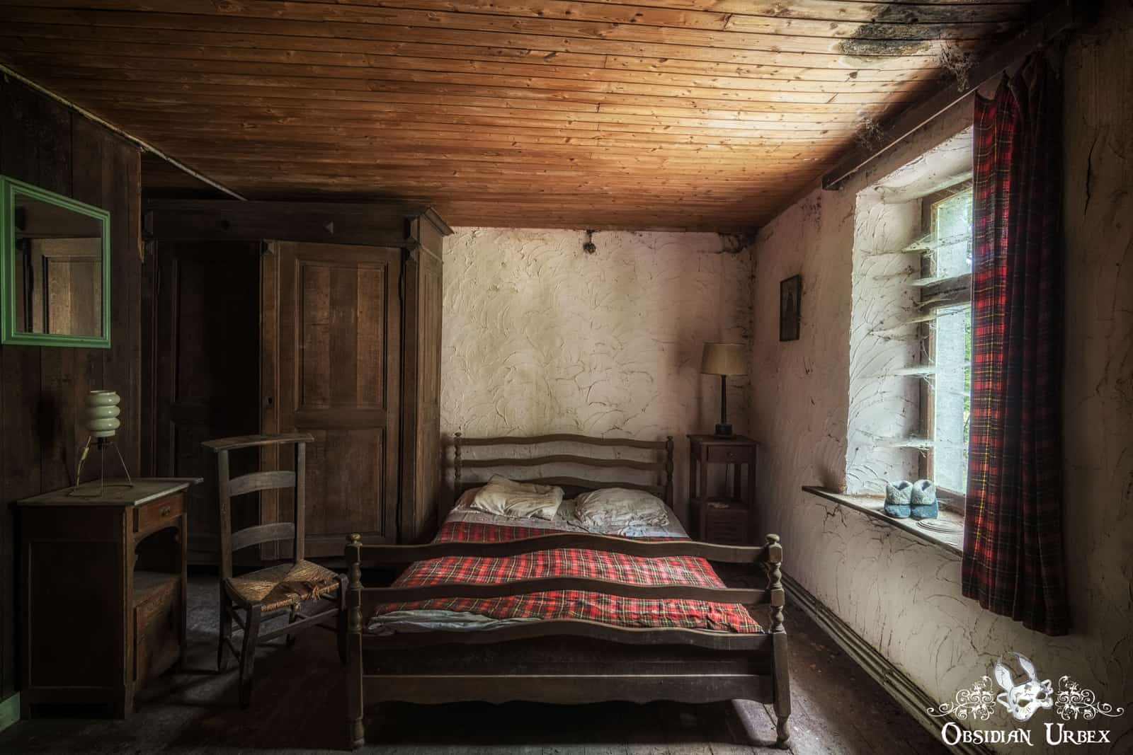 Up the narrow and rickety wooden stairs are two small bedrooms. Beds are simple dark, heavy wood with a traditional and frugal feel. Lovely rustic furniture remains in pristine, but dusty condition. A heavy tartan-pattern blanket lies neatly on top of the bed. Blue slippers sit on the window ledge, unlikely their original position and more likely a staged photo by another photographer taking advantage of the light streaming through cob-webbed windows. Pictures and mirrors still hang on the walls, and quirky old-fashioned lamps sit upon dusty bedside tables.