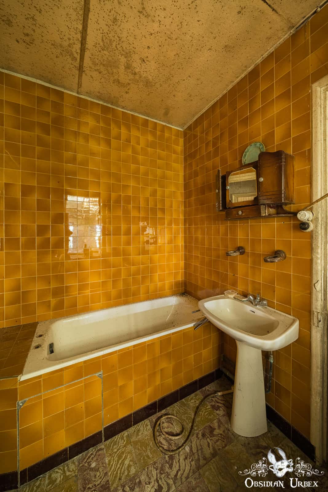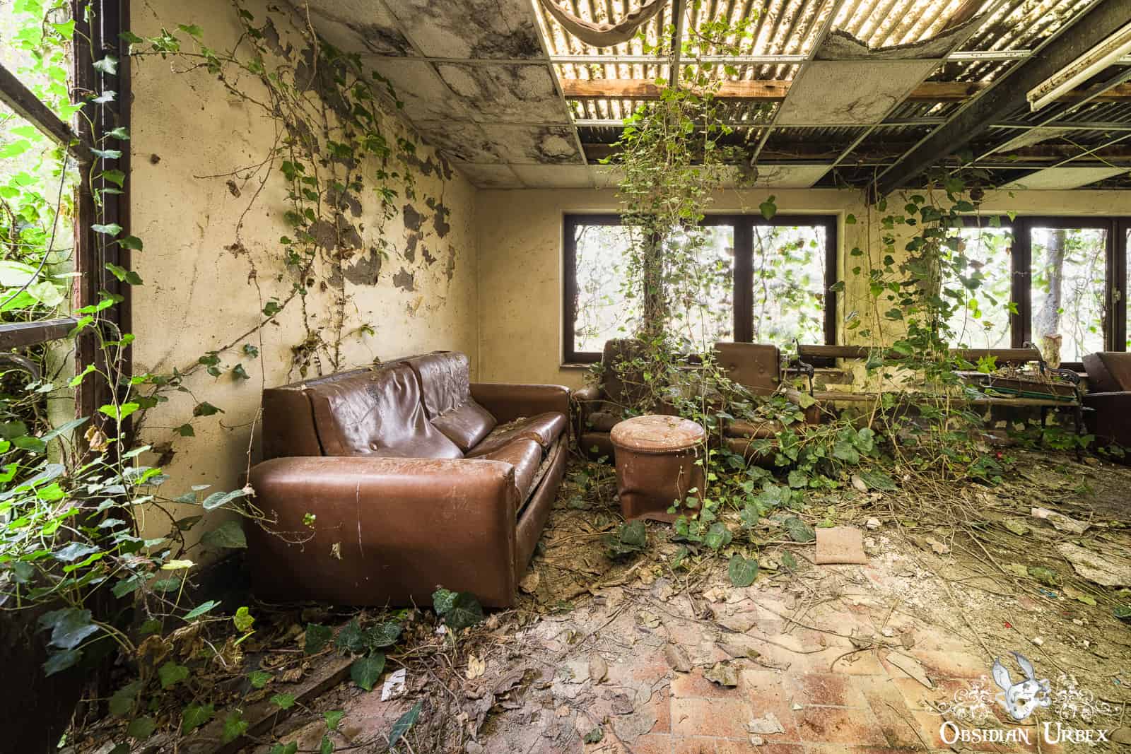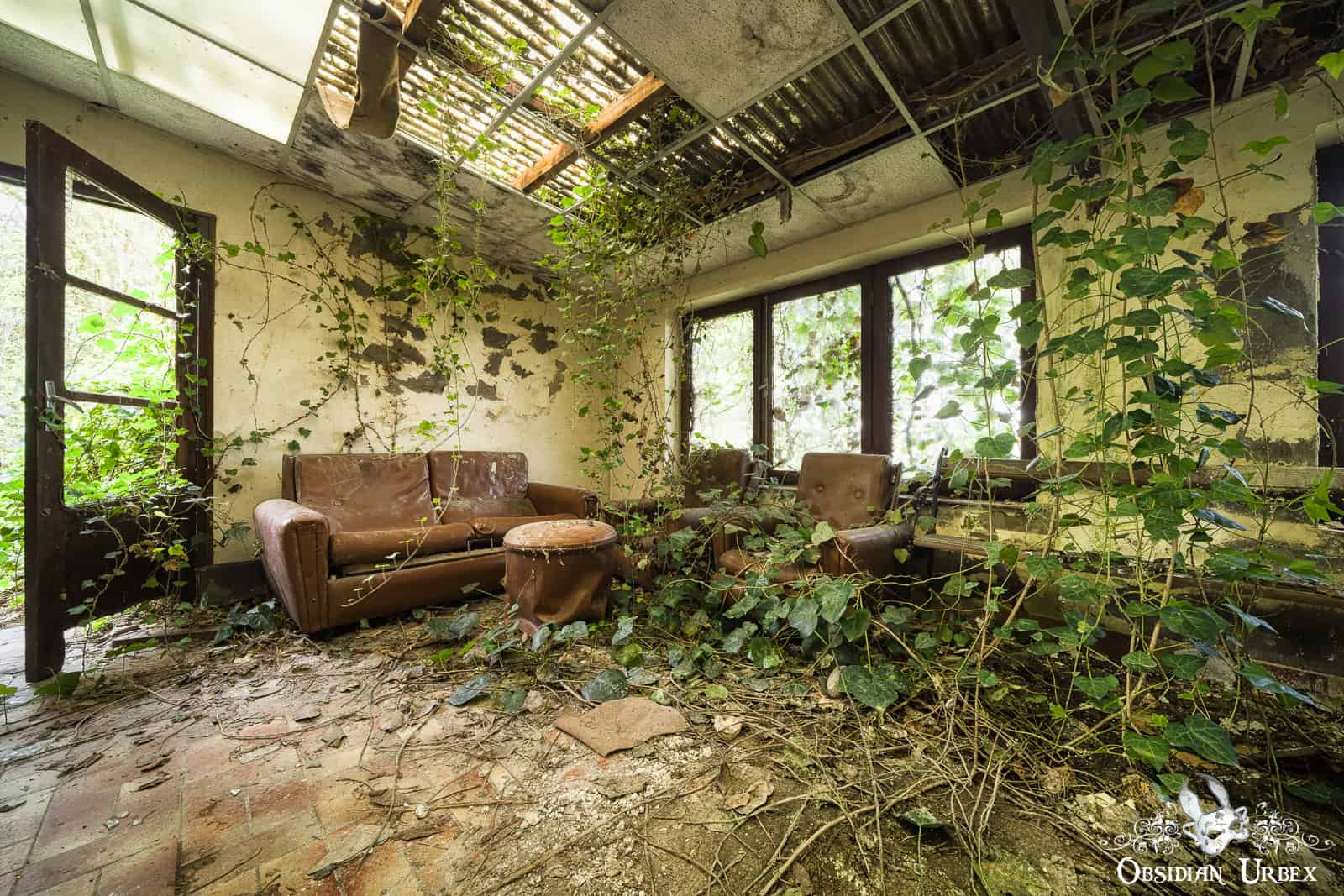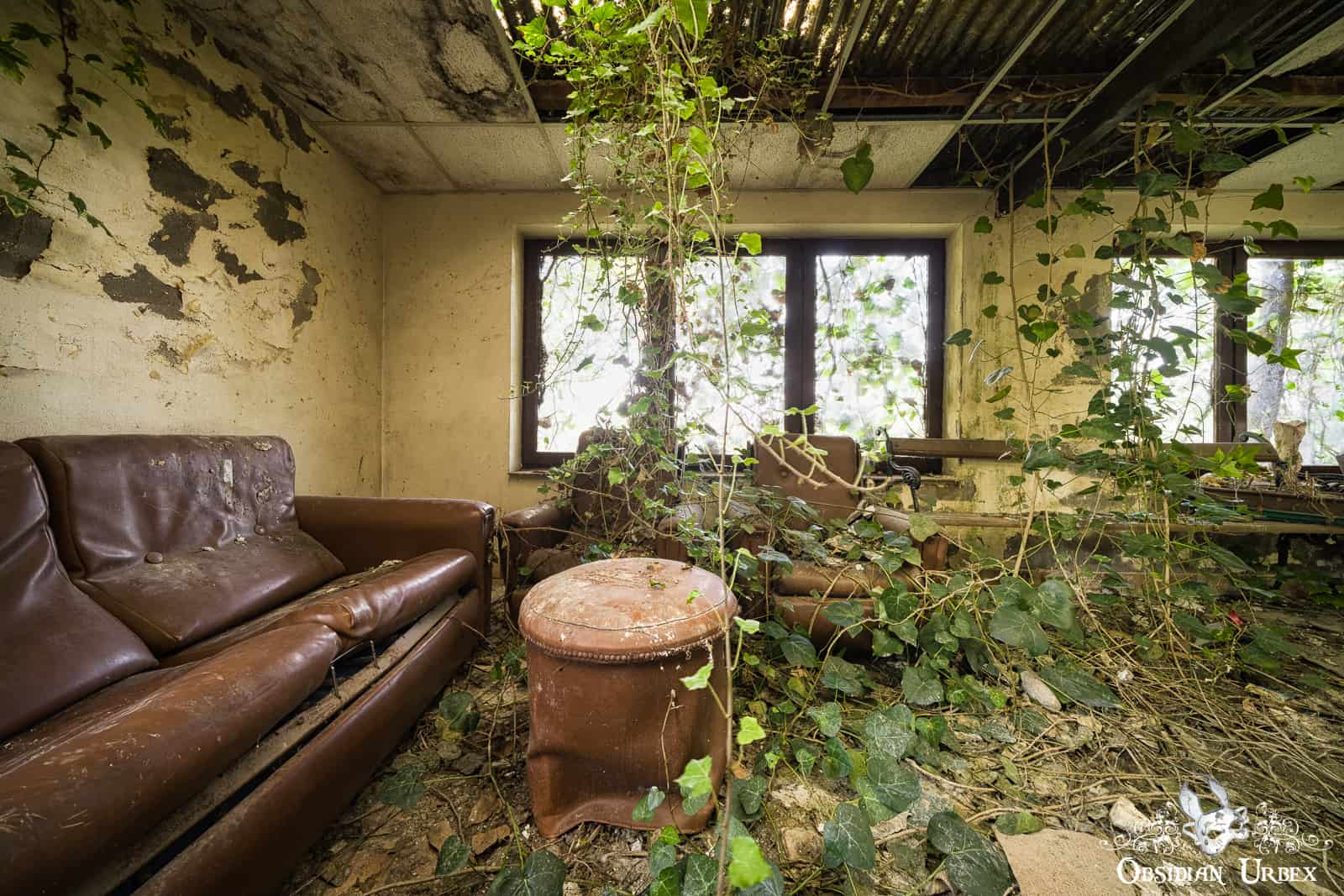 At some point, it appears that the Maison Therese was extended. A large room spans the entire length of the house on the rear side, seemingly a later addition. It seems to be a mix of a mixed function area; conservatory, sitting room, laundry area as well as as a place for potting plants. There is a dusty orange sofa and two chairs pushed in a corner. They create an interesting photographic scene, thanks to invading ivy cascading down from the skylight and in through the broken door. The ivy also creepers across the chairs and floor, the green contrasting with the orange leather three piece suite and footstool.