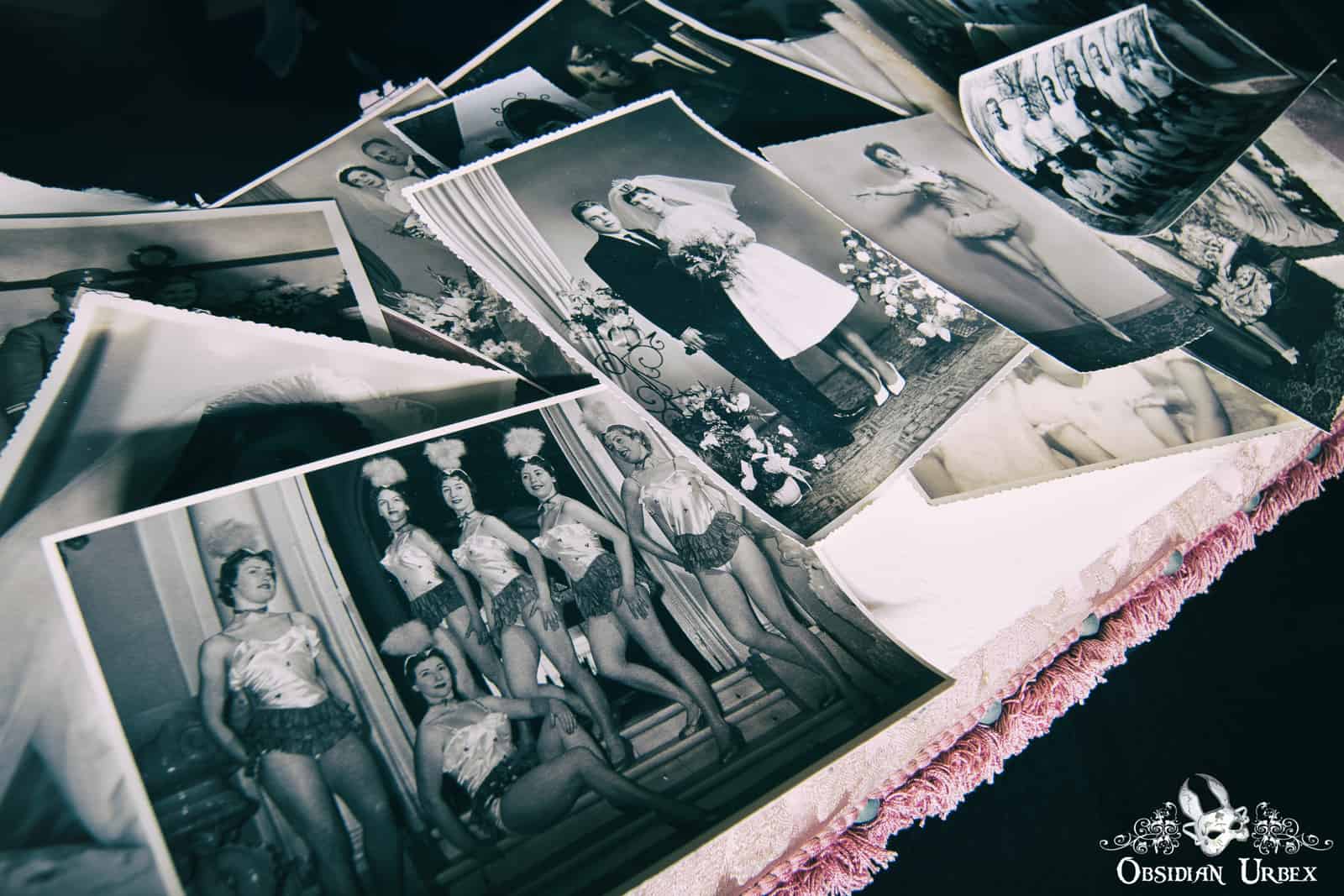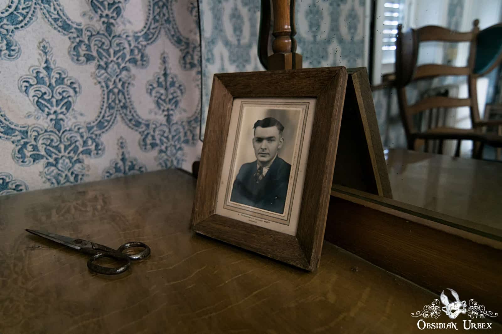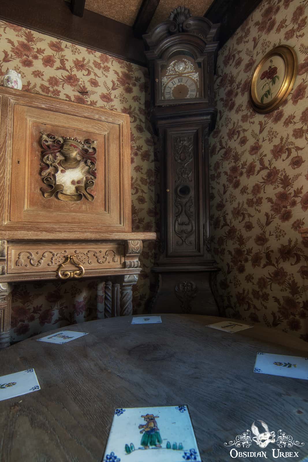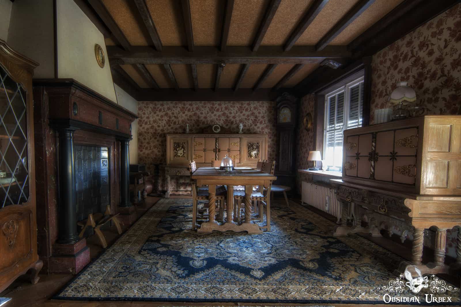 The furniture in the lounge is very grand, all antique wood and leather. A crystal decanter sits on a side table, with very elegant long-stemmed glasses which are brightly coloured. A large blue and white embroidered rug cover the floor in front of a large and ornate dark wood fireplace, complete with engravings. A large heavy wooden table with many chairs, still with table cloth and decorative tableware. A grandfather clock stands in the corner, silent. Framed photographs of the owners can be seen on the wall, and scattered lose prints sit on a footstool. The sun-faded outlines showing the ghosts of old wall-mounted picture frames suggest that a lot of these have been taken from the dining room, either by the owners or persons unknown