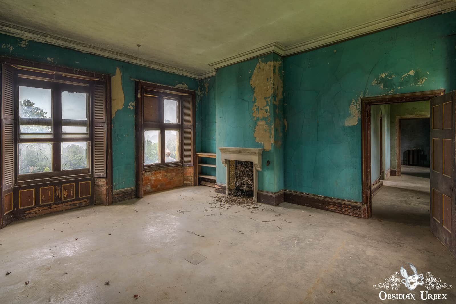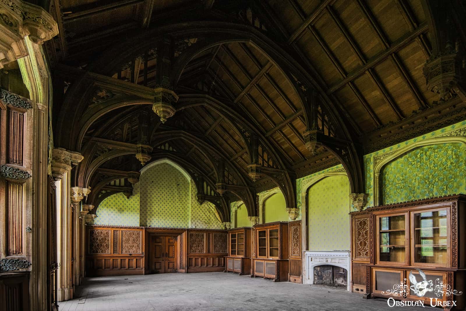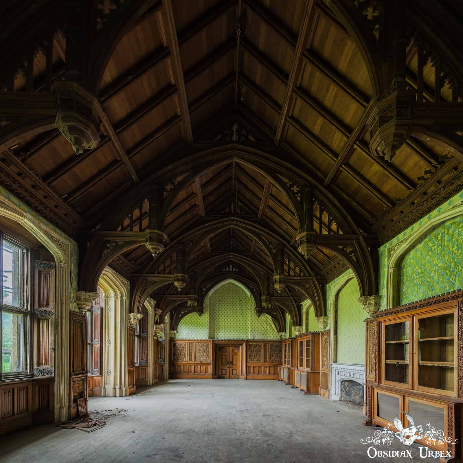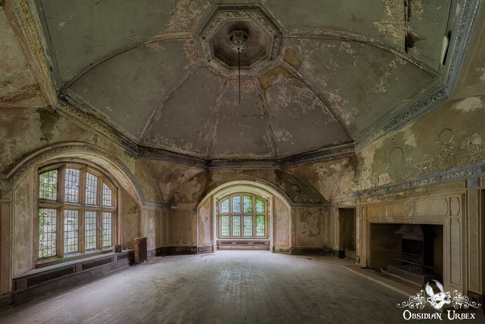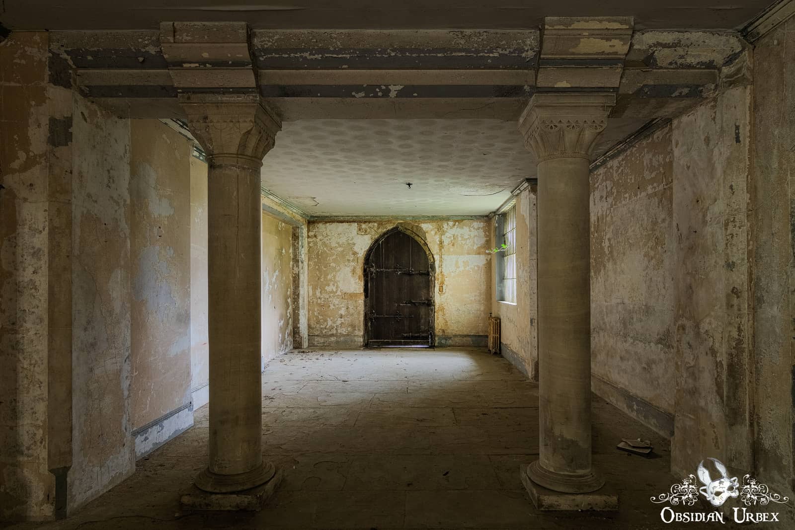 Several areas of the upper floors have collapsed after decades of neglect, succumbing to water ingress from the dilapidated roof. The empty limestone corridors feature various arches and decorative Corinthian-style columns. A ground floor room in the west-wing is circular in shape, and features a shallow domed ceiling.