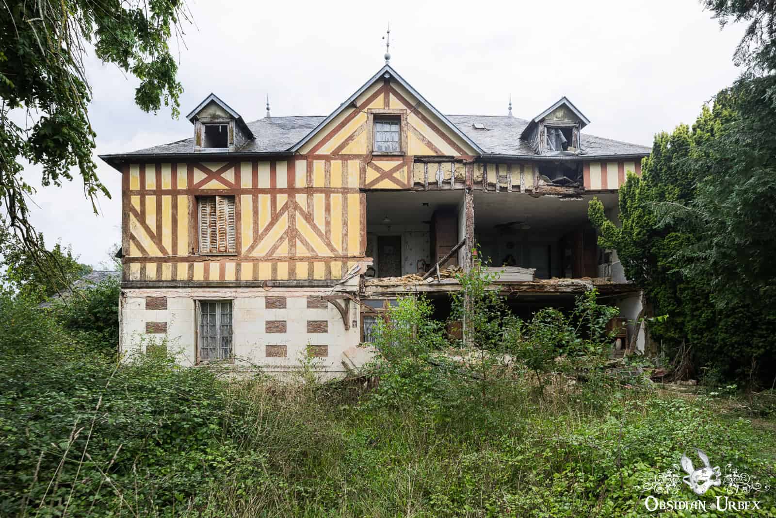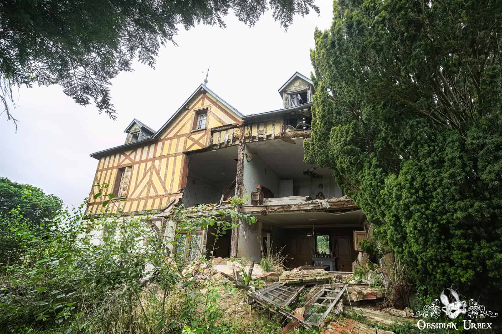 It is a charming example of a traditional half-timbered home, an architectural style common in this region of northern France. Although the origins of this type of construction date back to the fourteenth century, this one is likely from the eighteenth and nineteenth centuries. The house features a steeply pitched roof with dormer windows, another hallmark of Norman design. Its façade, or what’s left of it, beautifully showcases the half-timbered construction. The wooden beams (timbers) are exposed and painted in contrasting colours against the plastered sections. In this case, redish-brown timbers against yellow plaster.