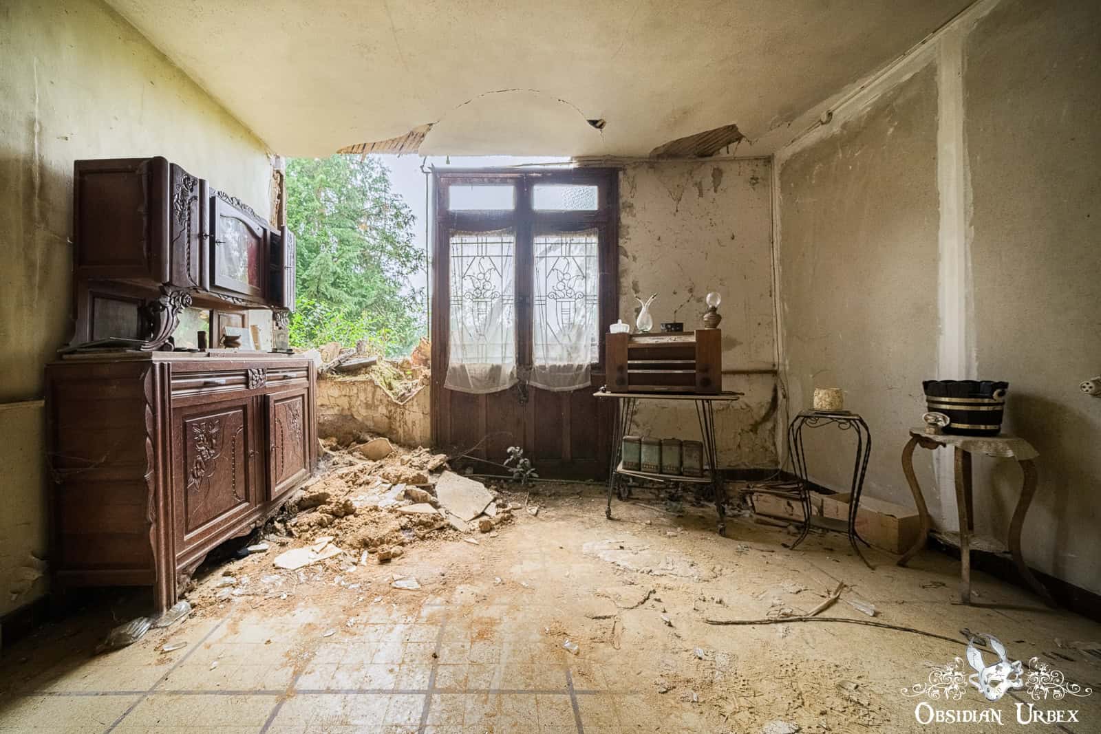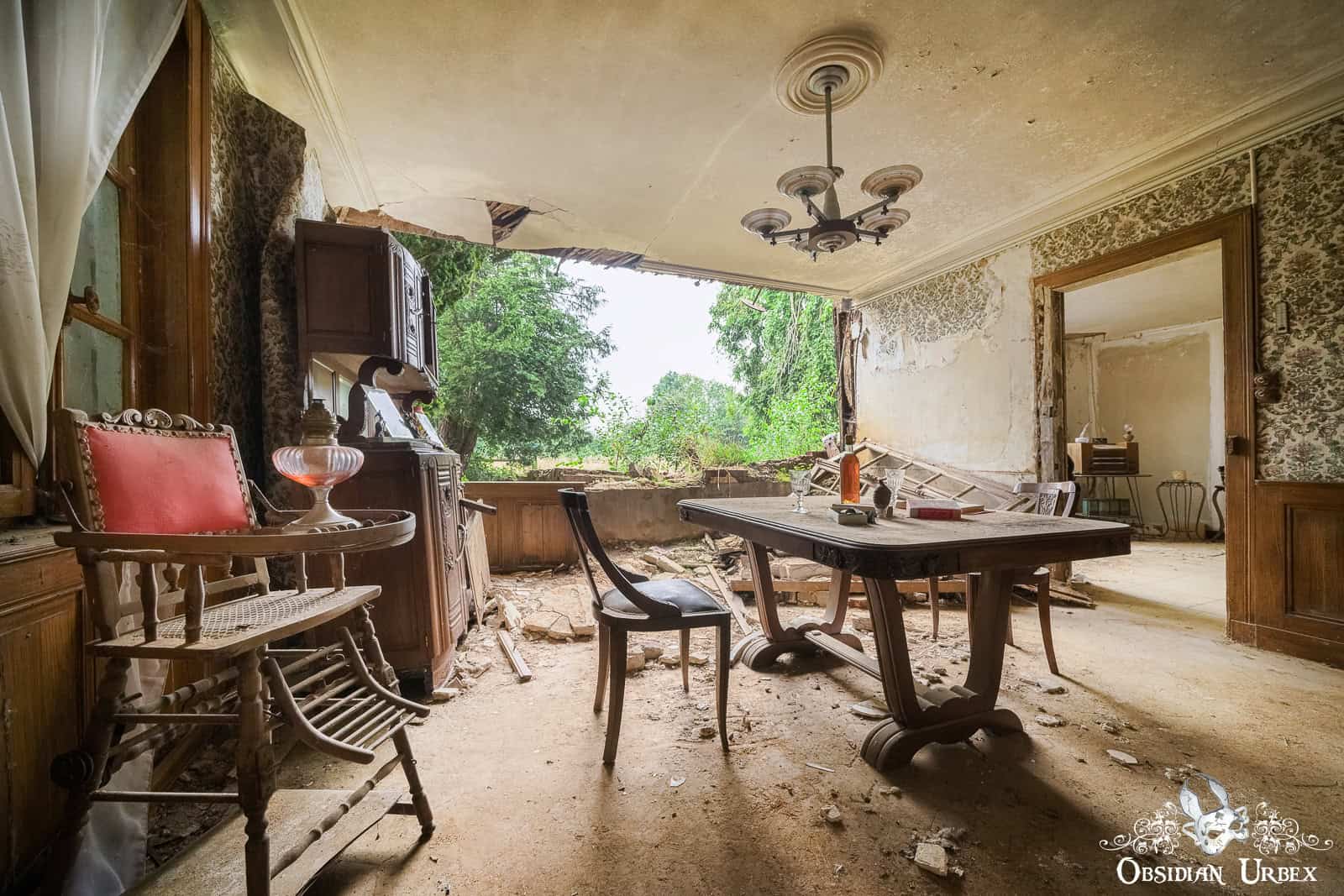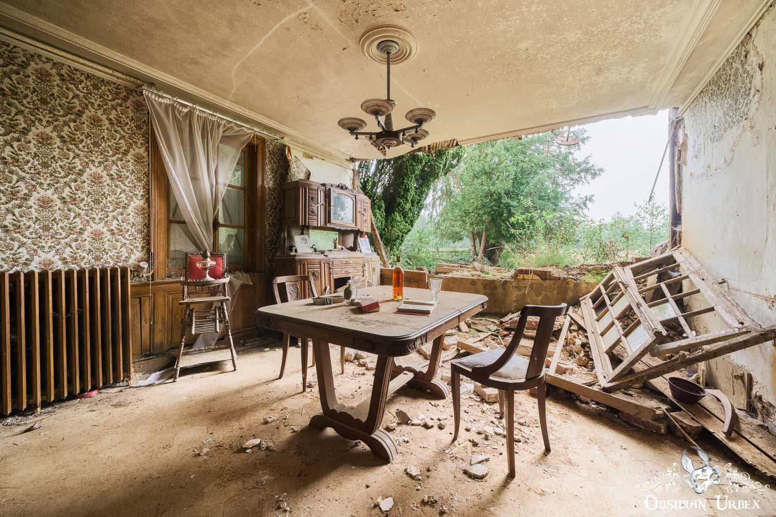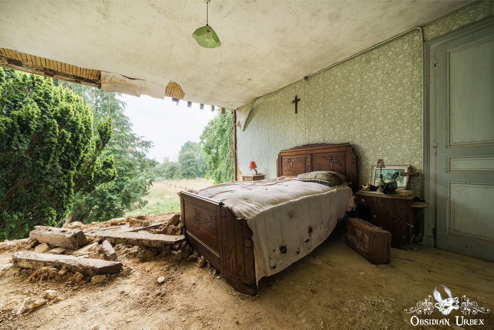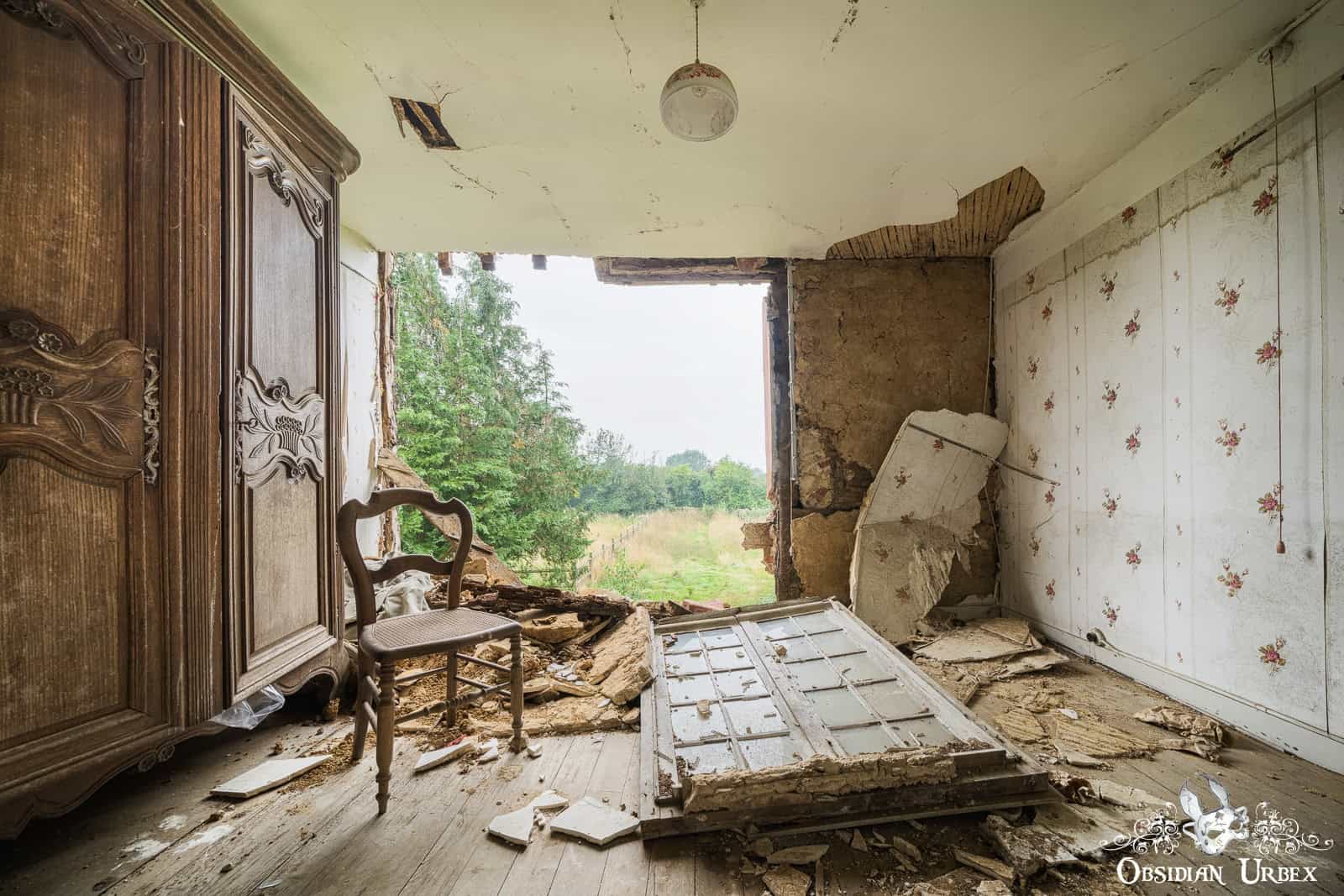 The final room, is the most beautiful (at least, to me). The entire wall has fallen away, giving a panoramic view of the green French countryside. The summers sun, filtered through some fortuitous clouds, create wonderful light and subtle shadows. The old bed has a tattered and moth-eaten sheet on it, and only a single pillow. Either side of the bed are night stands with lamps and some other belongings; a bible, a handbag, a framed picture, an ornamental horn on a plinth and a service bell. In front of one of the night stands is an old suitcase, seemingly all packed and ready to go.