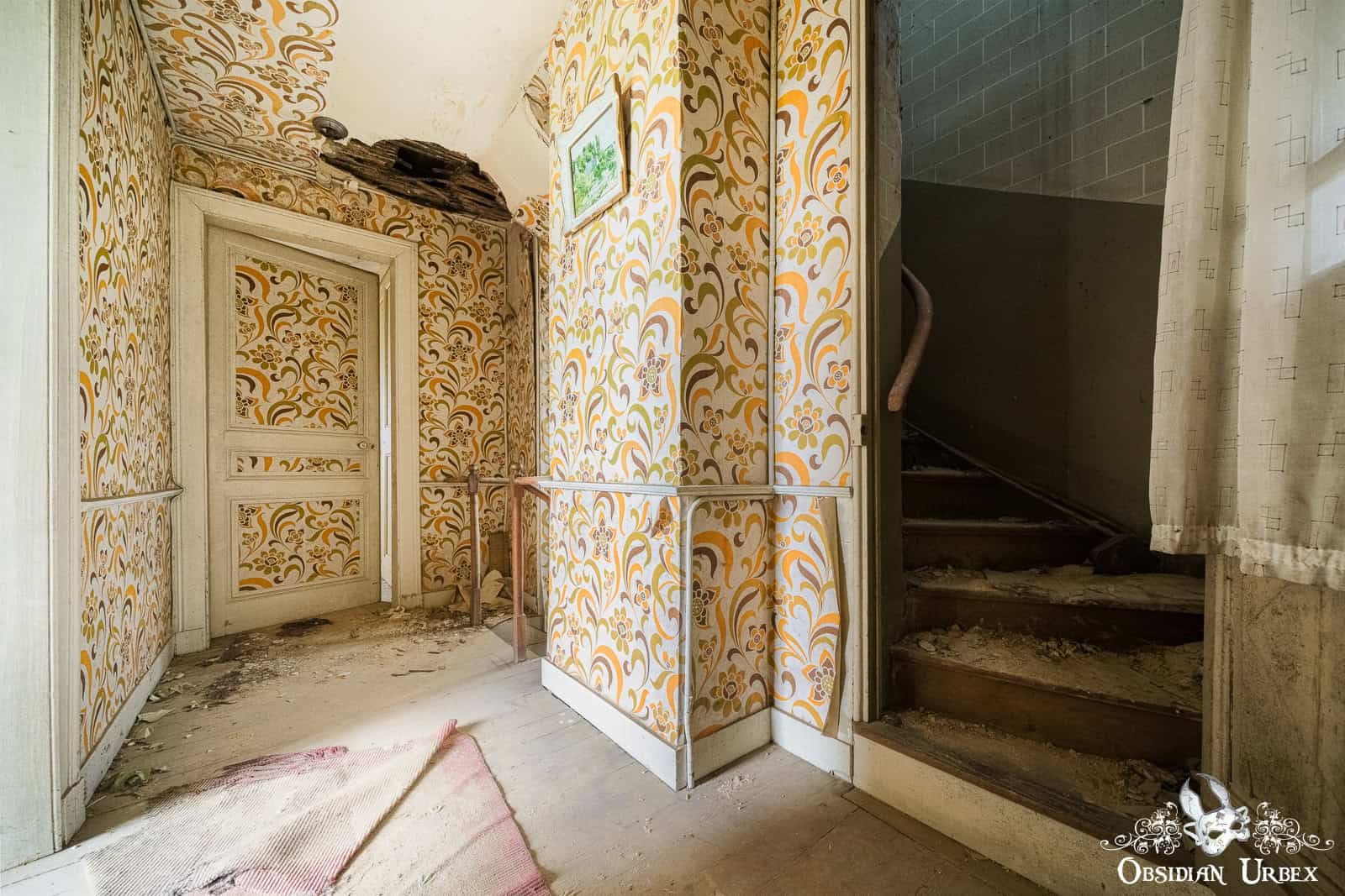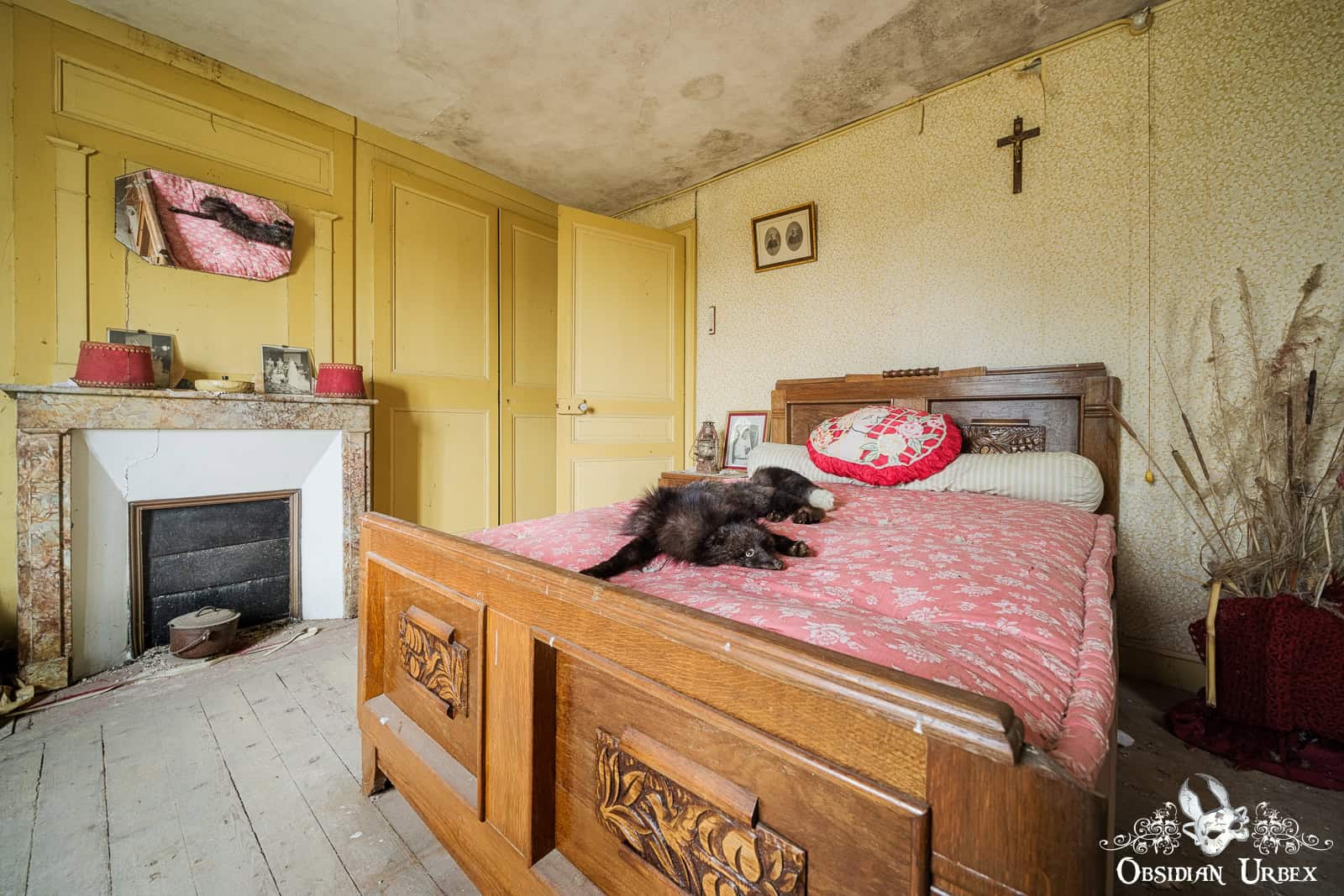 Upstairs, the corridor has some cute 1970s floral pattern wallpaper, in the traditional orange/brown/khaki colour scheme. The master bedroom exudes a charming vintage aesthetic. The pink bedding contrasts with the yellow walls, creating a colourful scene. There is a red and white patterned pillow featuring an image of a lady surrounded by roses. A small crucifix hangs above this bed, and dried plants are placed in one corner. Curiously, there’s fox fur laid out on the bed.